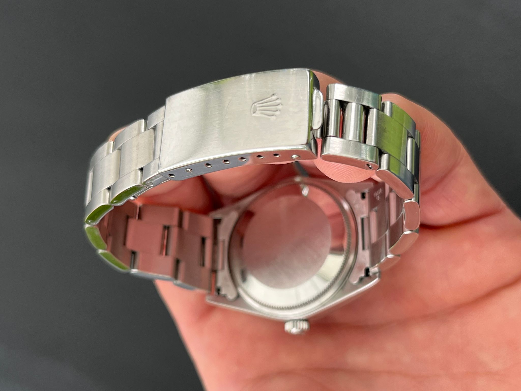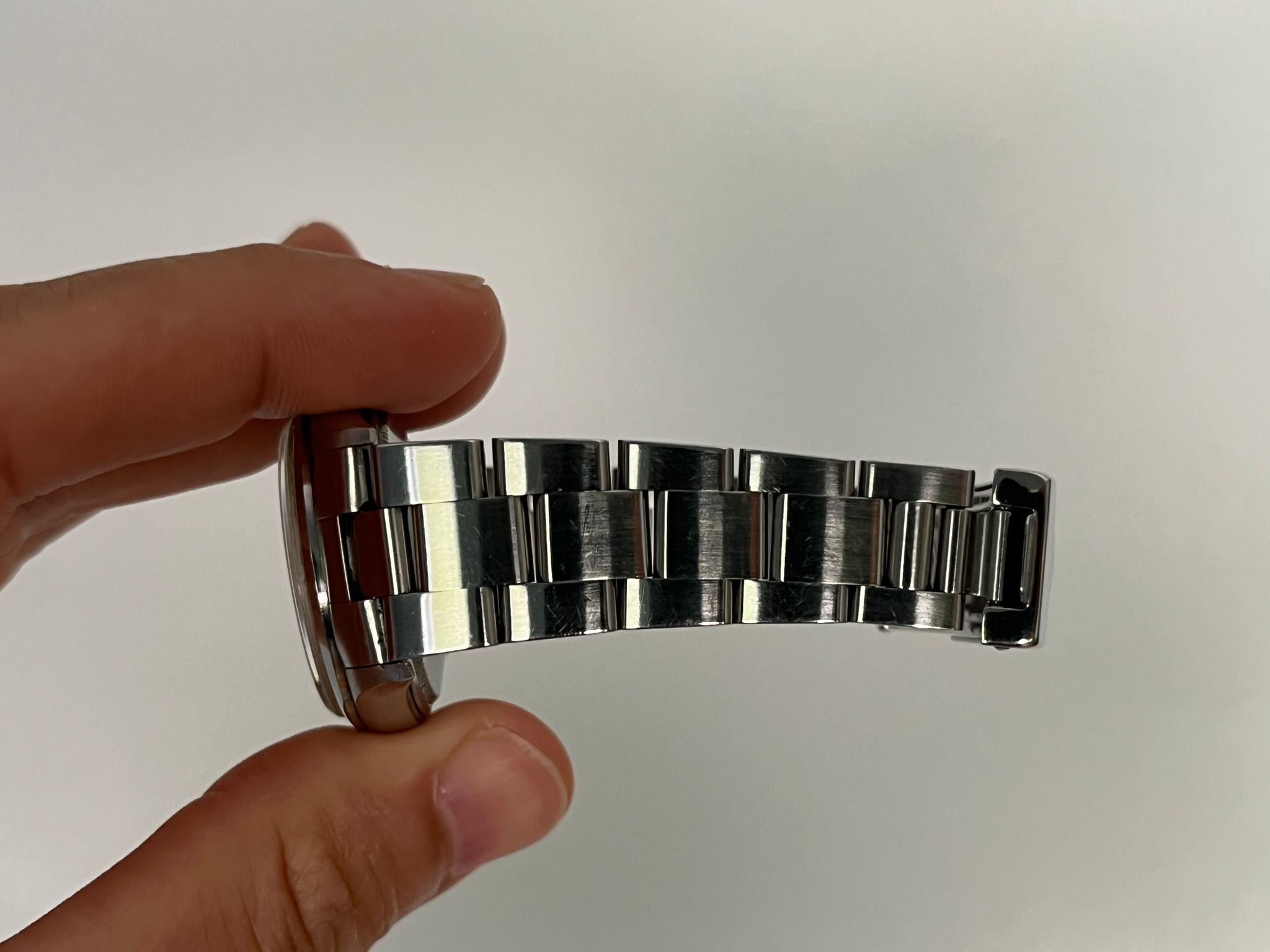 Today's example is in excellent preowned condition. The no holes case is sharp and crisp. The 3-6-9 blue dial is mint and shows no visible wear. The bracelet has 12 total links and show no stretch. A top example in its reference class.