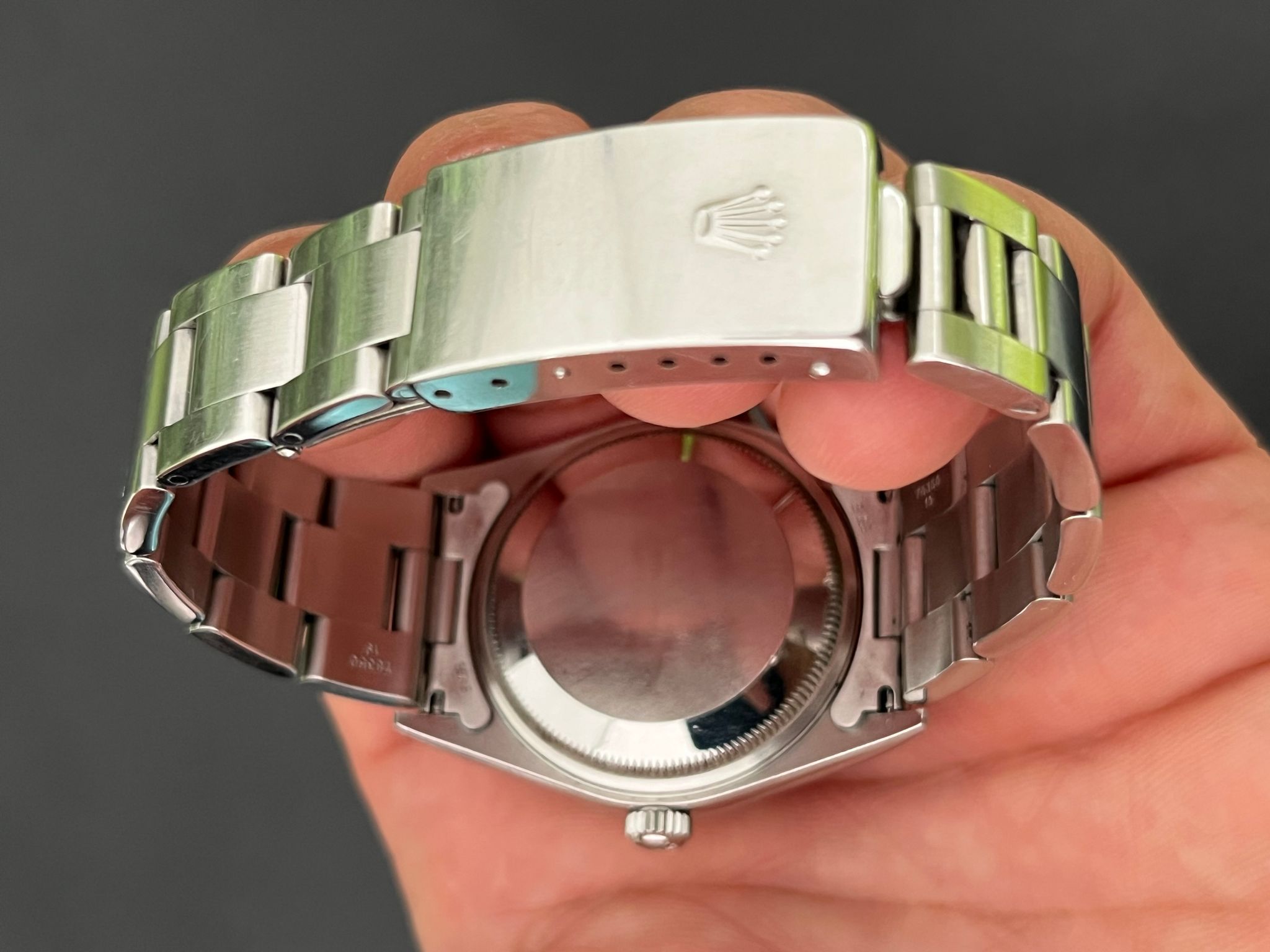 Today's example comes to us with in nice preowned condition. The no holes case is thick showing prominant lugs throughout. The Bracelet is long with 12 total links and shows no stretch. The black dial is mint showing no wear.