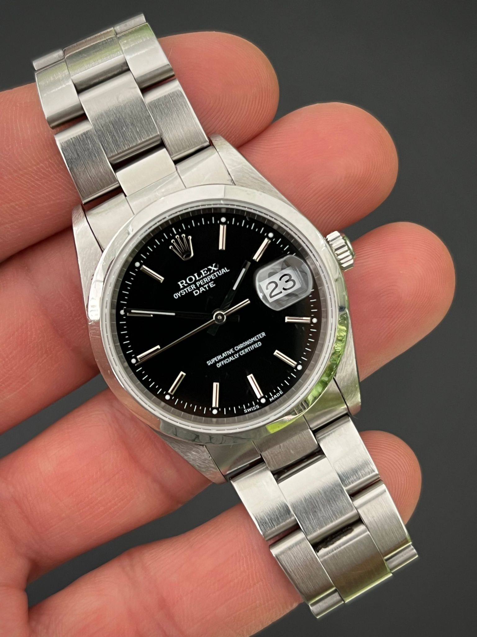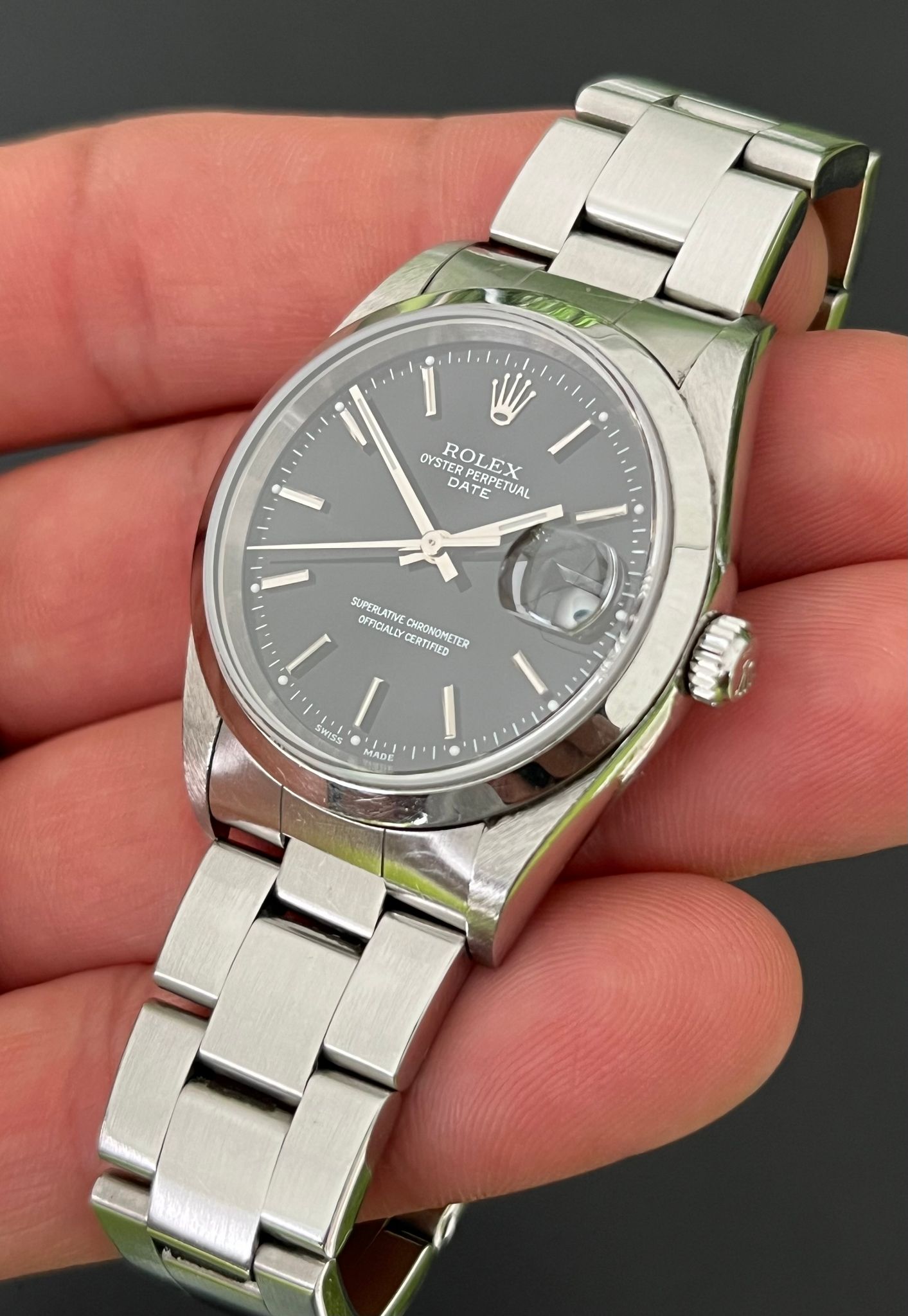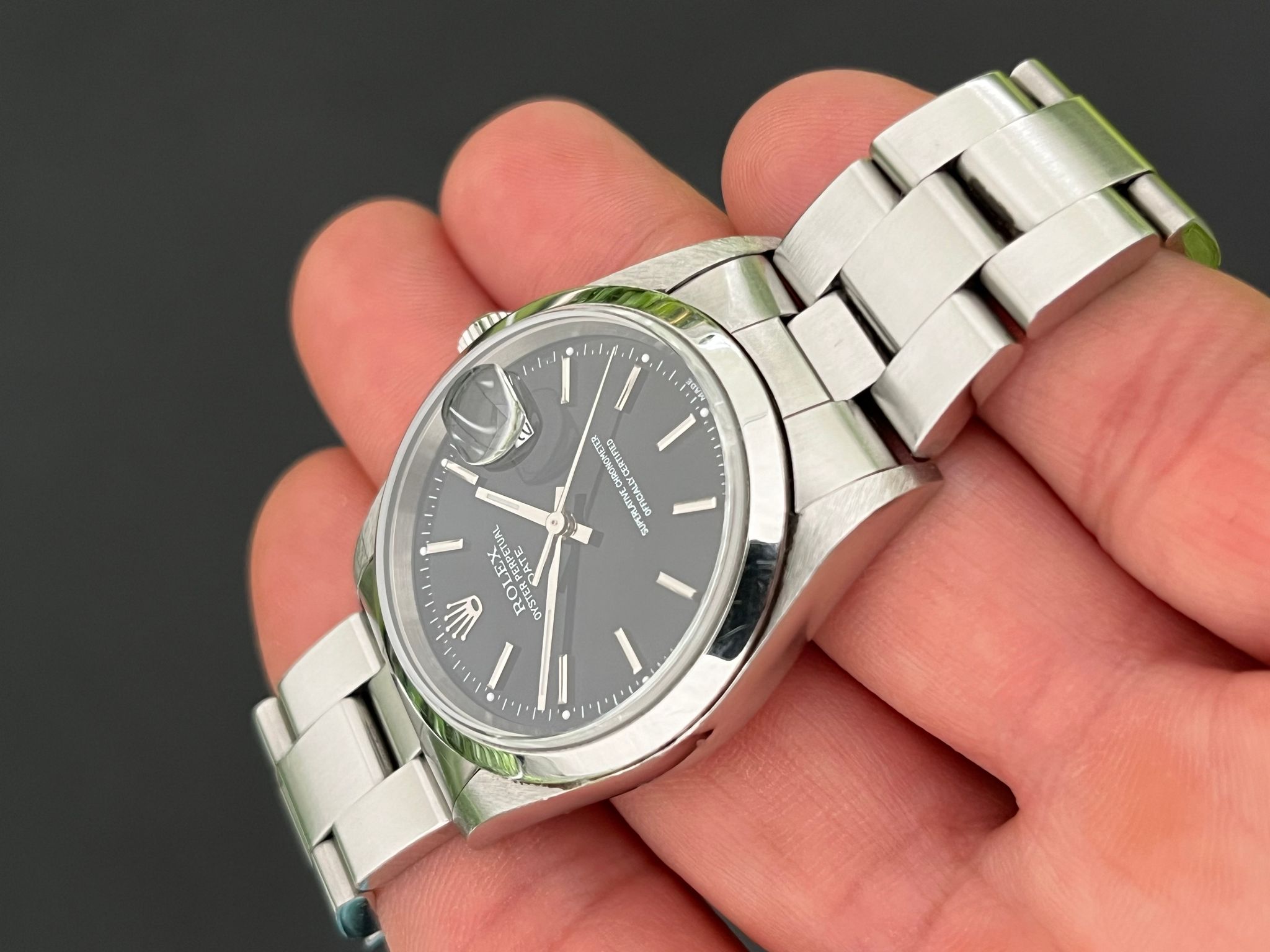 The Rolex Oyster Perpetual Date Reference 15200 with a black dial is a rare and striking timepiece that beautifully captures the essence of vintage charm and timeless Rolex design. Encased in a 34mm stainless steel Oyster case, this watch offers a perfect blend of elegance and durability. The black dial, a unique feature developed naturally over time, adds a warm, rich patina that enhances the watch's vintage appeal. Adorned with applied silver hour markers and sleek hands, the dial is both understated and captivating. Powered by the reliable Rolex Caliber 3135 automatic movement, this timepiece ensures precise timekeeping and features a date function at 3 o'clock, magnified by the iconic Cyclops lens. The watch is completed with a stainless steel Oyster bracelet, providing both comfort and a classic aesthetic. The Rolex 15200 with a black dial is a unique collector’s piece, offering a blend of rarity, elegance, and the enduring quality of Rolex craftsmanship.