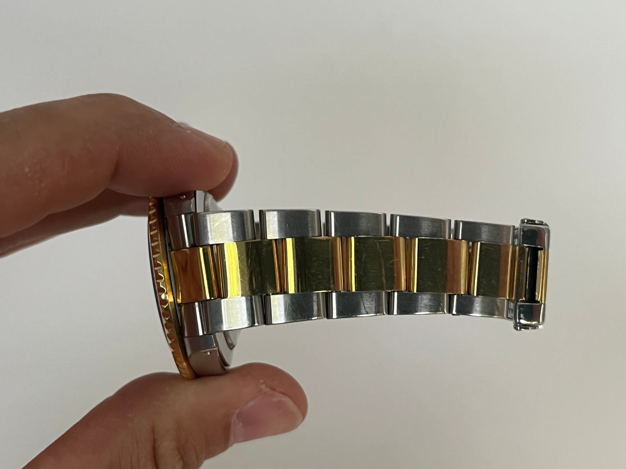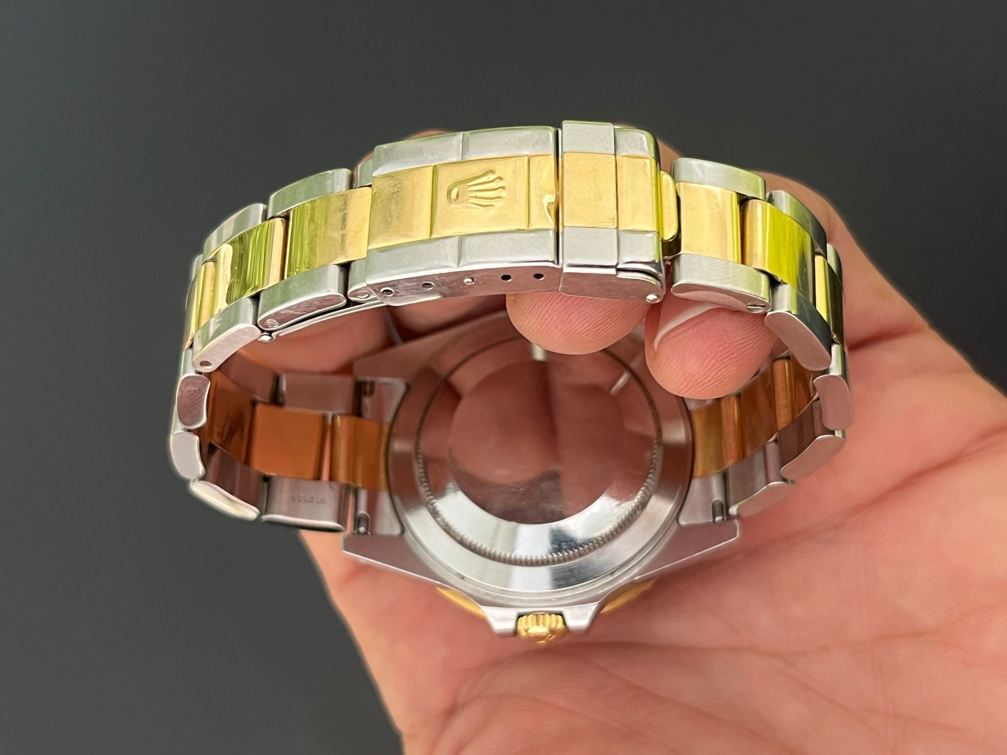 This example is in lovely condition and is accompanied by its original papers dated 2000 and has a sharp case, excellent dial and excellent insert. The 78793A solid link oyster bracelet with solid end links shows no stretch and has 11.5 total links with a gold through clasp. An overall beautiful example.