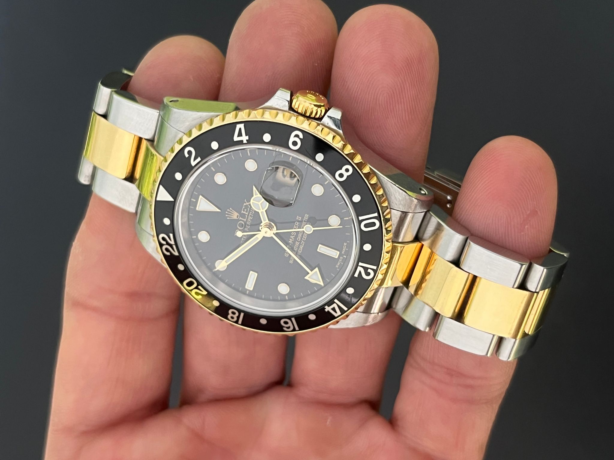 The Rolex 16713 GMT is a timeless and iconic luxury timepiece that exudes sophistication and rugged elegance. This GMT-Master II model features a rich black bezel with gold aldorned numerals. Its two-tone stainless steel and yellow gold construction not only adds a touch of opulence but also ensures durability and resilience. With its GMT function, it's not just a watch; it's a companion for globetrotters and adventurers, allowing you to track two time zones simultaneously. The Rolex 16713 is a classic choice that effortlessly combines style, precision, and functionality, making it a coveted piece for watch enthusiasts and collectors.