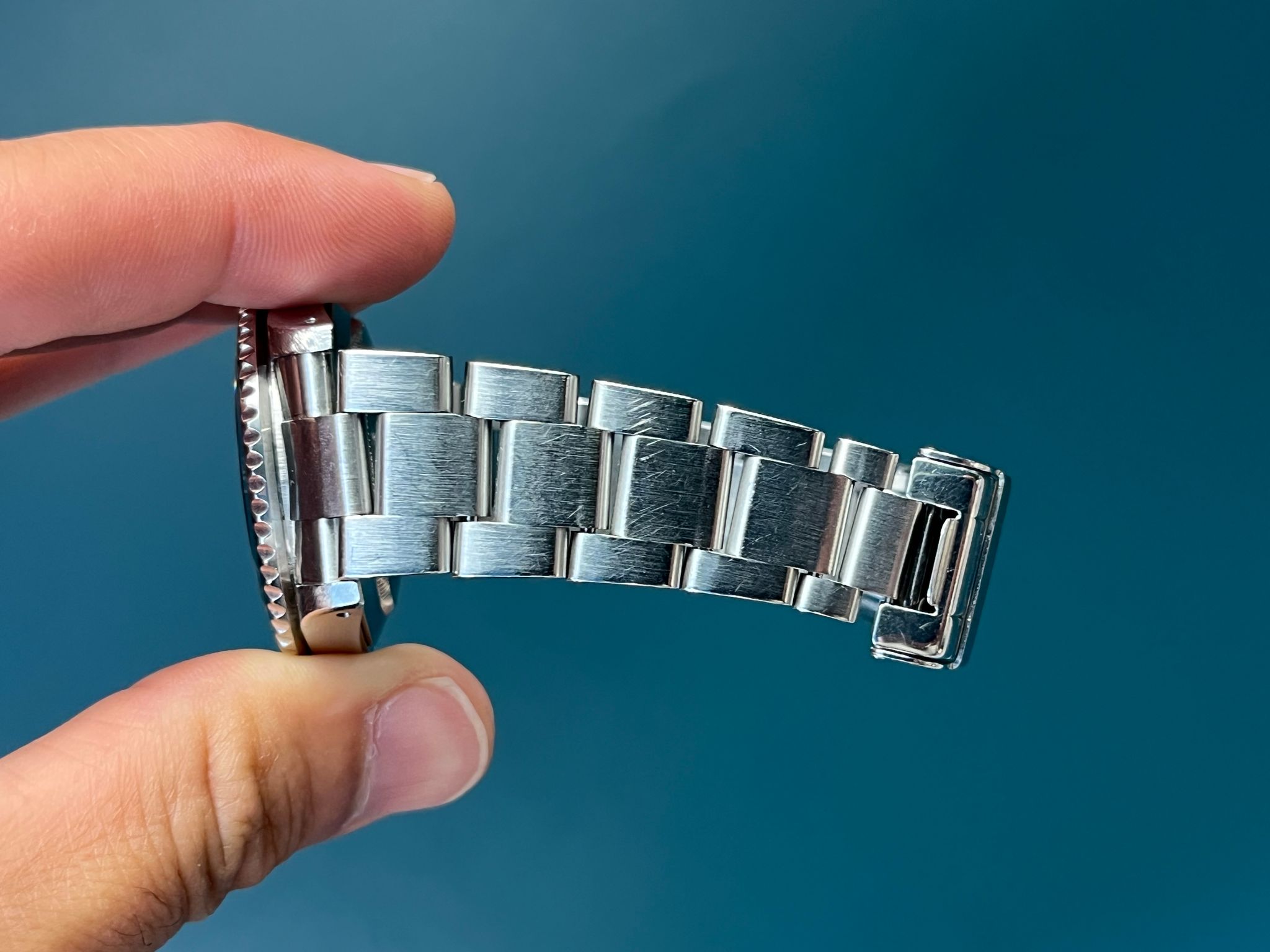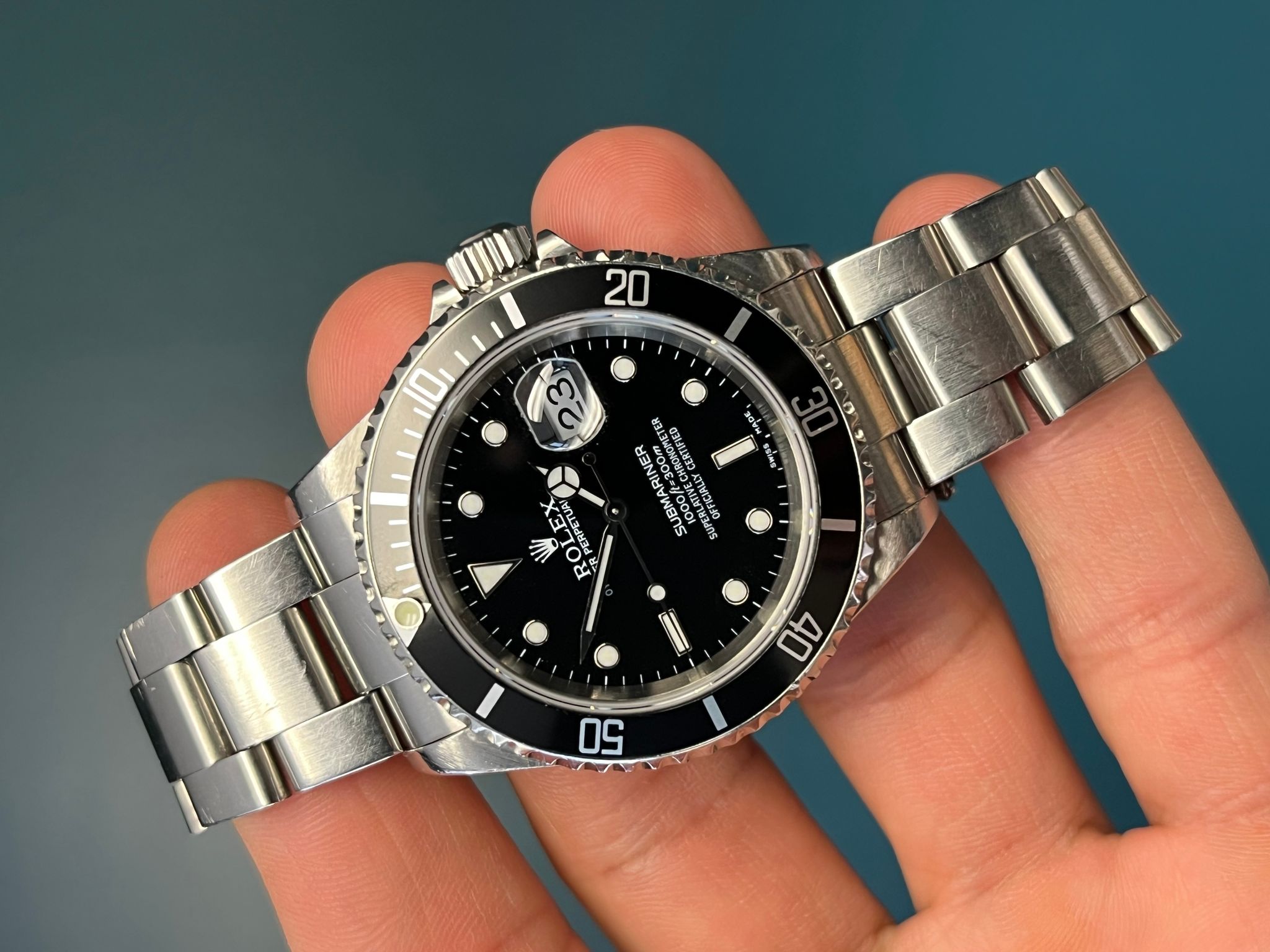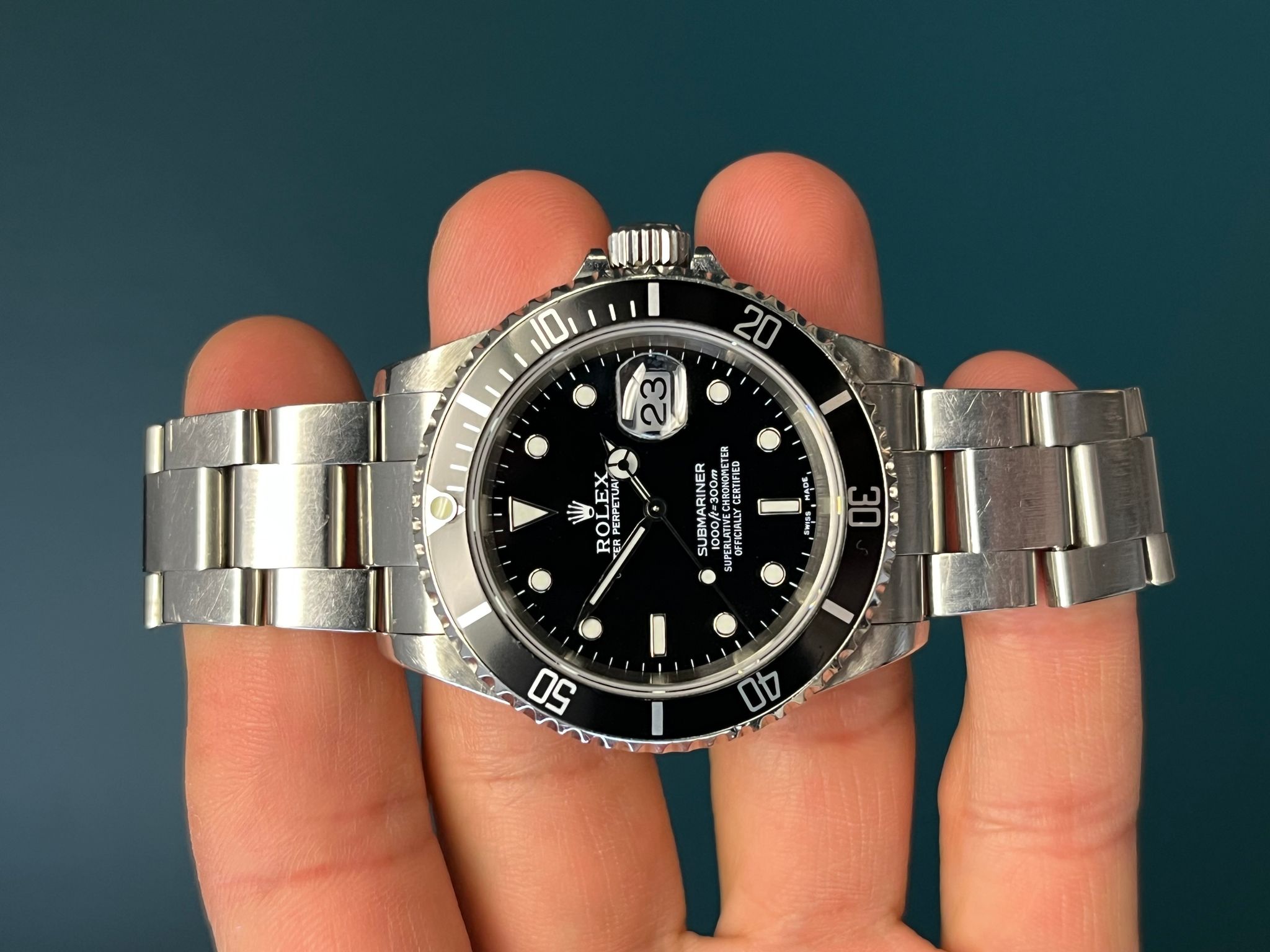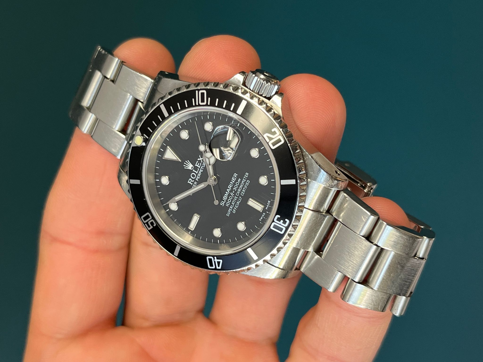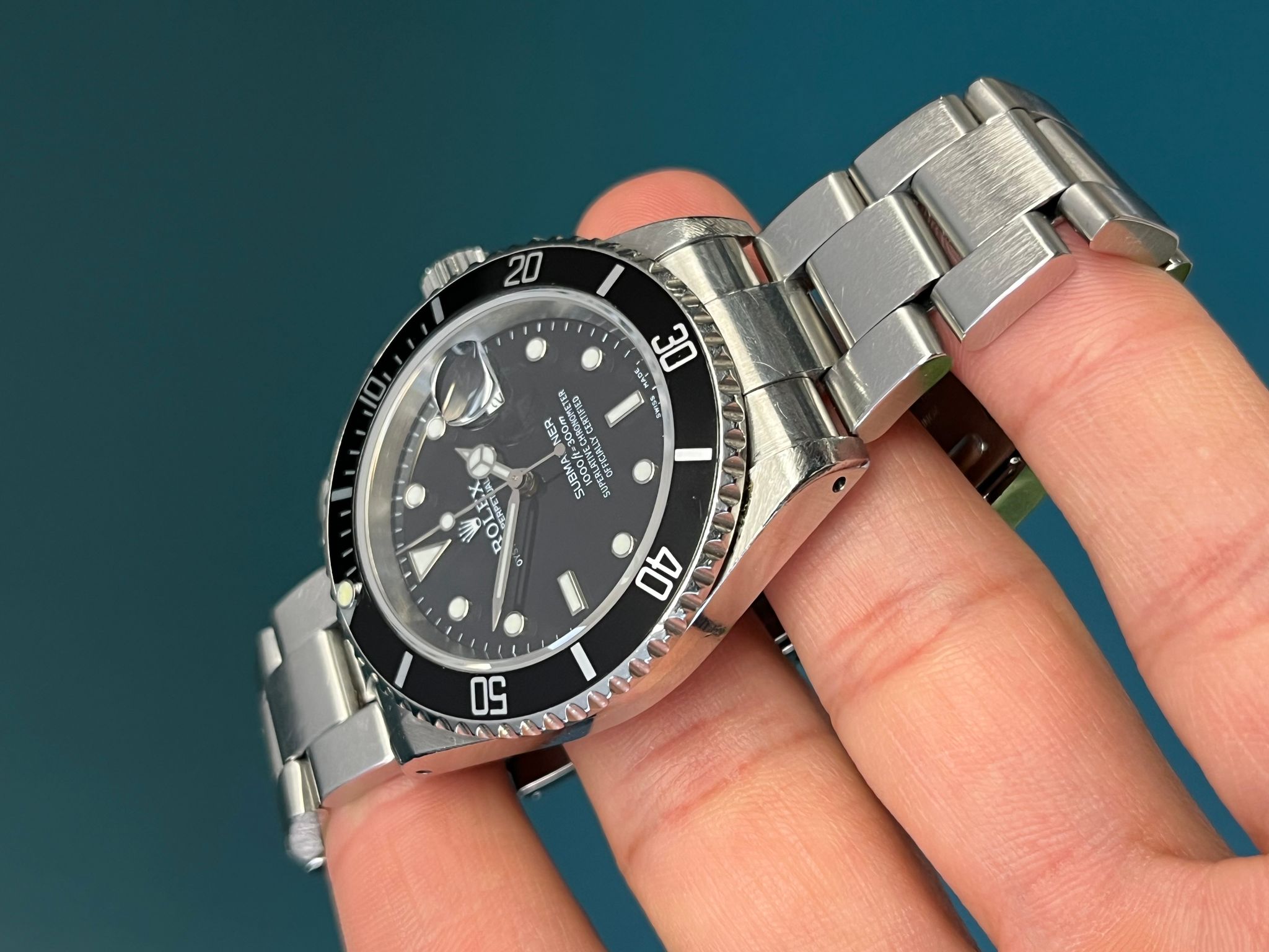 Today we bring you a pre-owned Submariner reference 16610. This example comes watch only. the case is sharp and even. The insert is a service replacement, however, will come with its original insert as well which shows very minor wear. The dial and Saphire crystal are excellent showing no visible wear. The dial and hands match. The Solid end link bracelet is fully linked and shows very minimal sstretch. This example is running COSC and keeping time.