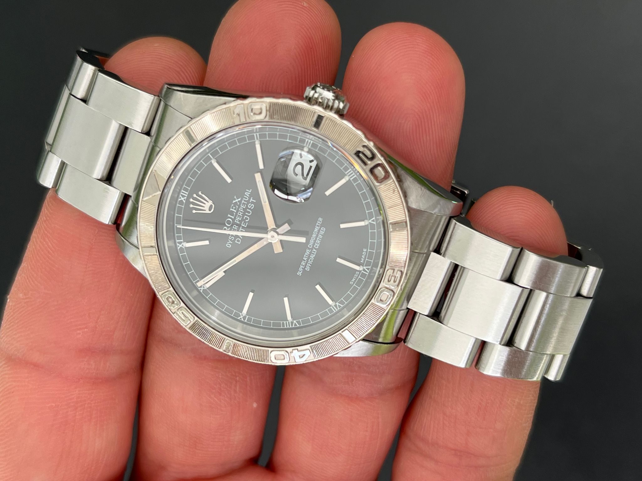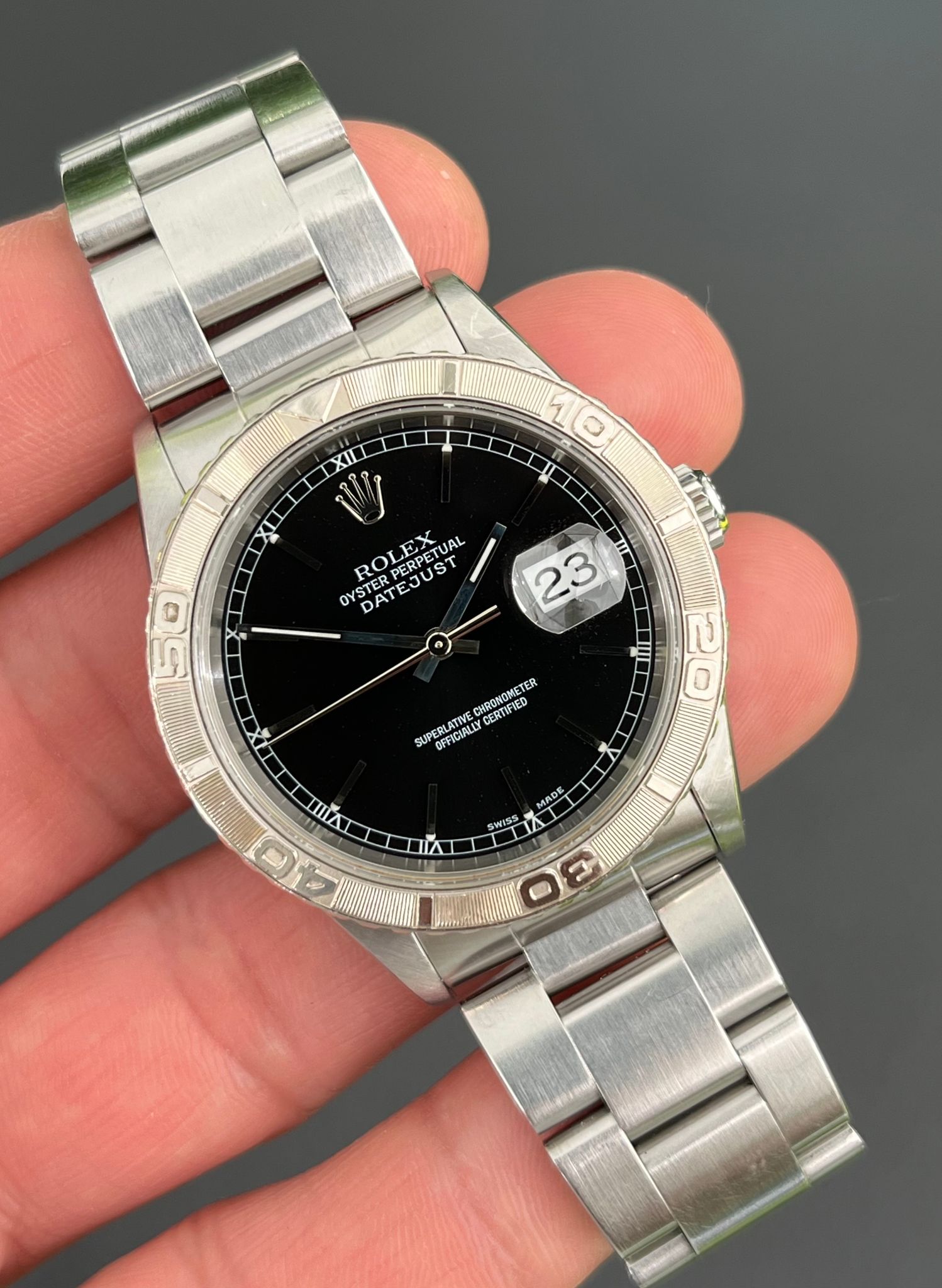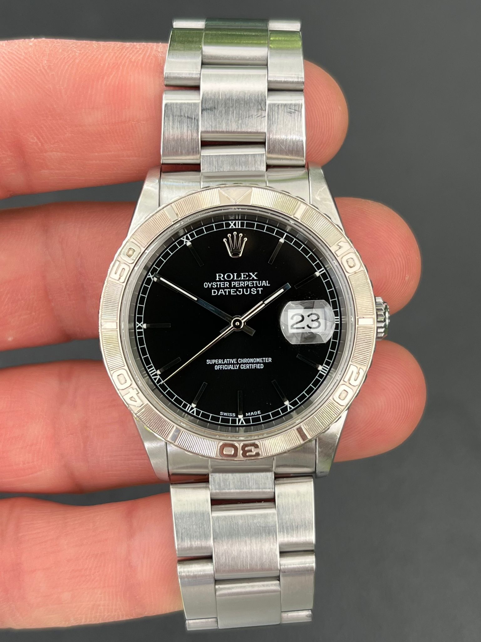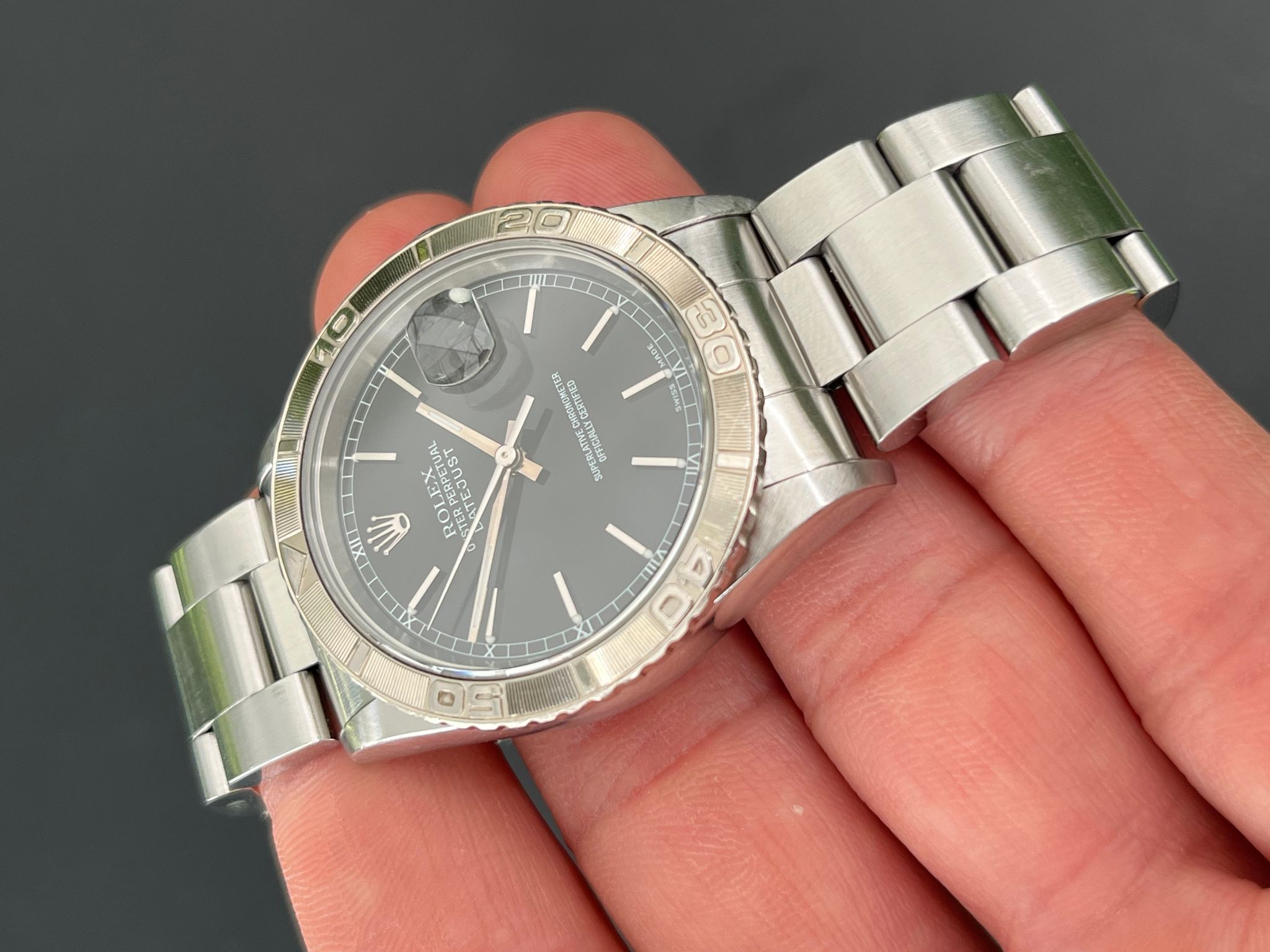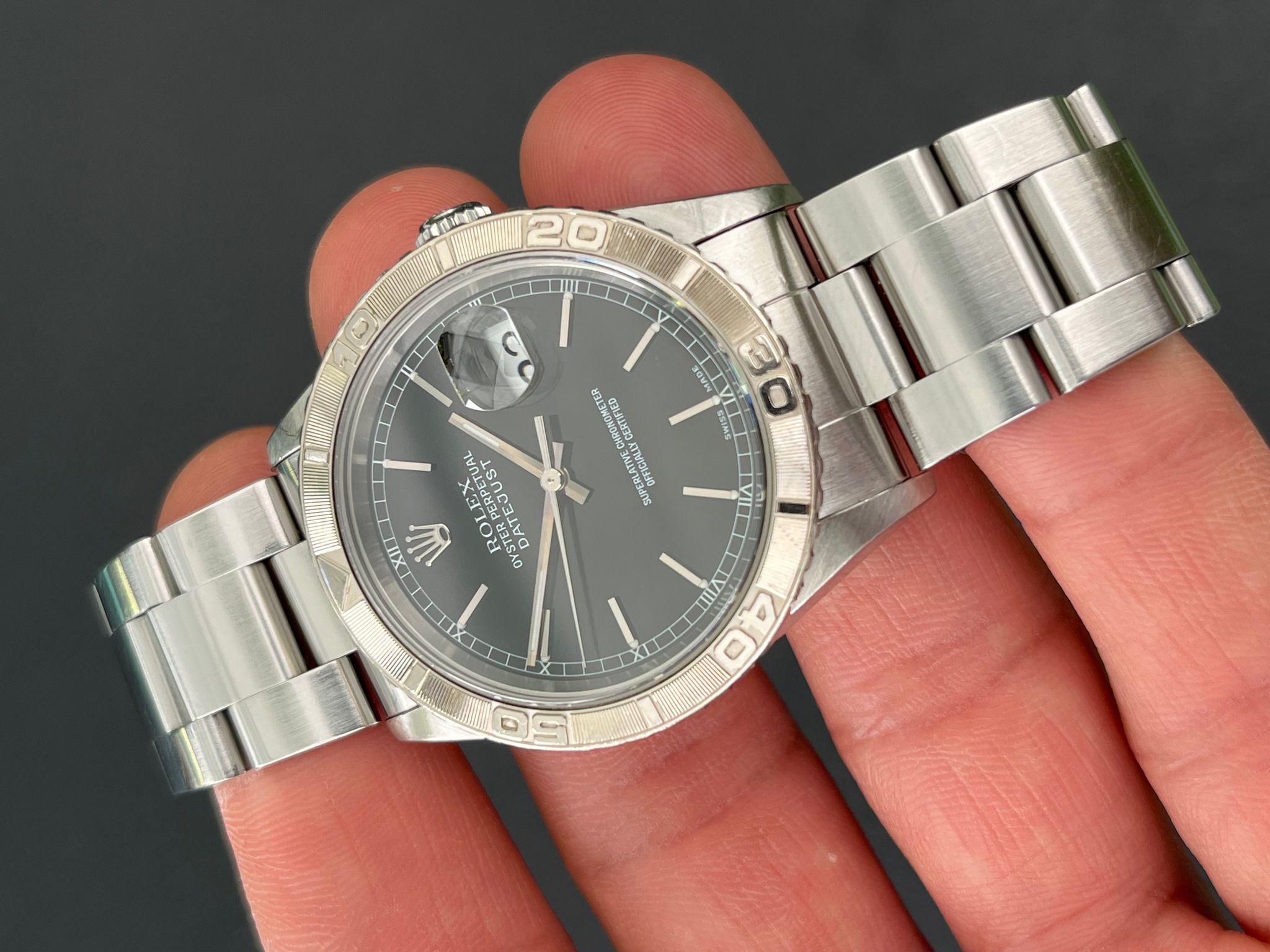 The vintage Rolex Turn-O-Graph reference 16264 is a rare and distinguished timepiece that seamlessly blends sportiness with refined elegance. Featuring an unpolished, no-holes stainless steel case, this model retains its sharp factory lines, preserving its original character and appeal. The standout feature of this watch is its engine-turned 18k white gold rotating bezel, a hallmark of the Turn-O-Graph series, adding both functionality and a touch of luxury. Complementing this is a striking black dial with luminous hour markers and hands, ensuring excellent legibility while exuding a sleek, understated aesthetic.