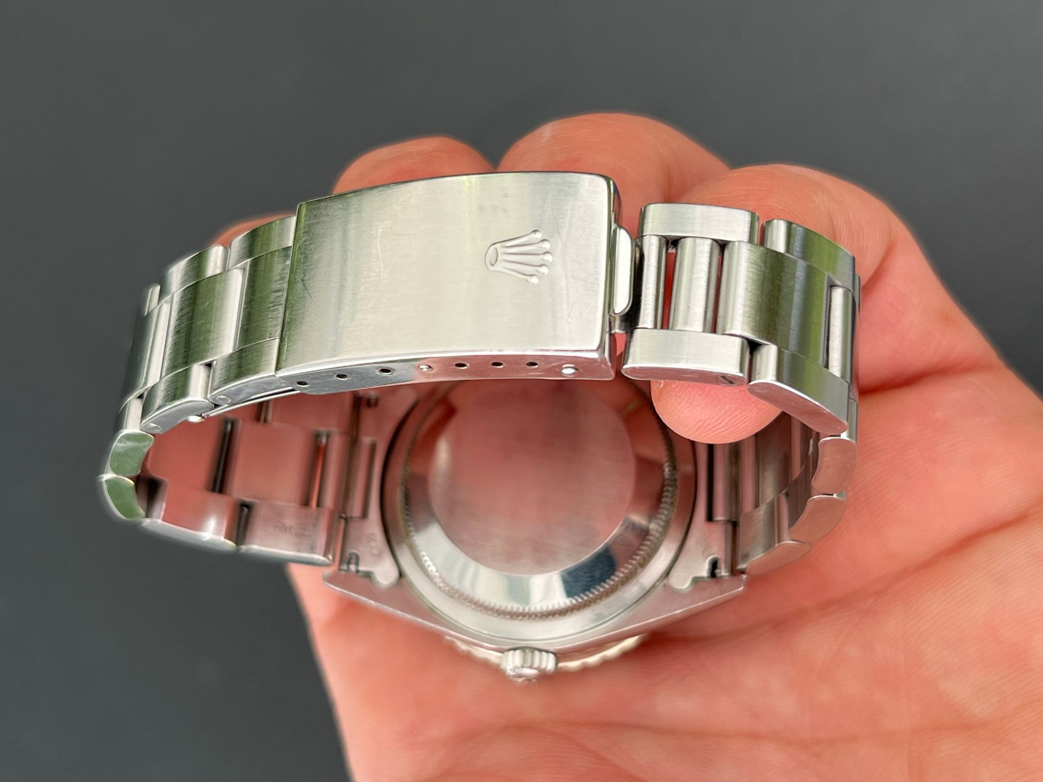 Todays example comes to us in excellent unpolished condition. The no holes case is razor sharp. The white gold bezel is in excellent condition. The black roman track dial is mint with no wear. Bracelet has 12 total links and shows no stretch.