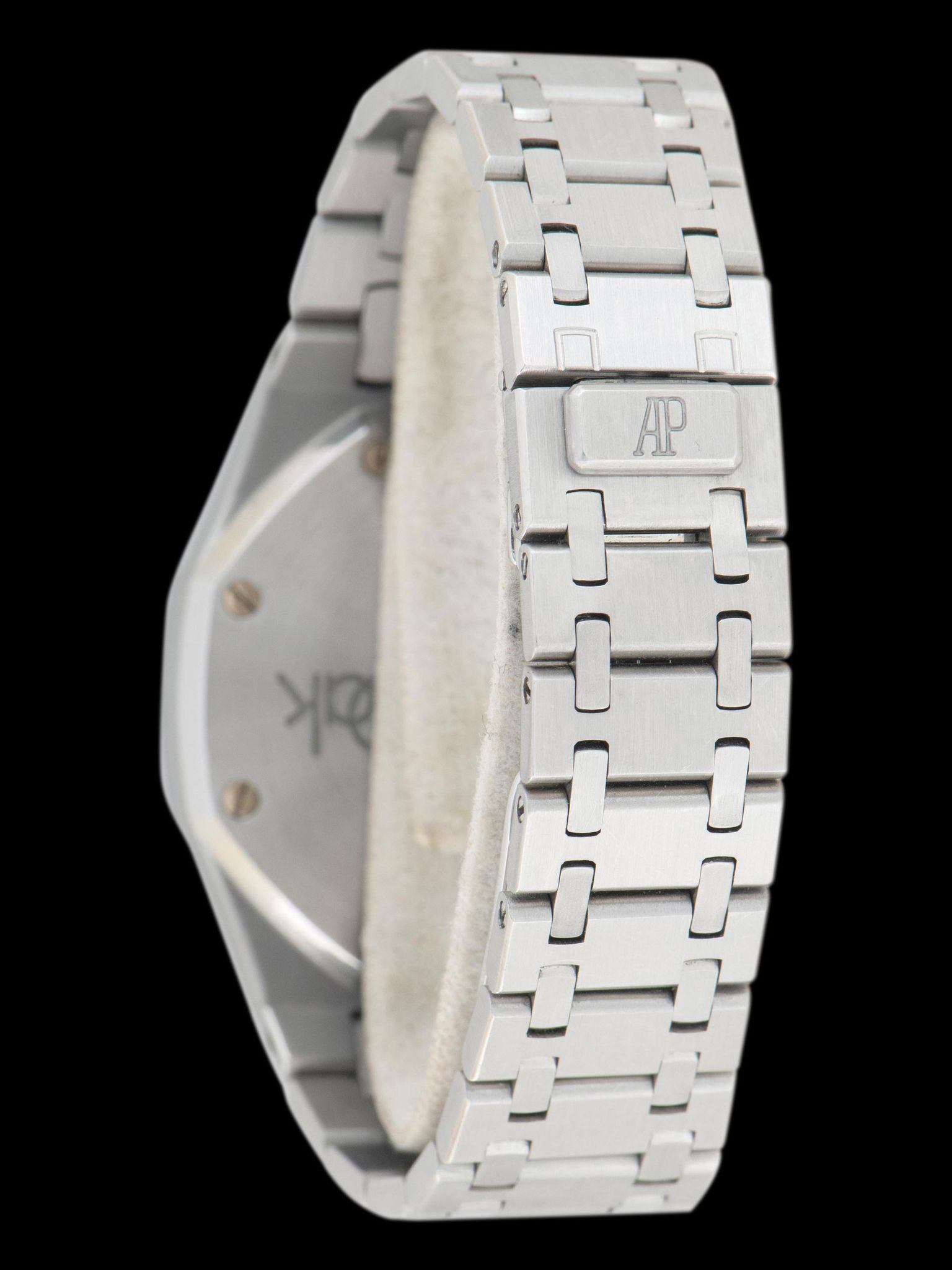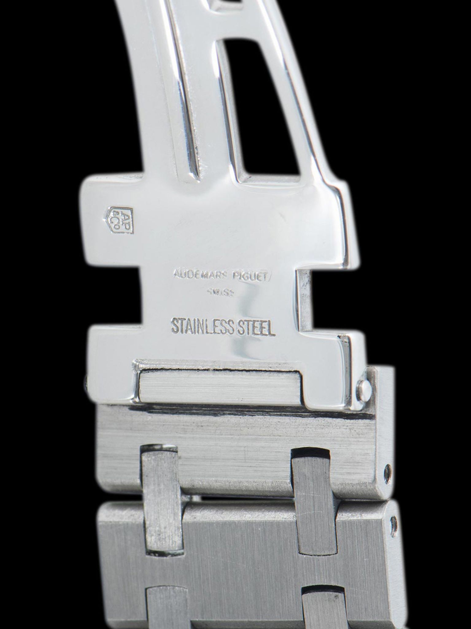 The excellent case exhibits nominal signs of previous use and minimal evidence of previous polishing, showcasing crisp and symmetrical edges and finishing throughout. The bezel also remains crisply finished, retaining all of its iconic angles around its circumference with only gentle signs of use present. The case back retains all of its factory engravings and markings, along with its classic concentric brushed finish. The integrated Audemars Piguet bracelet retains its continued chamfers from the case through the links and retains 18 links that show nominal stretch and will fit up to a 6 1/2-inch wrist.