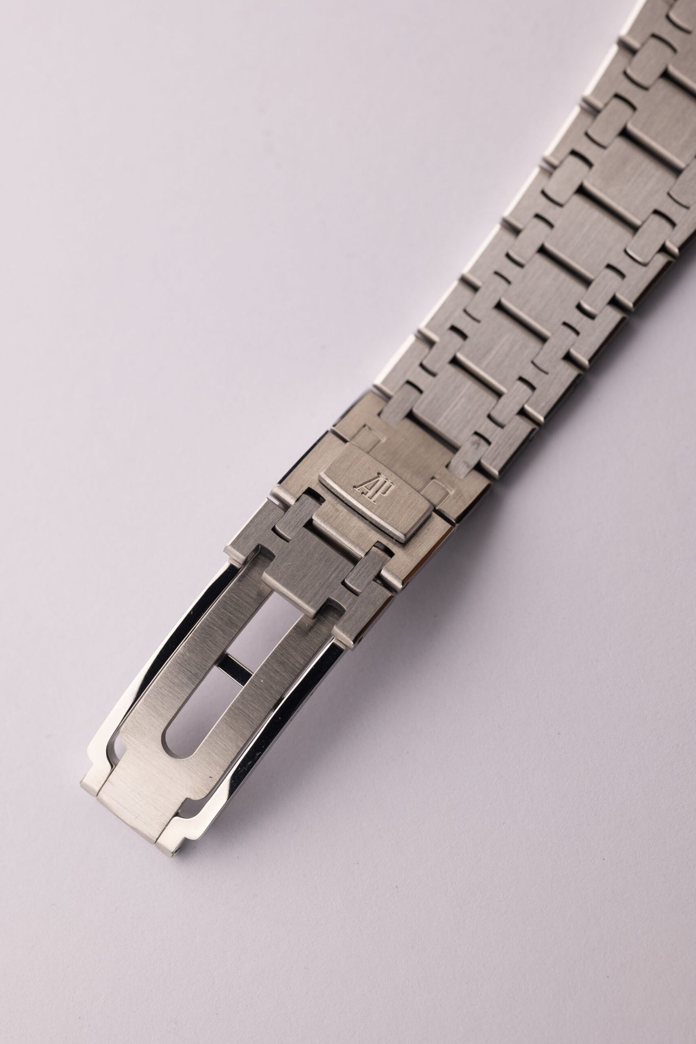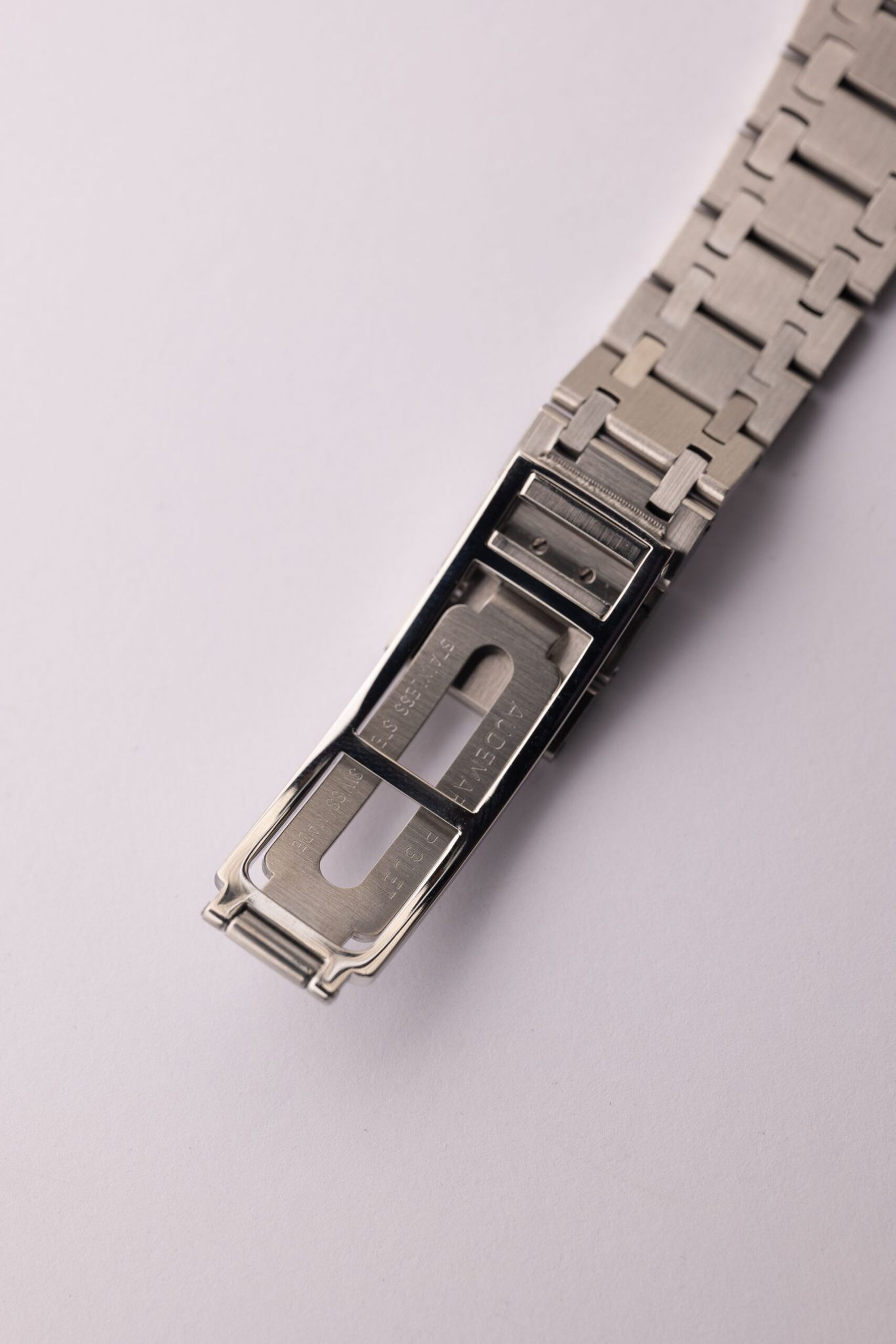Our example has been masterfully polished, a brush and finish that leaves the white gold screws undisturbed, whose bright chamfer descends evenly into the caseflank. As the beveling continues onto the integrated bracelet, the taper between each link retains a smooth and undisturbed factory feel. The once almost-matcha lume of the indices and hands has churned into soft creme.