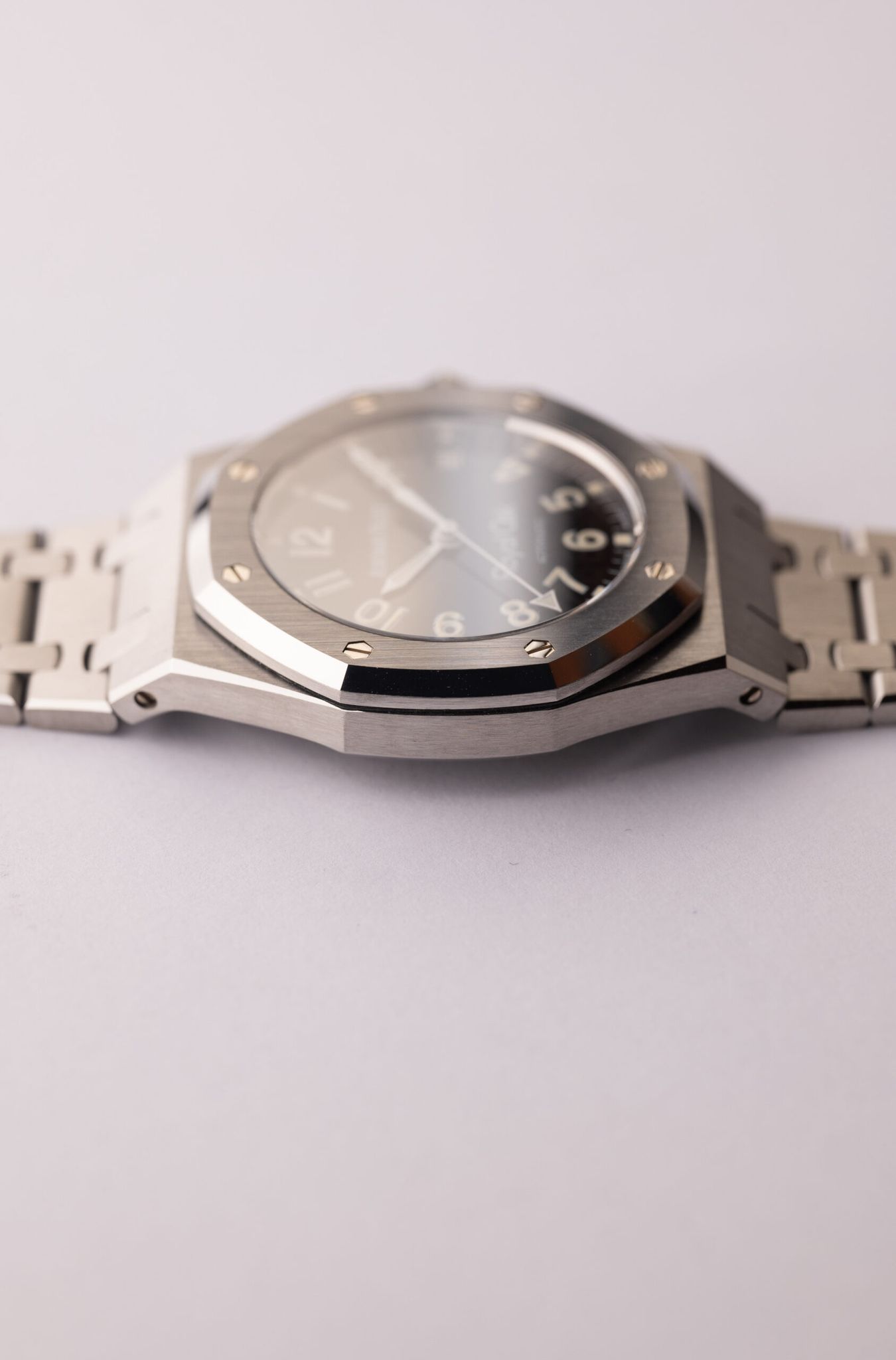 The Military Dial equipped 14790 is equally rare and rich as it is utility-rated. Radially displayed burgeoning arabic characters are positioned outbound on the matte black dial, broadsword hands and heavily cantilevered seconds arrow sweep the face, while a potent luminova powers the indices. This famed utility is animated by AP’s Cal. 2225, an automatic movement hoisted within a 36mm by 8.1mm frame.