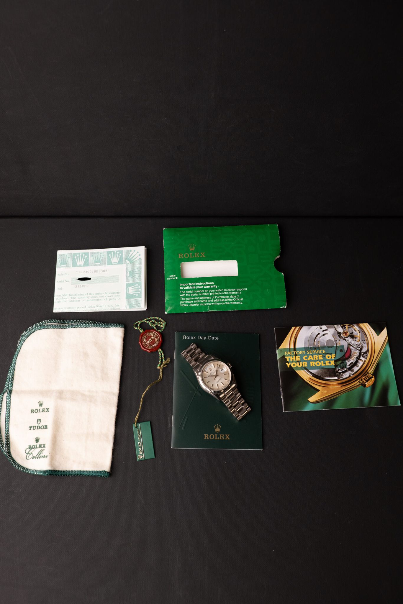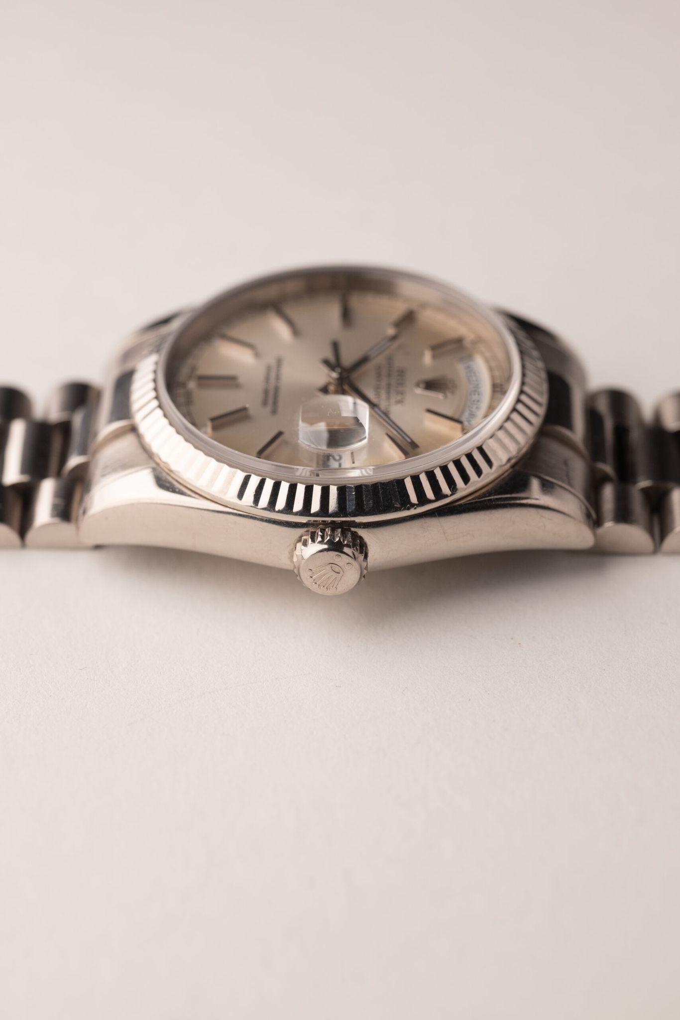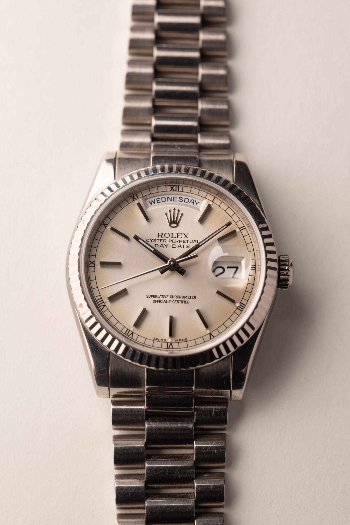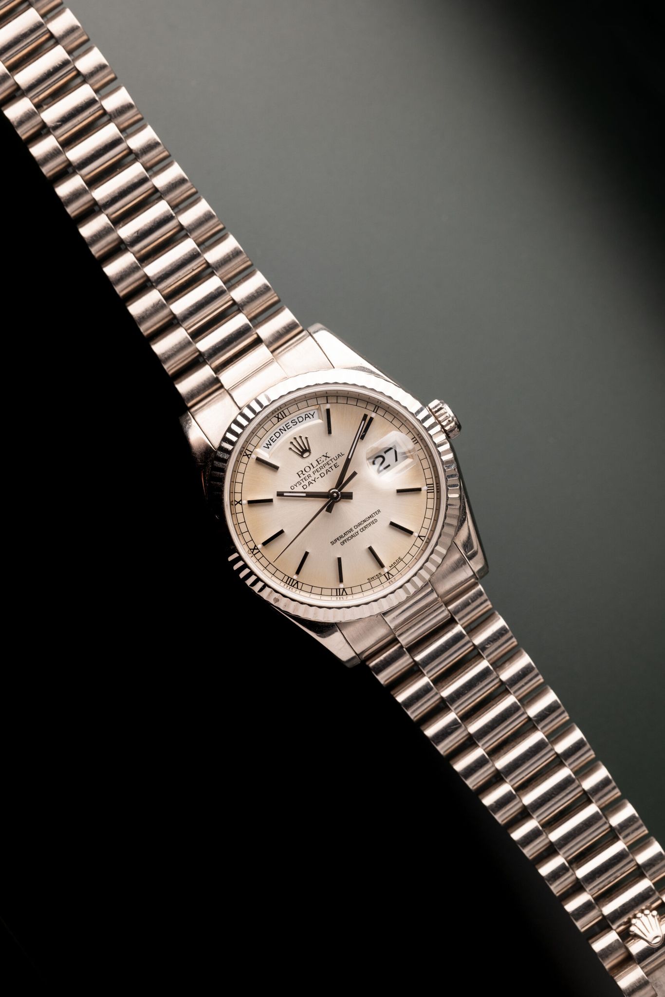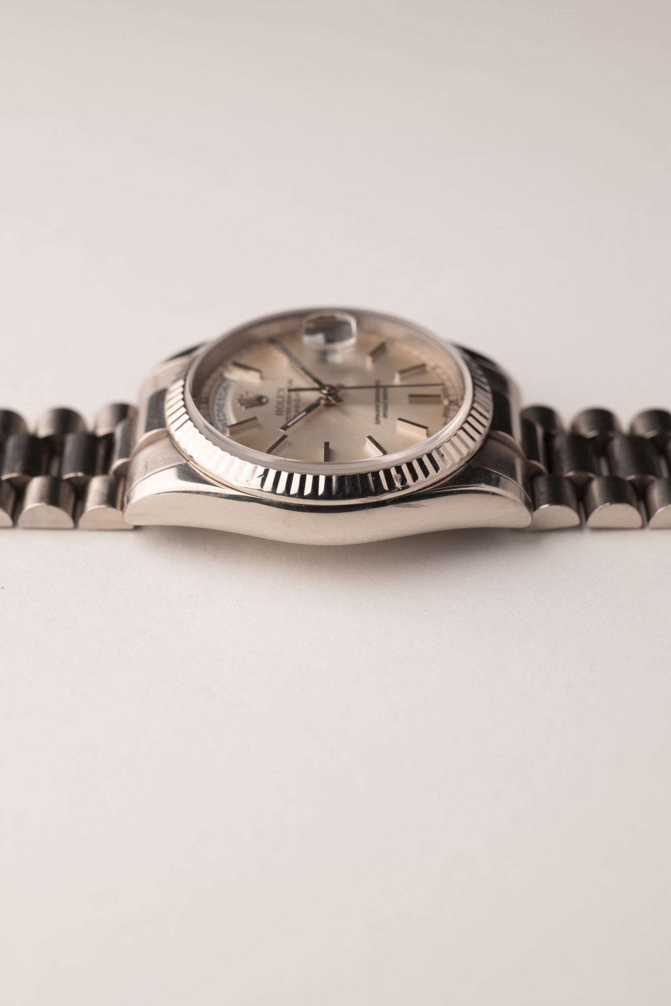 Excellent classic Silver dial Day-Date with a creamy pre-tropical yellowish cream orbiting near the watch’s rehaut.