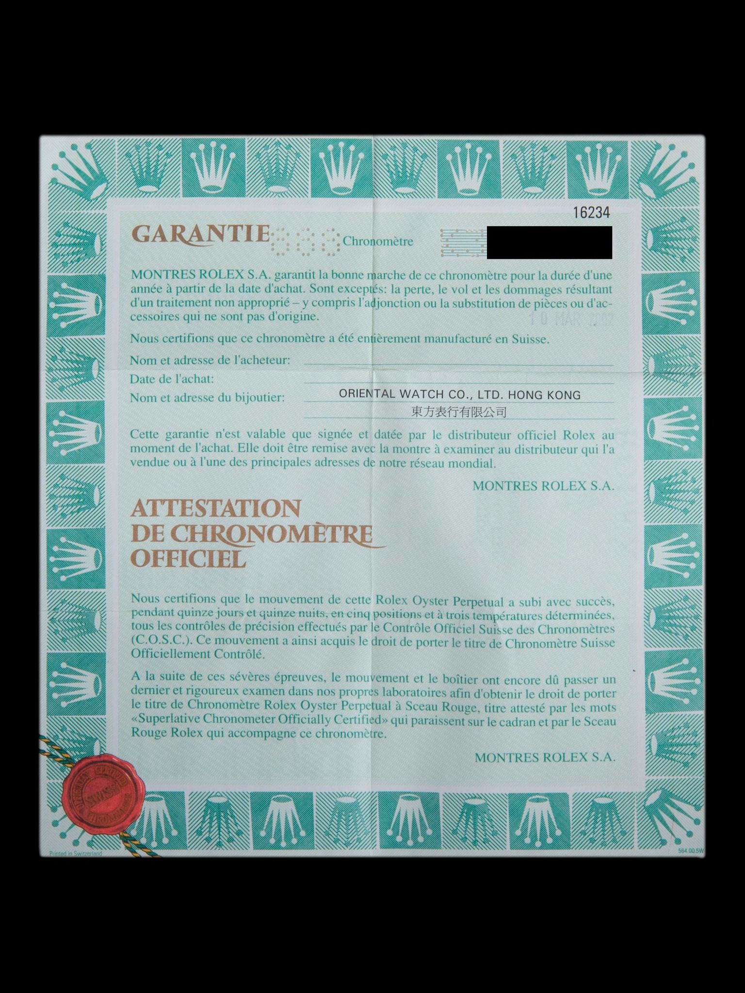 The watch comes complete with its original inner and outer boxes, Rolex guarantee paper, serialized hang tag, chronometer seal hangtag, booklet, and two additional links.