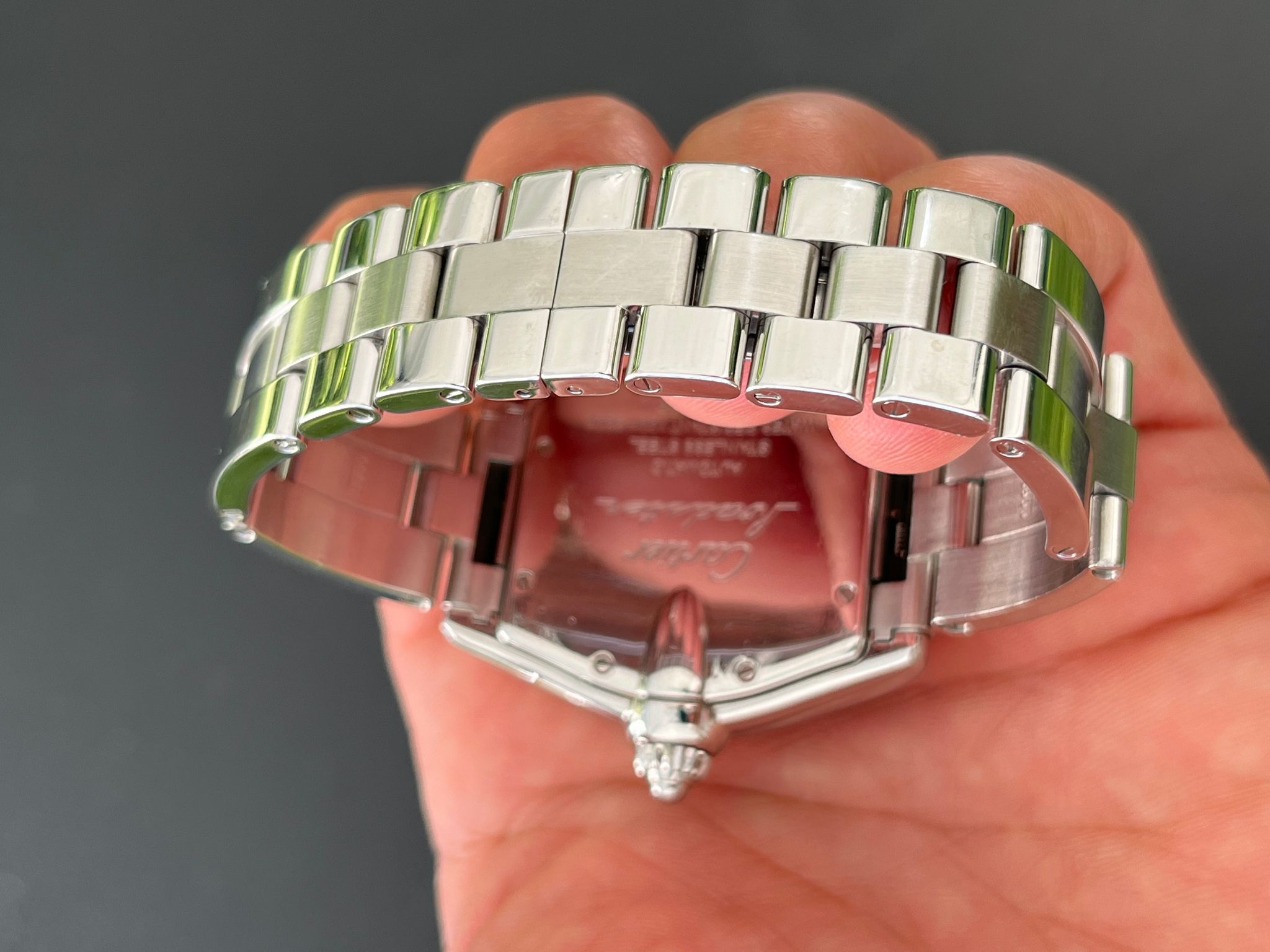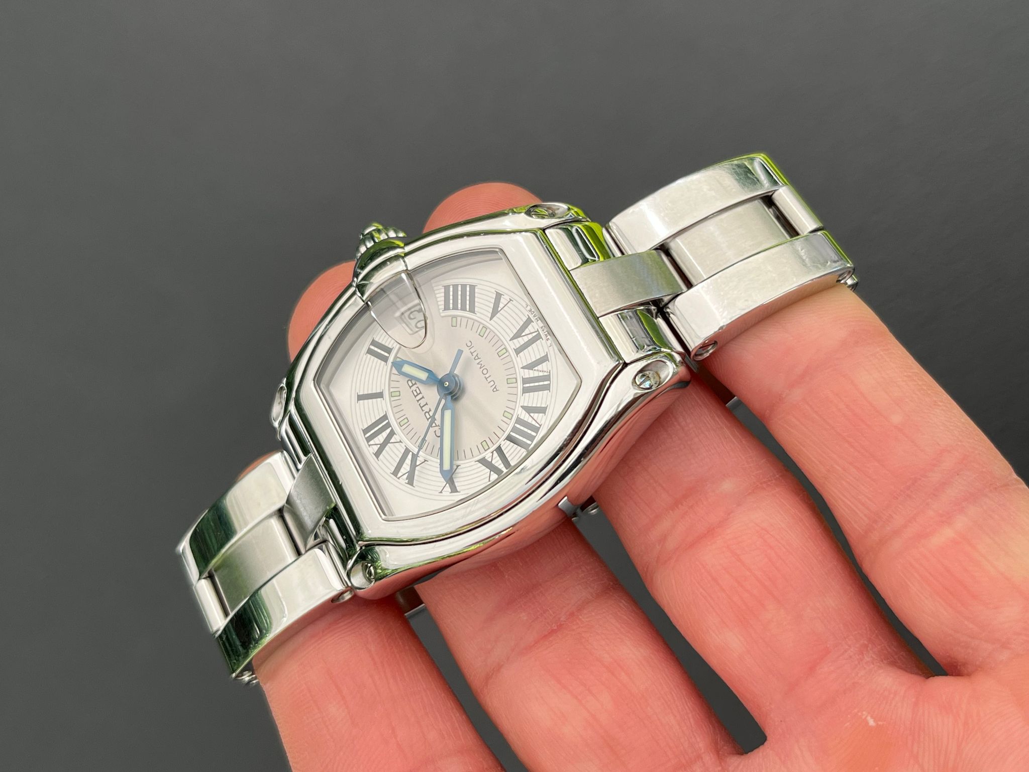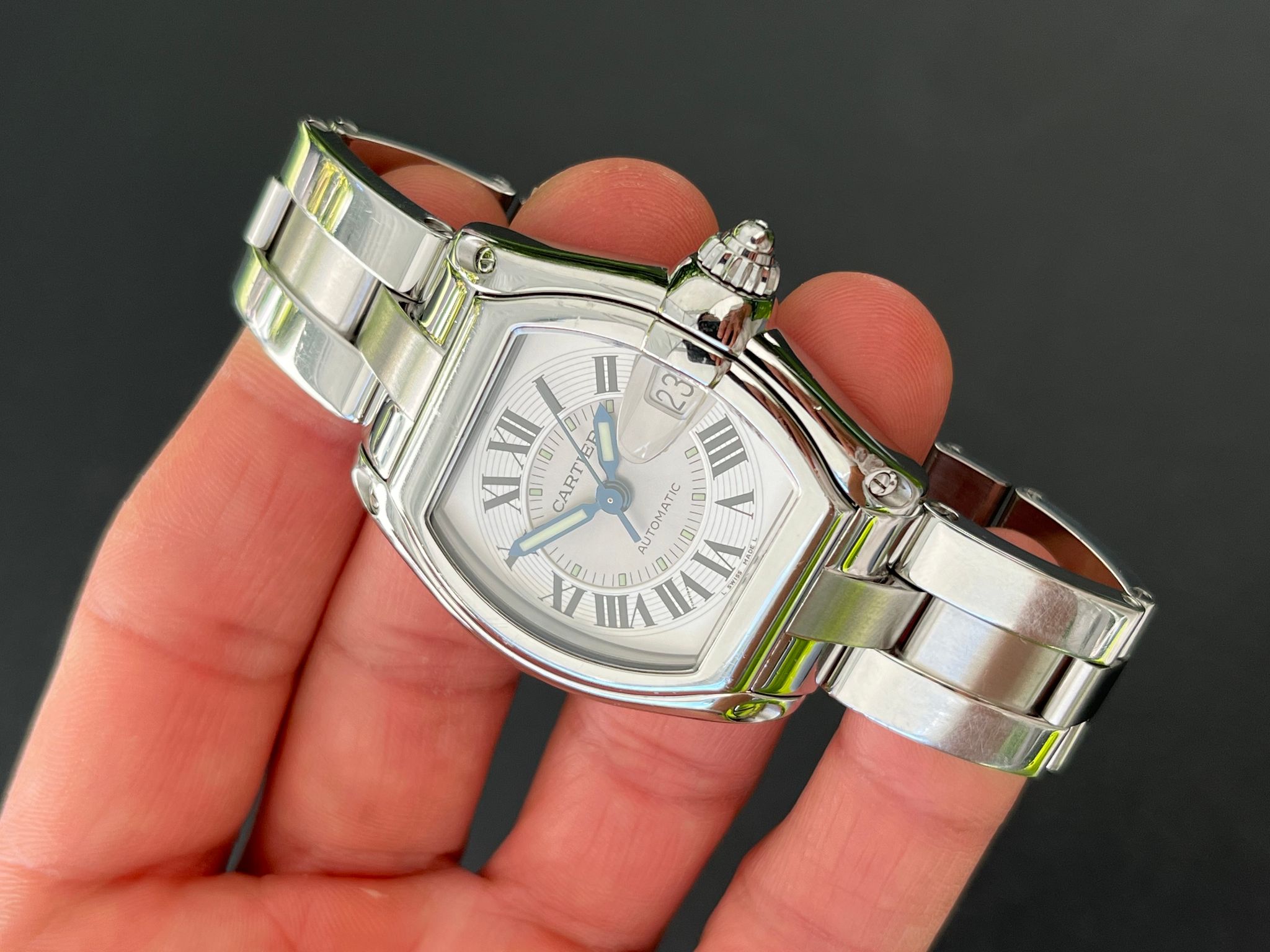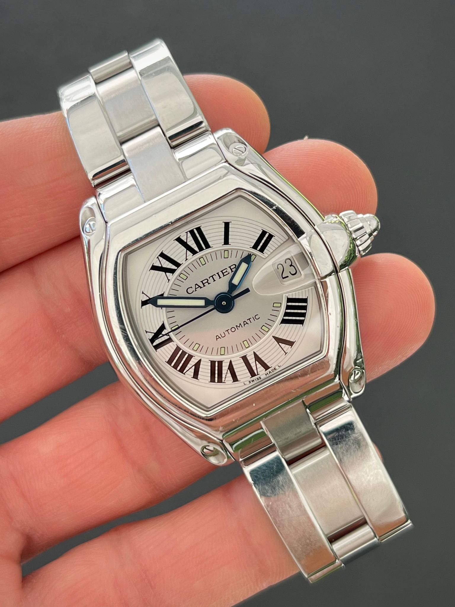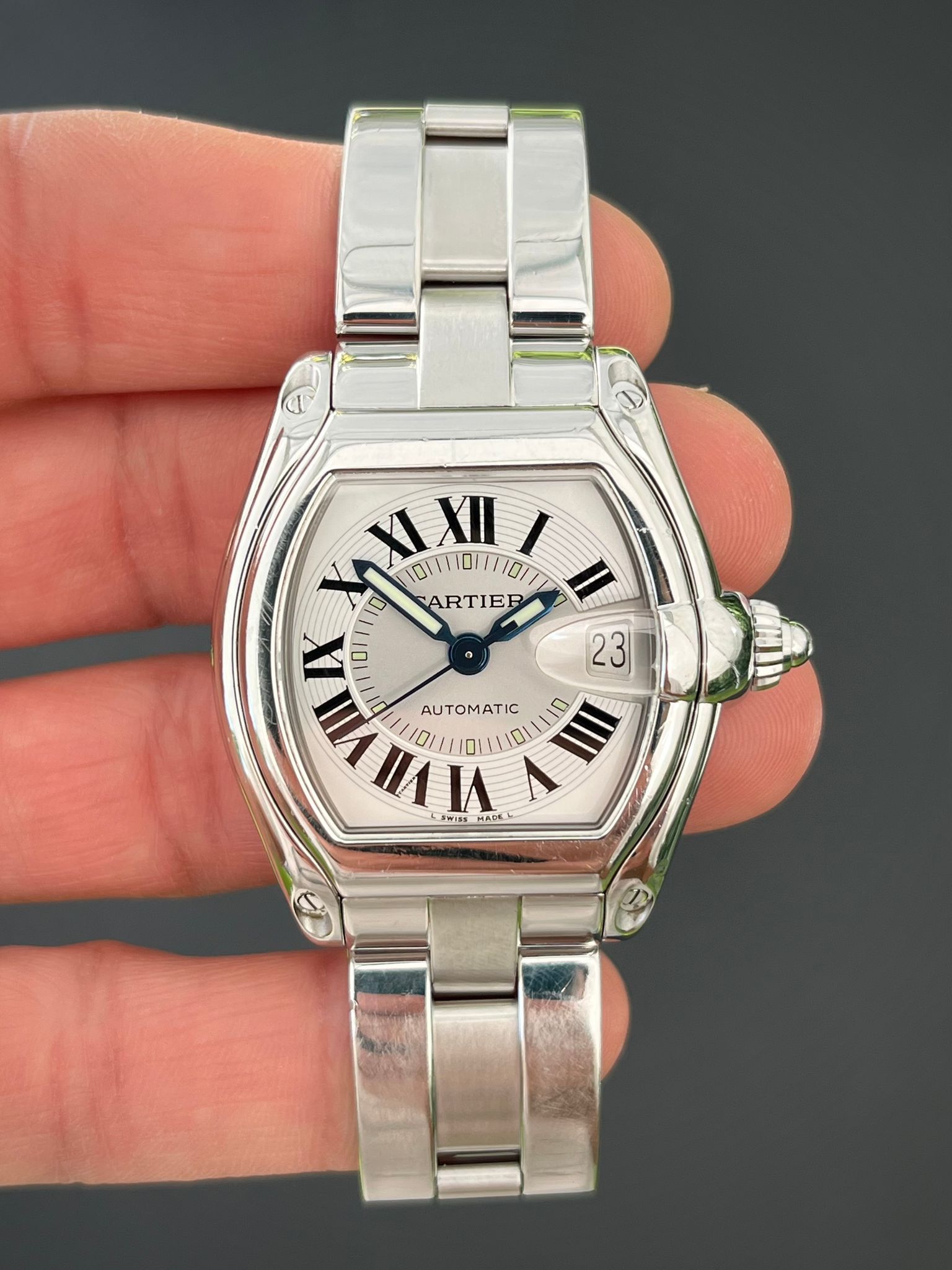 The Cartier Roadster Reference 2510 (W62000V3) is a bold and distinctive timepiece that reflects Cartier's innovative blend of luxury and automotive-inspired design. Crafted in stainless steel, the 43mm tonneau-shaped case features a polished finish and a unique magnified date cyclops integrated into its crown, reminiscent of a vintage car's headlight. The dial, in silver-tone, is adorned with Cartier's signature Roman numerals, luminescent sword-shaped hands, and a guilloché pattern that adds depth and texture. Powered by a precise automatic movement, the Roadster ensures reliability and sophistication. This full complete set includes its original papers, and additional strap option, booklets and more (no box) making it an exceptional collector's piece that bridges timeless elegance with a modern, sporty aesthetic.