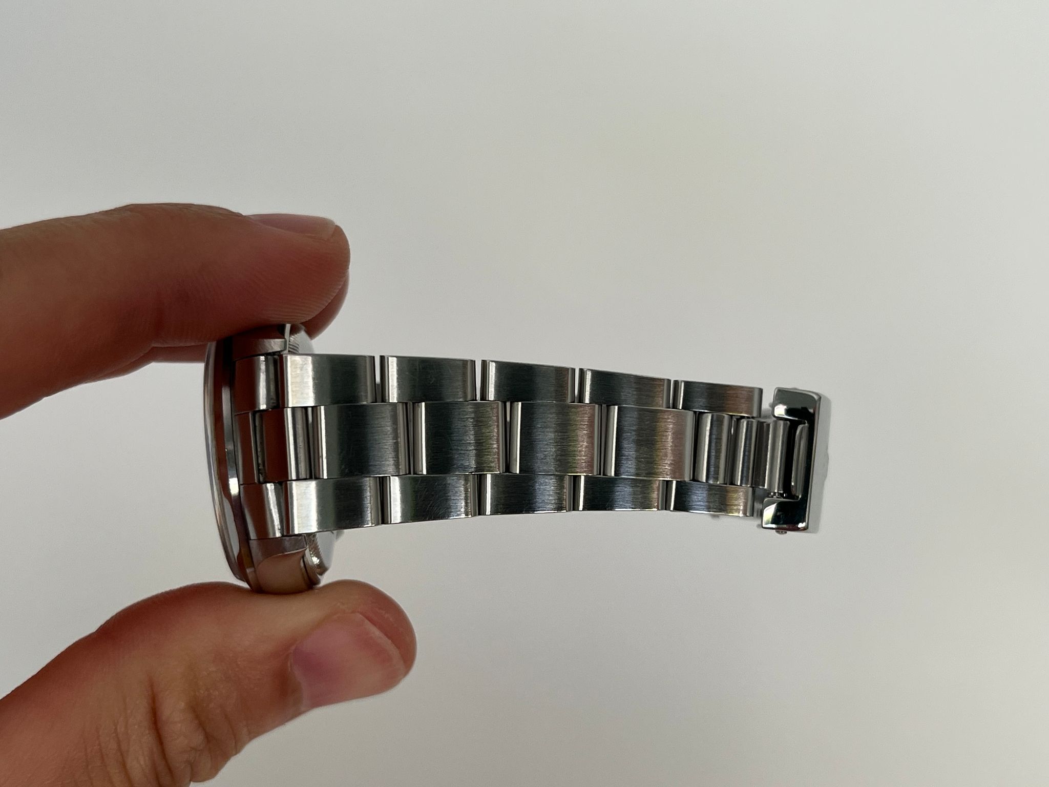 Today's example comes with papers dated 7/22/01 and is in very nice condition. The no holes case is sharp and crisp and appears unpolished. The silver stick dial is mint and shows no visible wear. The bracelet ahs 12 links and shows no stretch.