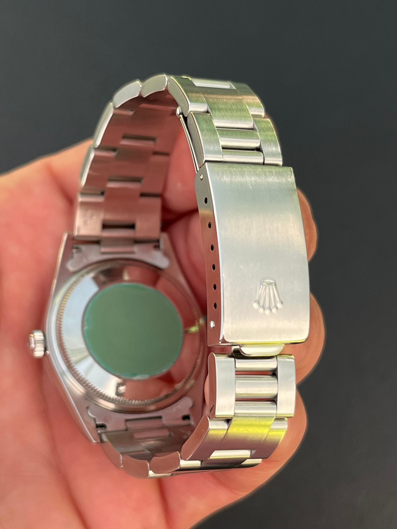 The Rolex Oyster Perpetual Air-King Reference 14000 with a silver stick Dial is a stunning example of Rolex's commitment to timeless elegance and superior craftsmanship. This exquisite timepiece features a 34mm stainless steel case, perfectly balanced for both comfort and style. The sharp silver stick dial adds a touch of sophistication, beautifully contrasted by the sleek, minimalist design and luminous hour markers. The smooth bezel and classic Oyster bracelet enhance its refined aesthetic, making it suitable for any occasion. This particular model, with its rare and captivating black salmon dial, stands out as a distinctive and highly sought-after addition to any watch collection, embodying the perfect blend of tradition and modernity.