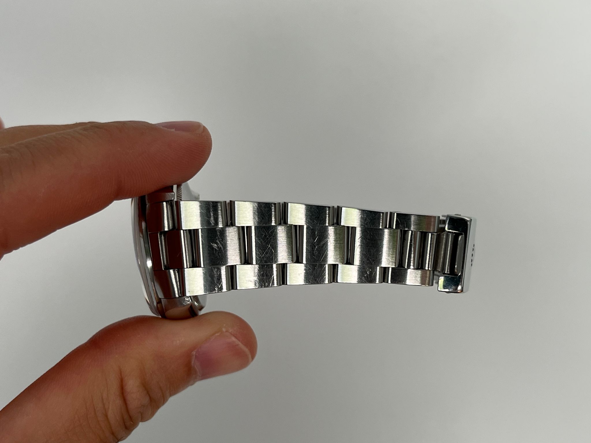Today's example comes with papers dated 10/01 and is in very nice condition. The no holes case is sharp and crisp. The black stick dial is mint and shows no visible wear. The bracelet is fully linked and show no stretch. This example can use a light detail for like new.