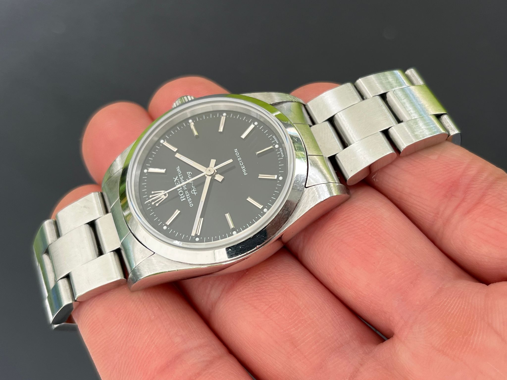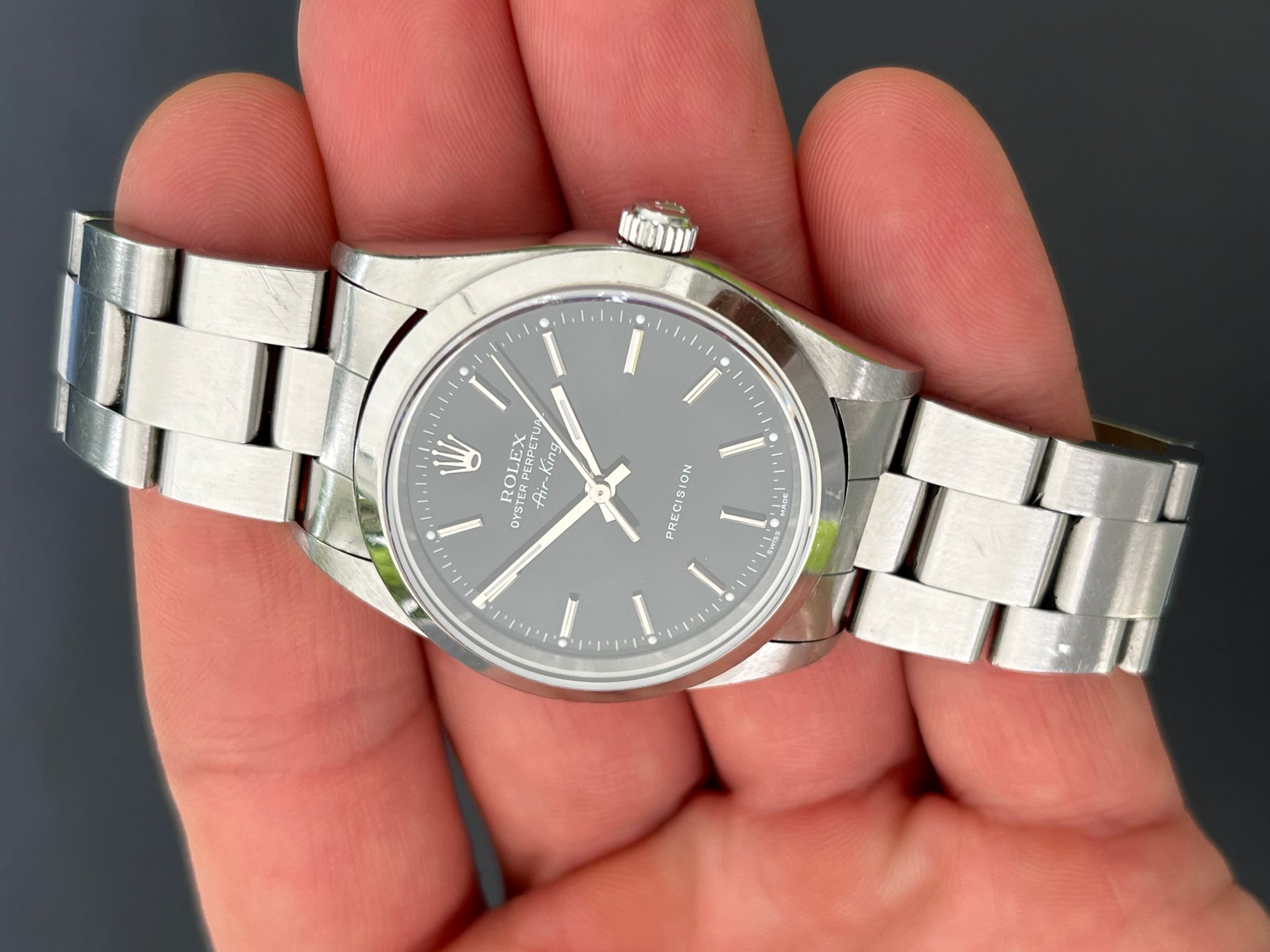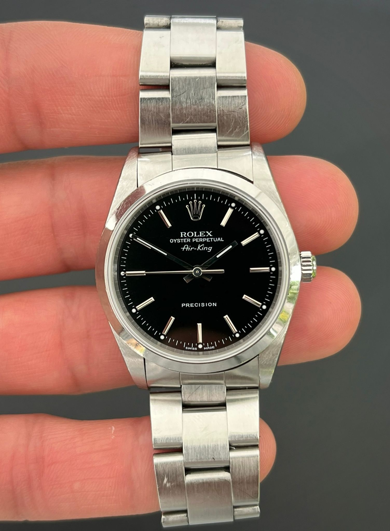 The Rolex Oyster Perpetual Air-King Reference 14000 with a black stick Dial is a stunning example of Rolex's commitment to timeless elegance and superior craftsmanship. This exquisite timepiece features a 34mm stainless steel case, perfectly balanced for both comfort and style. The sharp black stick dial adds a touch of sophistication, beautifully contrasted by the sleek, minimalist design and luminous hour markers. The smooth bezel and classic Oyster bracelet enhance its refined aesthetic, making it suitable for any occasion. This particular model, with its rare and captivating black salmon dial, stands out as a distinctive and highly sought-after addition to any watch collection, embodying the perfect blend of tradition and modernity.