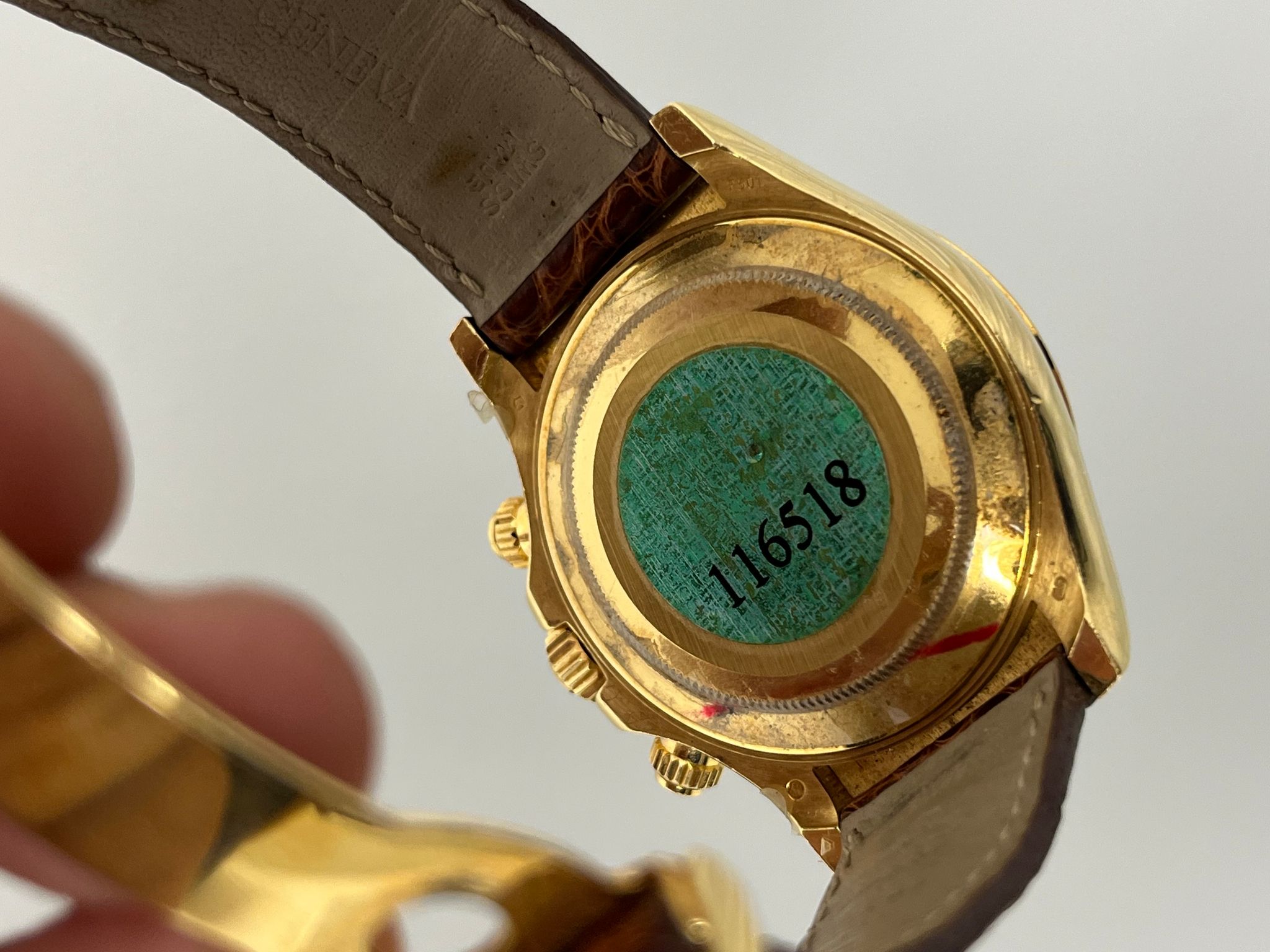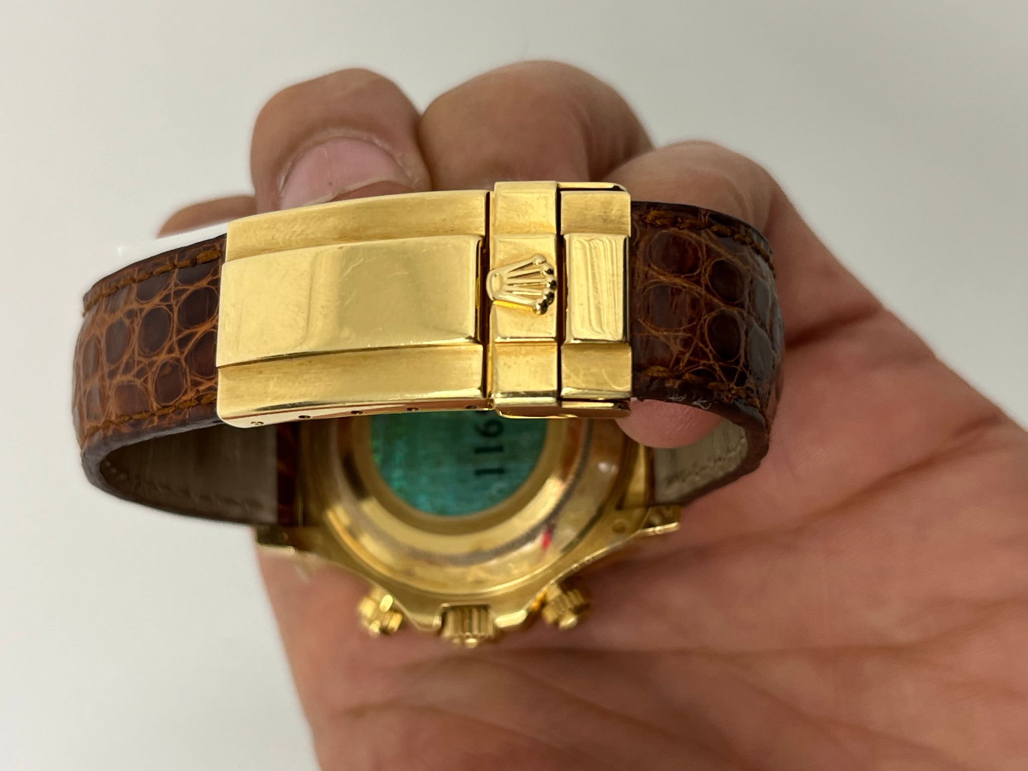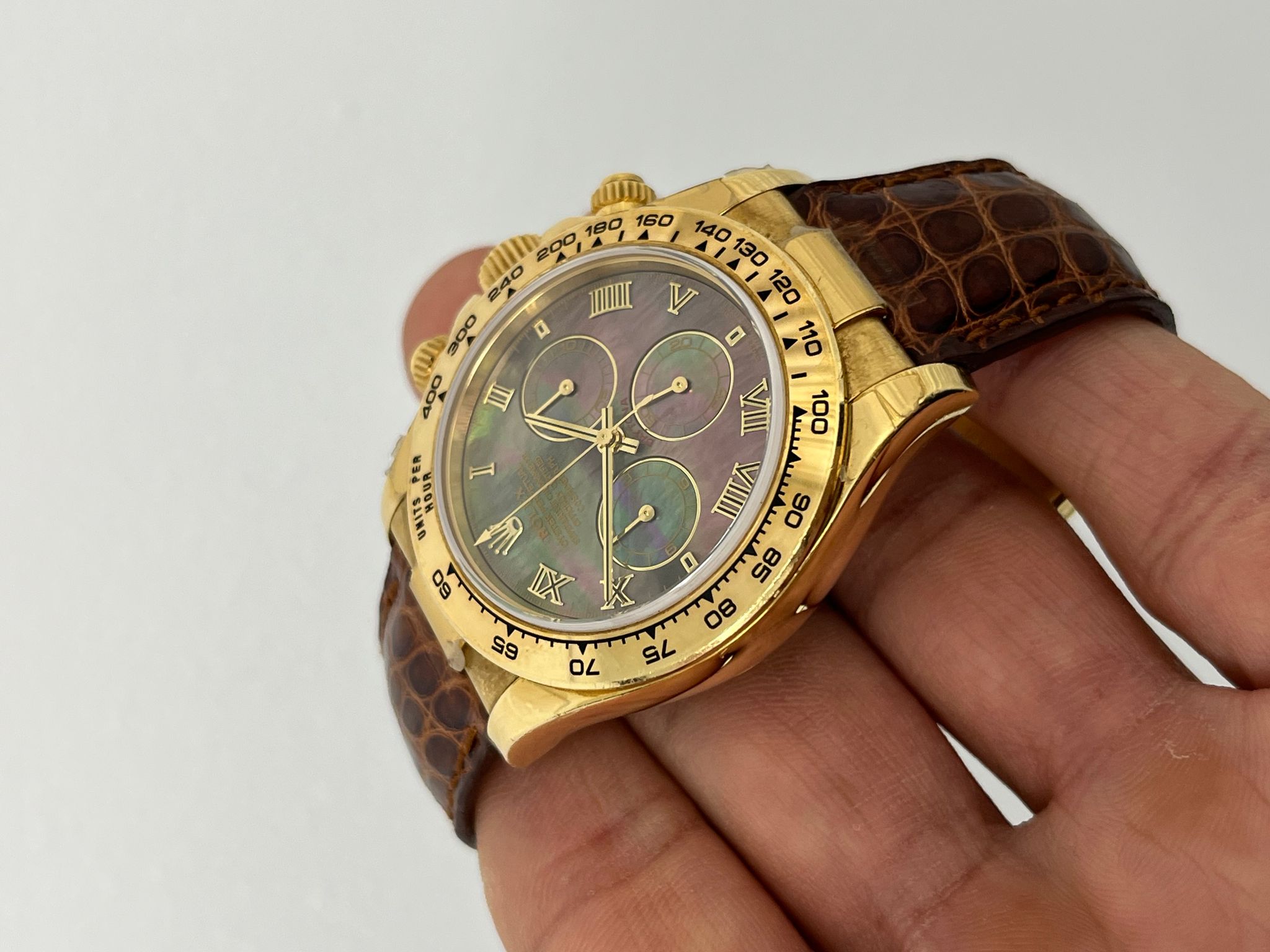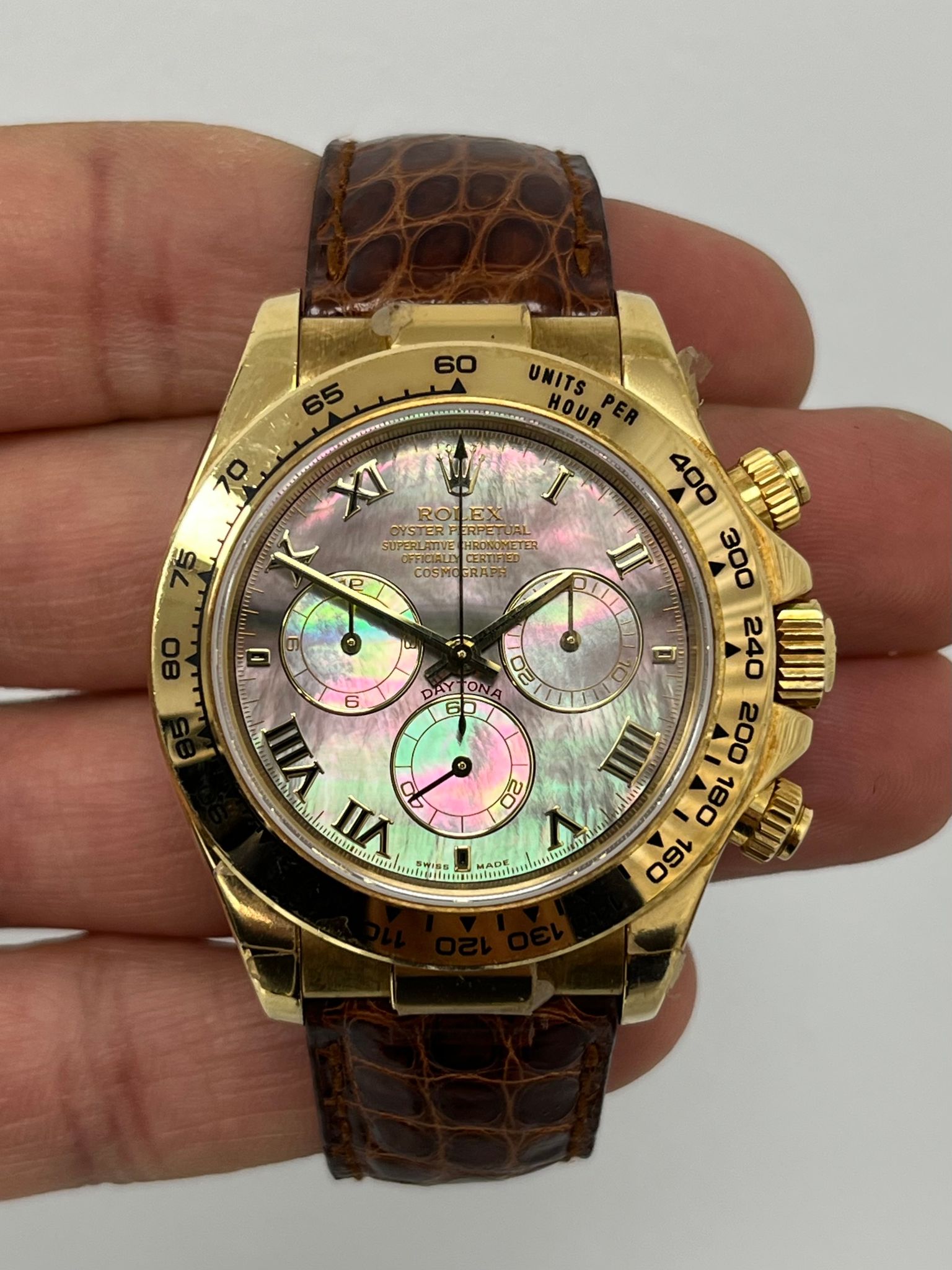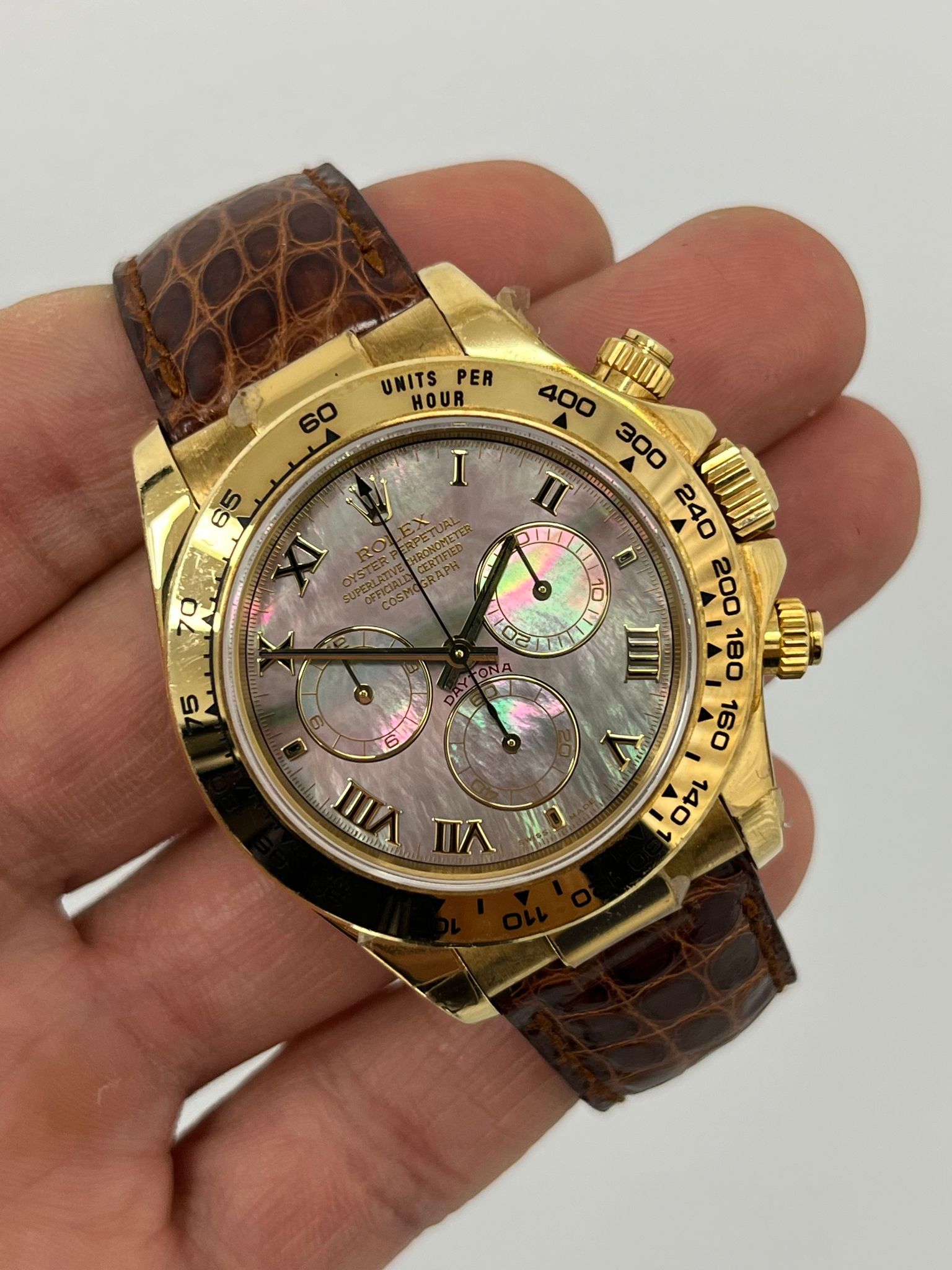 Experience luxury with the Rolex Cosmograph Daytona 116518. This exquisite watch features a 40mm 18k yellow gold case and integrated Rolex Alligator Strap, exuding sophistication and durability with a scratch-resistant sapphire crystal. The captivating "Tahitian Mother of Pearl" dial, accentuated by Roman numerals, adds a touch of opulence. It's a unique blend of style and luxury that sets this watch apart in the Rolex collection.