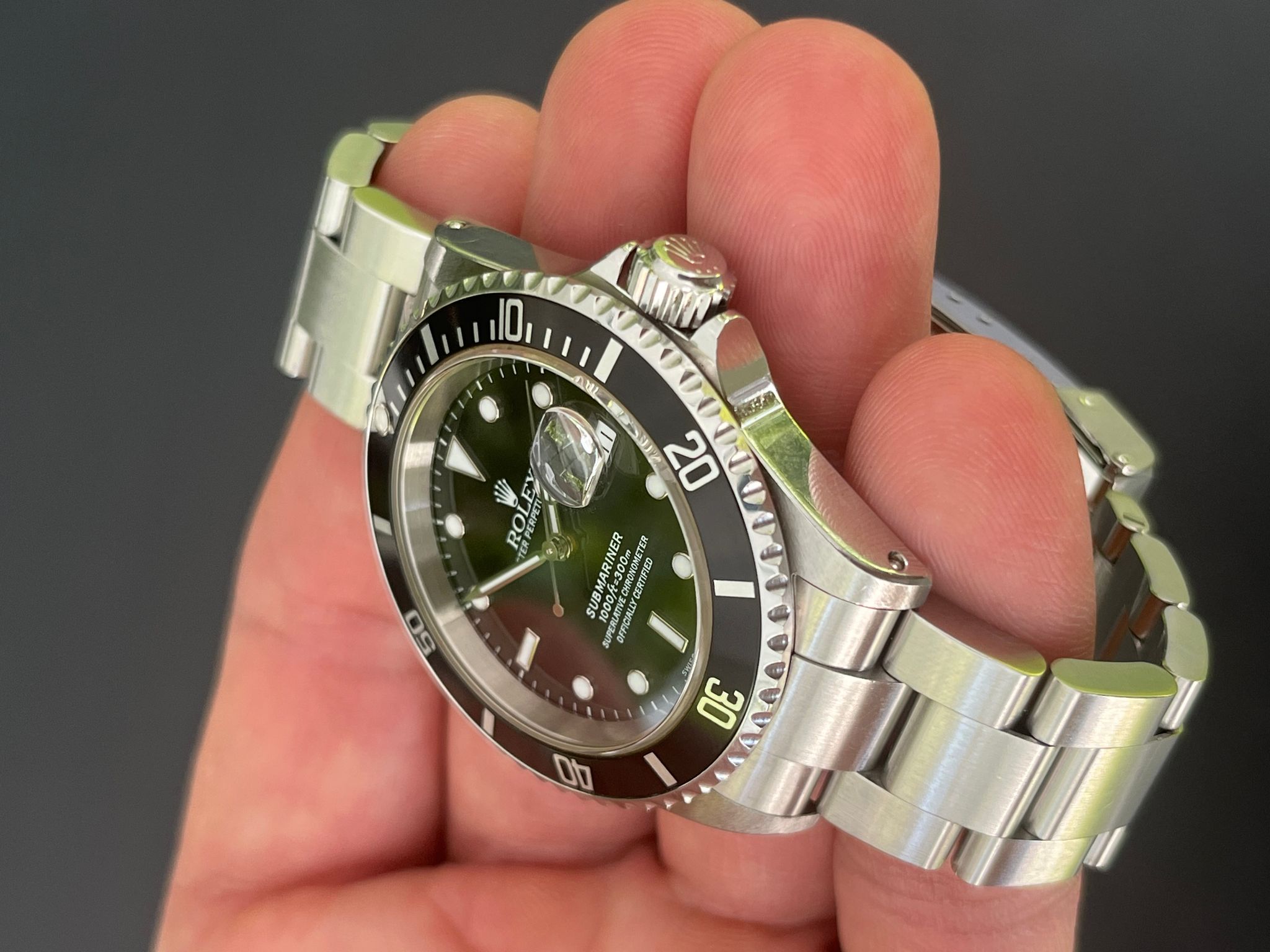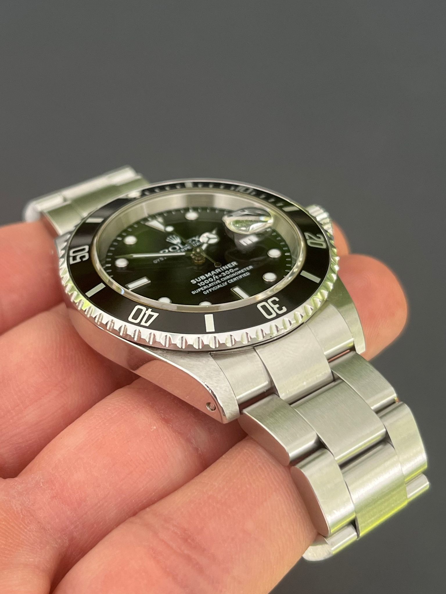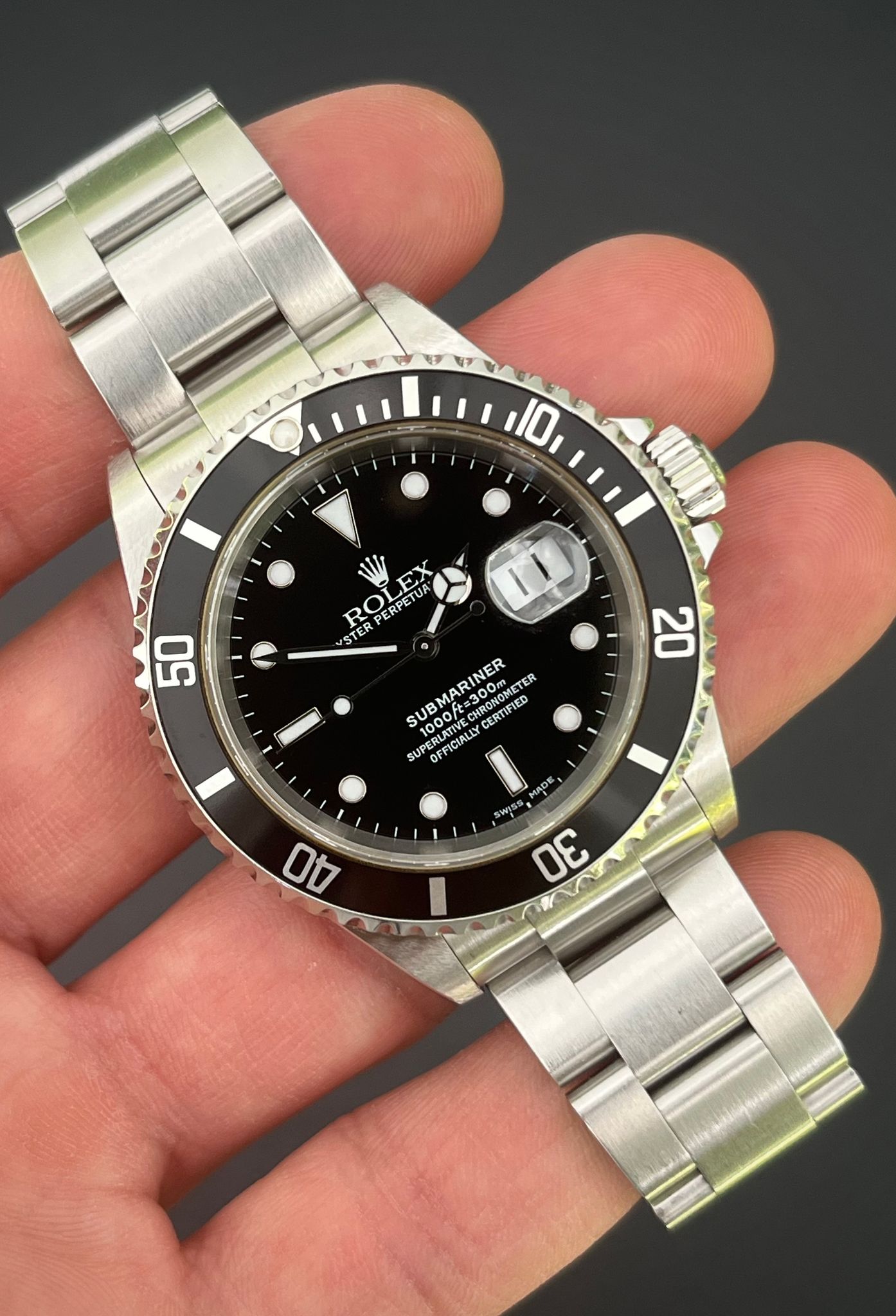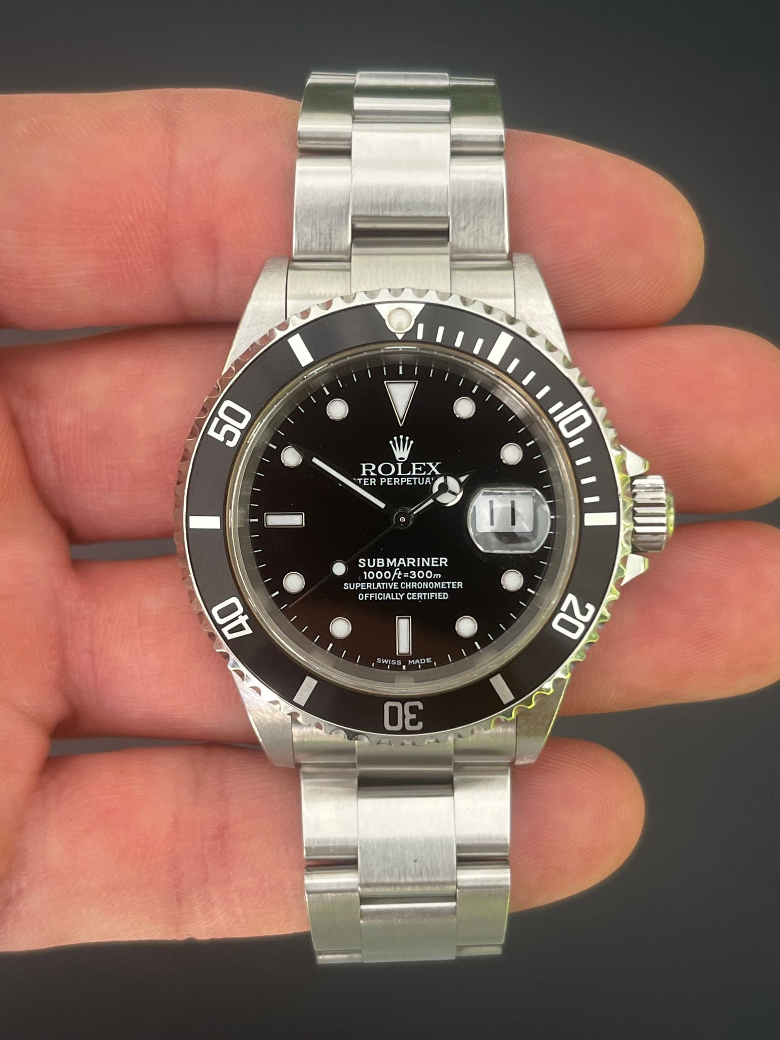 The Rolex 16610 is a highly sought-after vintage timepiece known for its distinctive design. This classic Submariner model, produced until the mid-2000s, features a stainless steel case giving it a sleek and timeless appearance. Renowned for its durability, water resistance, and iconic aesthetics, the Rolex 16610 is a beloved choice among watch enthusiasts and collectors.