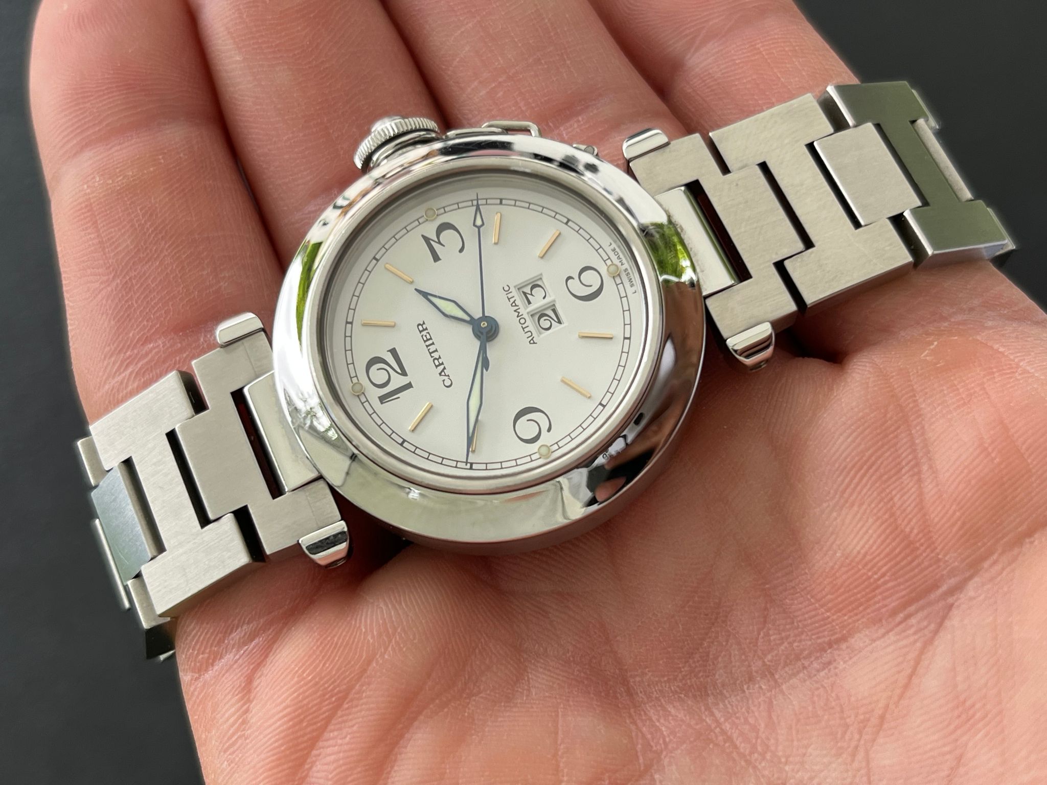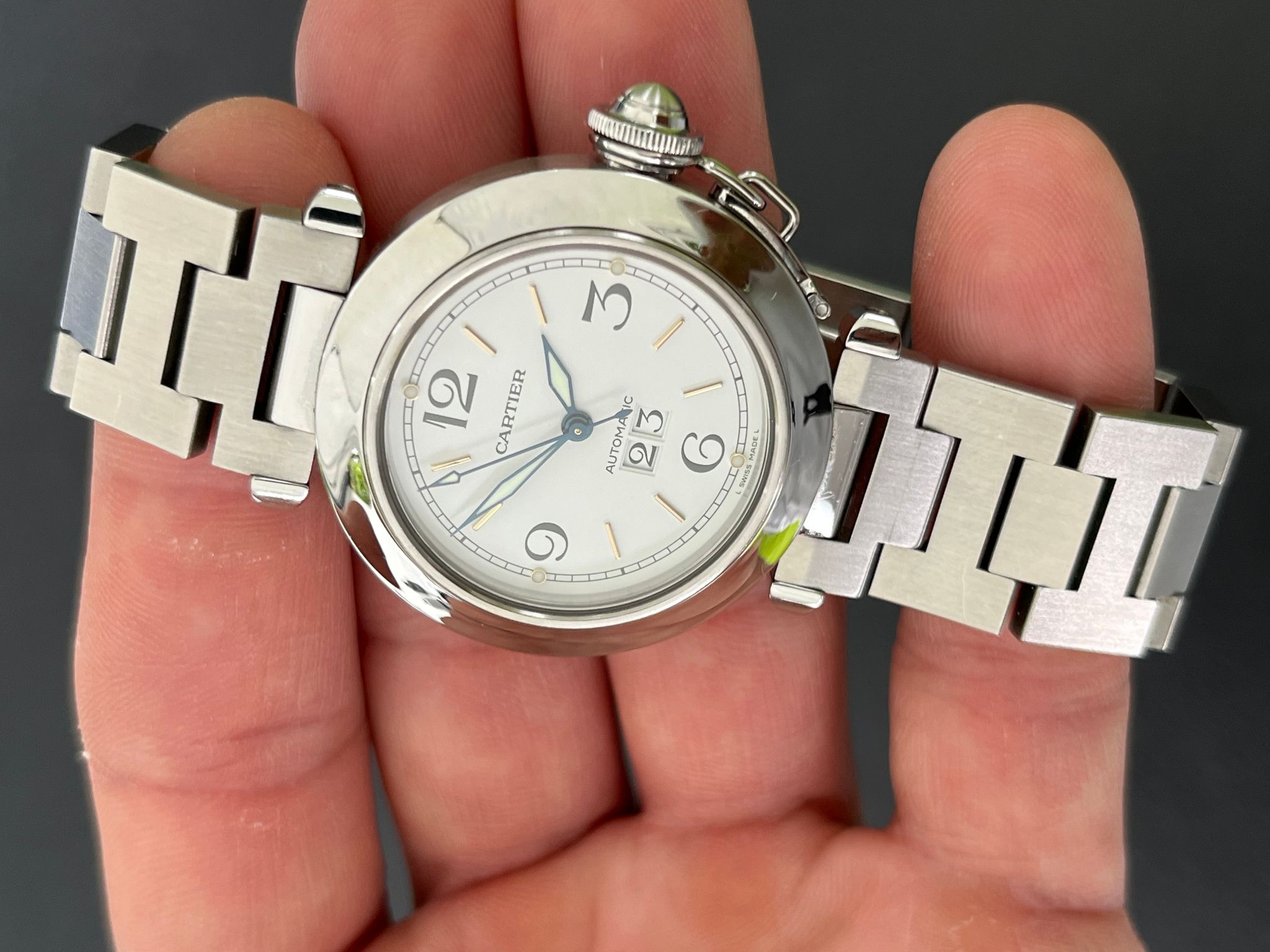 The Cartier Pasha Reference 2475 is a luxurious and distinctive timepiece that embodies Cartier’s signature blend of elegance and innovation. Encased in a 35mm stainless steel case, this watch features the iconic Pasha design with its round case, screw-down crown cap, and distinctive grid over the sapphire crystal. The silvered dial is adorned with bold Arabic numerals, blue sword-shaped hands, and a date window at 4 o’clock, offering a harmonious balance of style and functionality. Powered by a precise automatic movement, the Pasha 2475 ensures reliable performance. This full complete set includes the original box, papers, and accessories, adding significant value for collectors. The Cartier Pasha 2475 is a testament to Cartier’s mastery in watchmaking, making it a coveted piece for those who appreciate a combination of classic design and modern luxury.