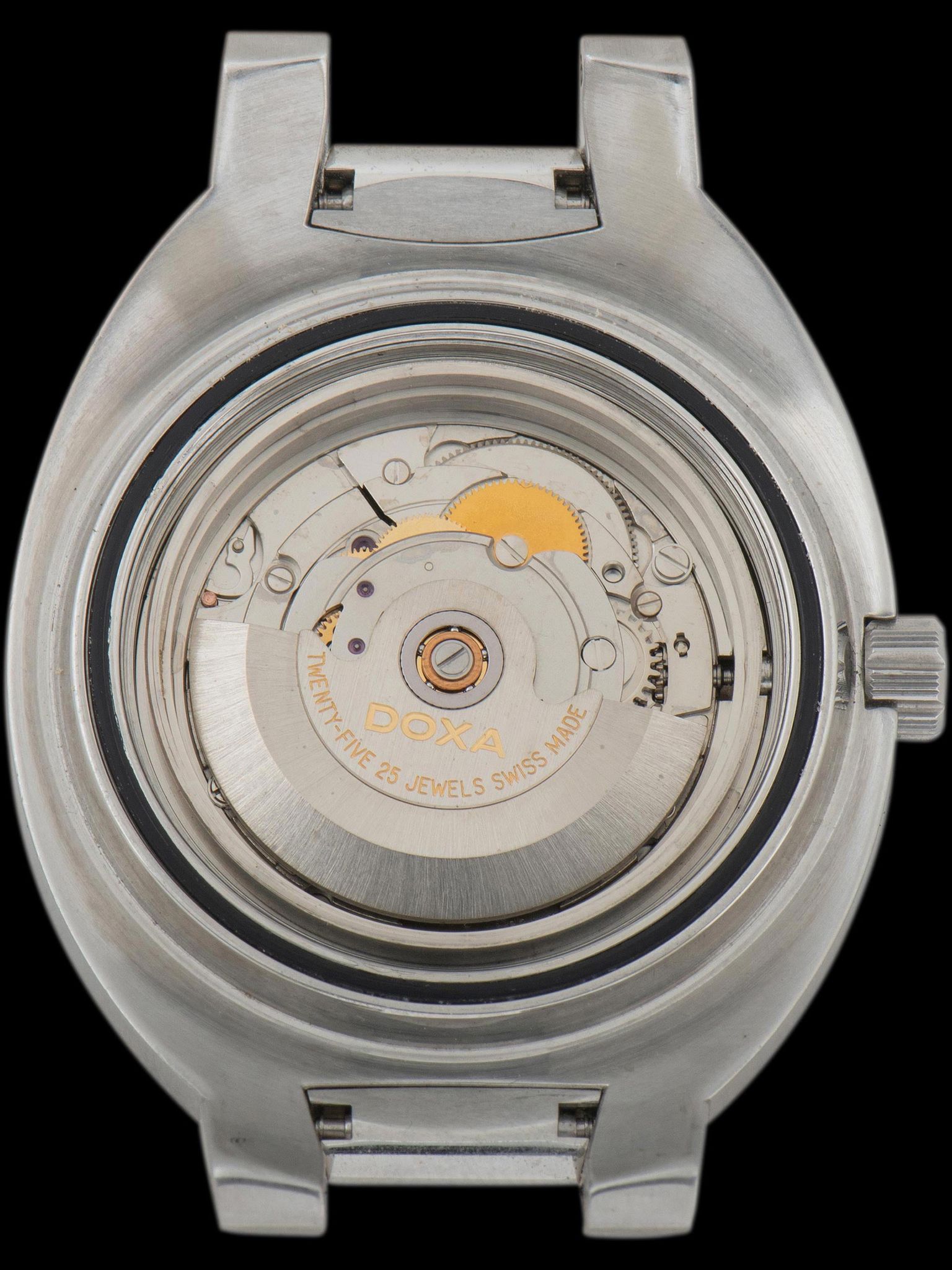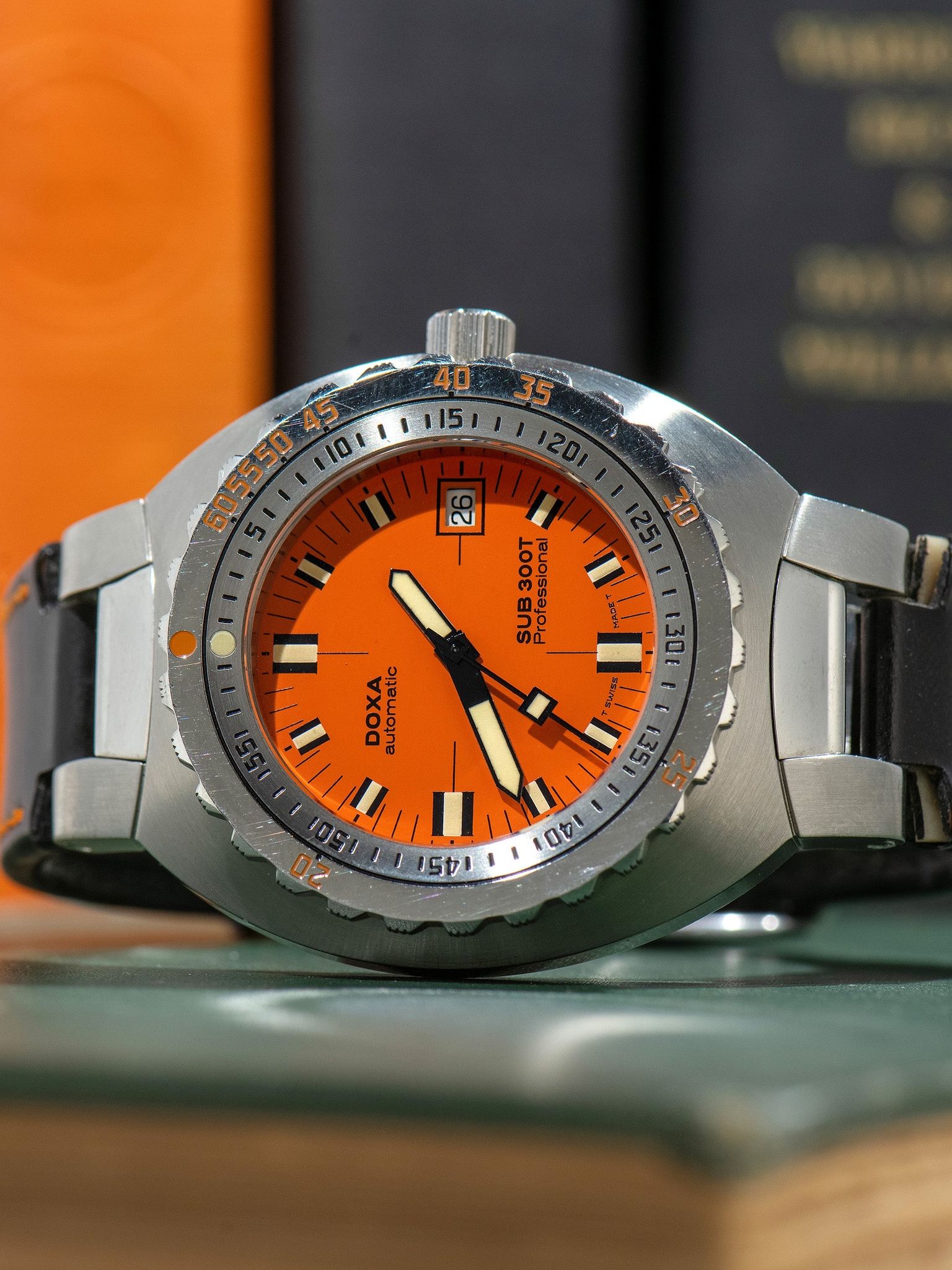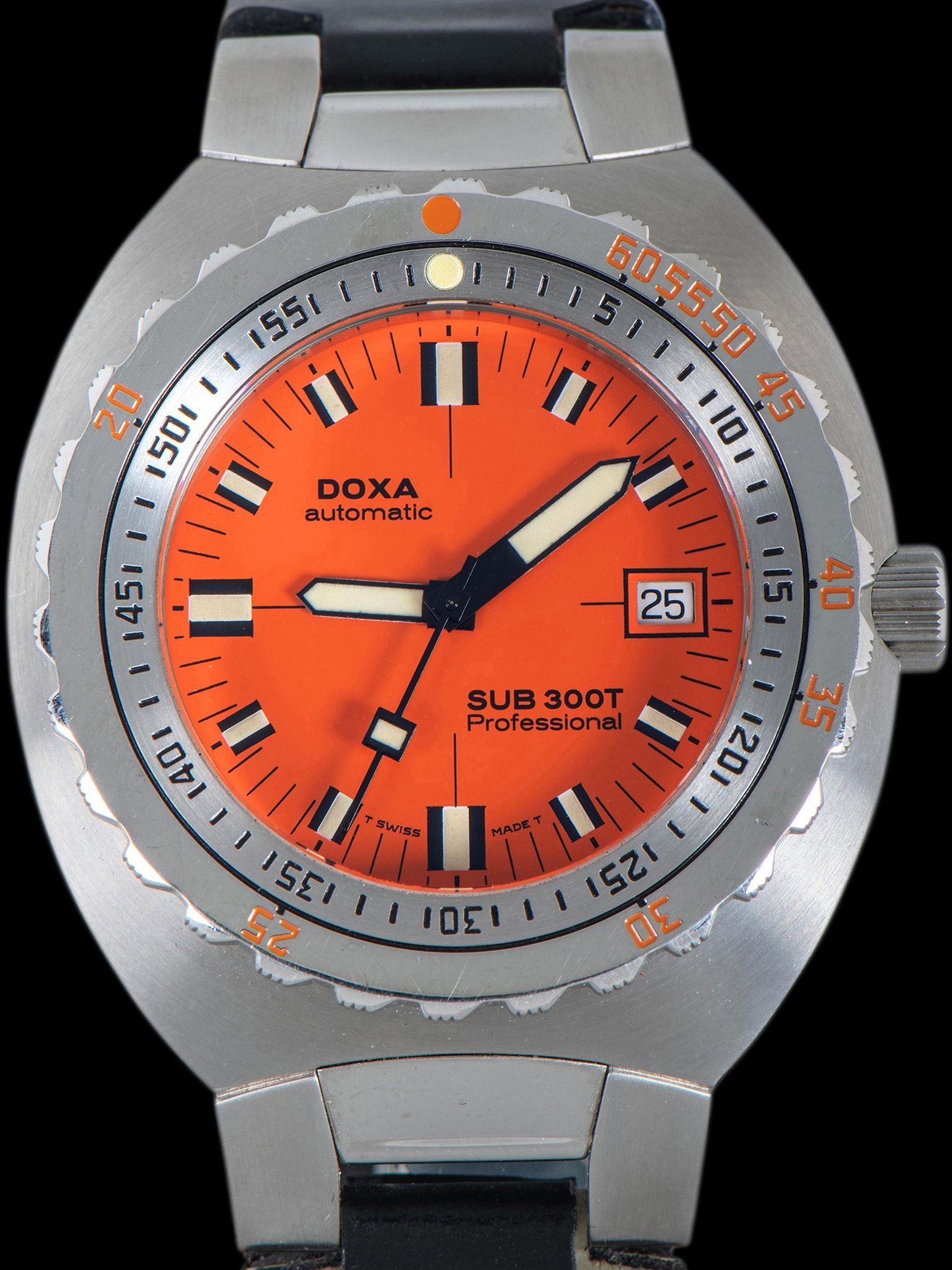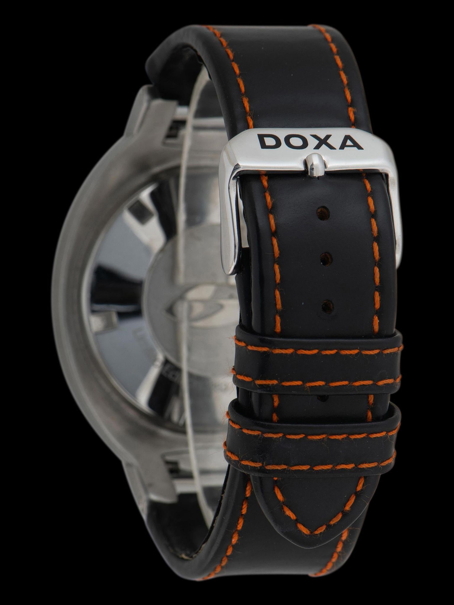 The robust, large, and long case is exceptionally well-preserved showing honest signs of gentle use with no notable evidence of being previously polished. The unidirectional "buzzsaw" bezel shows some light signs of use with the factory black and orange enamel remaining fully intact, along with the tritium pearl. The case back retains all of its original factory markings in crisp condition. The watch comes supplied on its original 2pc Doxa black strap with orange stitching and a Doxa signed tang buckle. The strap does show some light wear but remains fully functional and wearable.