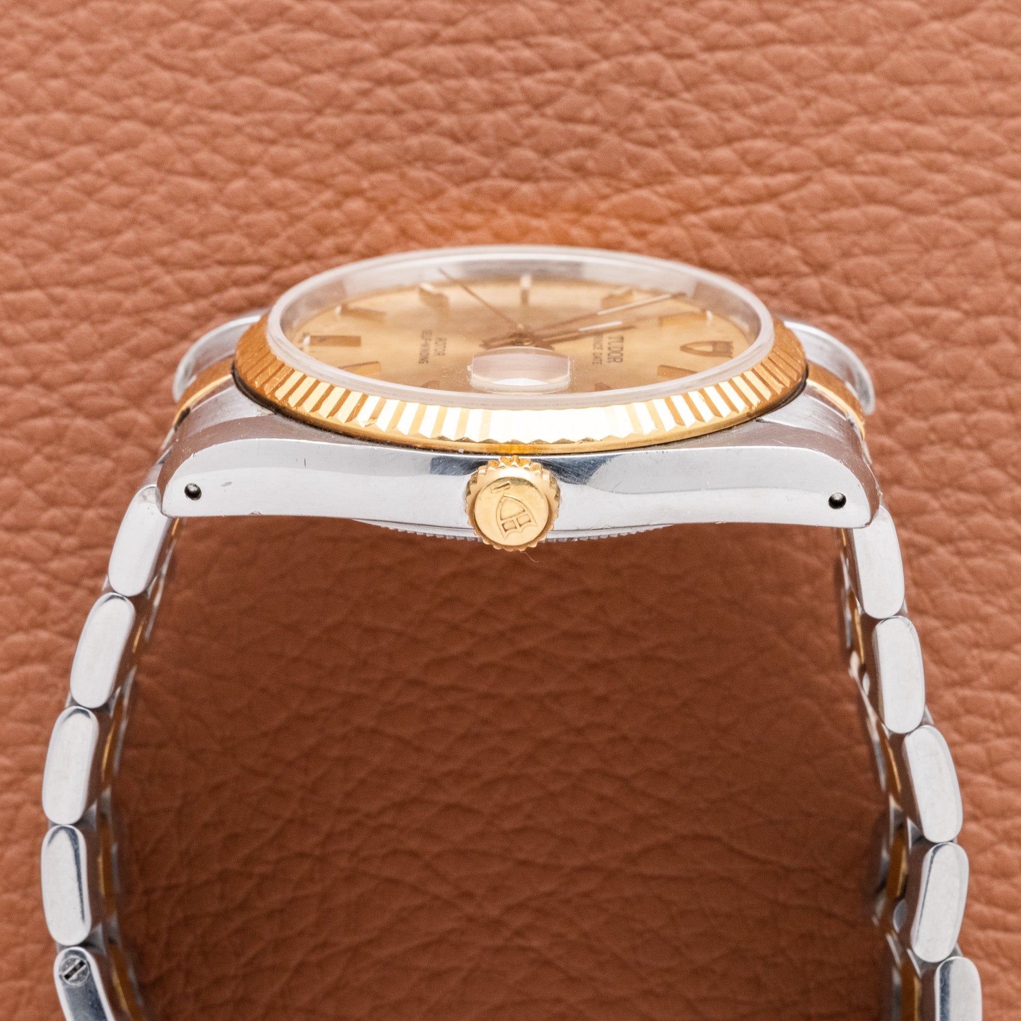 Case: The case looks to be unpolished, noted from the sharp lug holes. There is normal wear throughout. This is a later reference 74033, so it has the Tudor signed crown and case. There are no aggressive dings or dents. The yellow gold fluted bezel is very sharp.