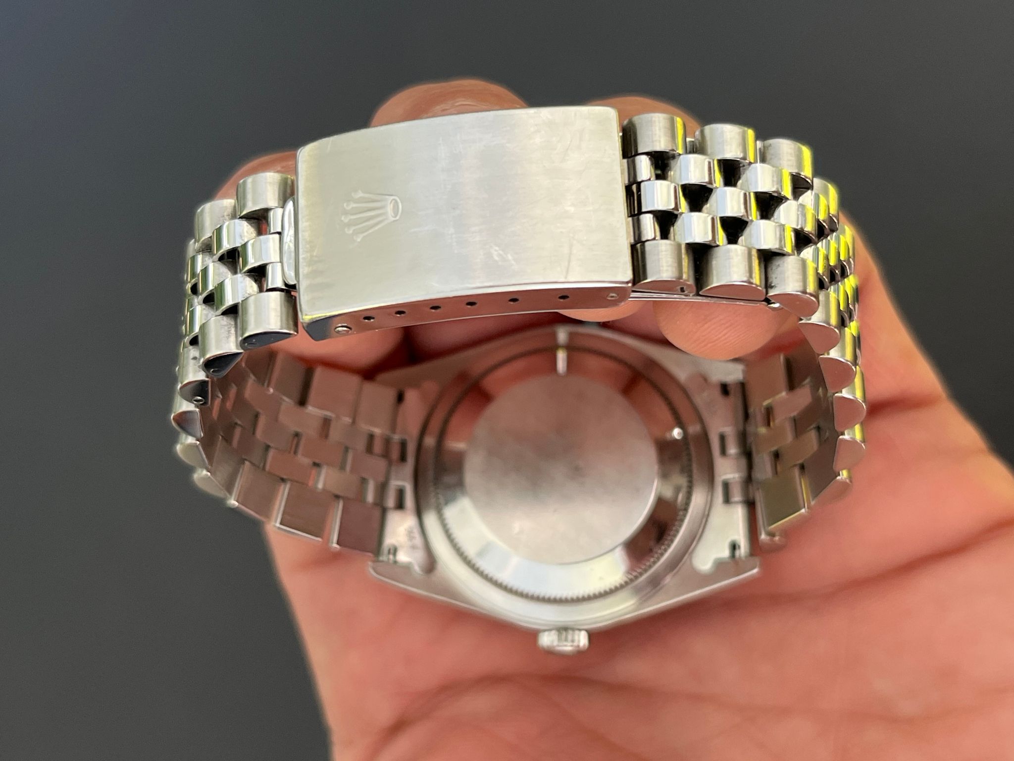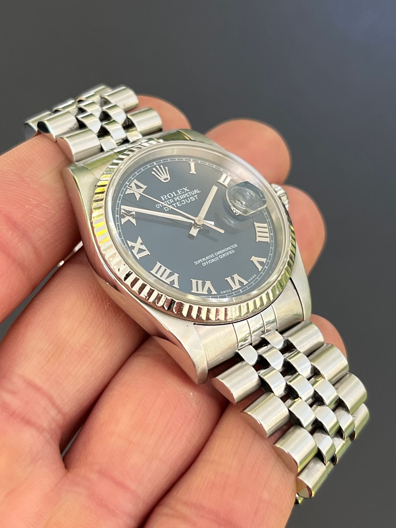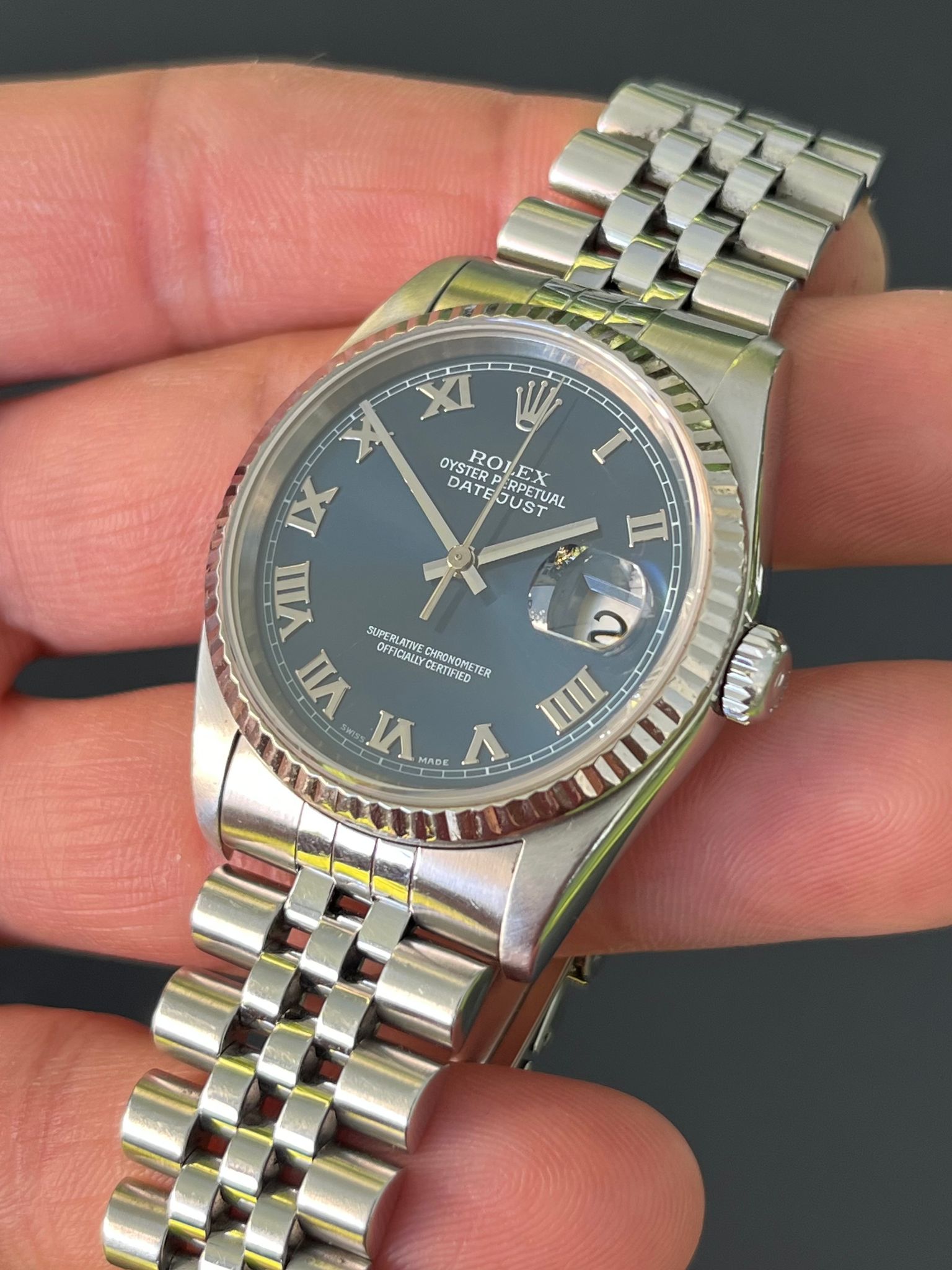 This Date Just showcases a Blue Roman dial featuring a date display, exemplifying Rolex's commitment to precision and enduring style. The no holes case is excellent and crisp. The Saphire crystal is free from wear partnered with its excellent white gold fluted bezel. The Blue Roman dial is excellent showing no visible wear. The bracelet has 4 removable screws and is in excellent condition showing minimal to light stretch. This is a top example with a rare Blue Roman dial that running COSC.