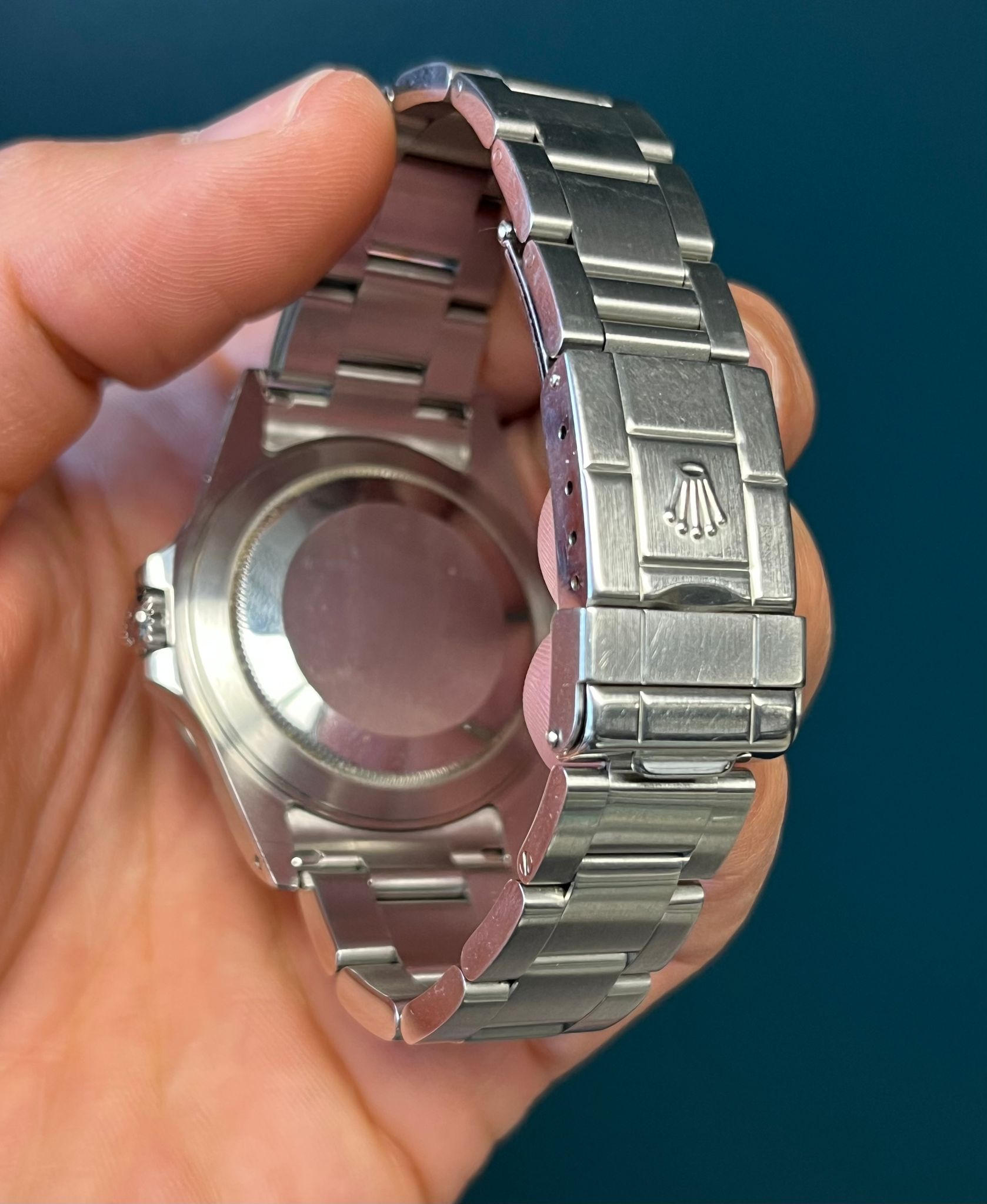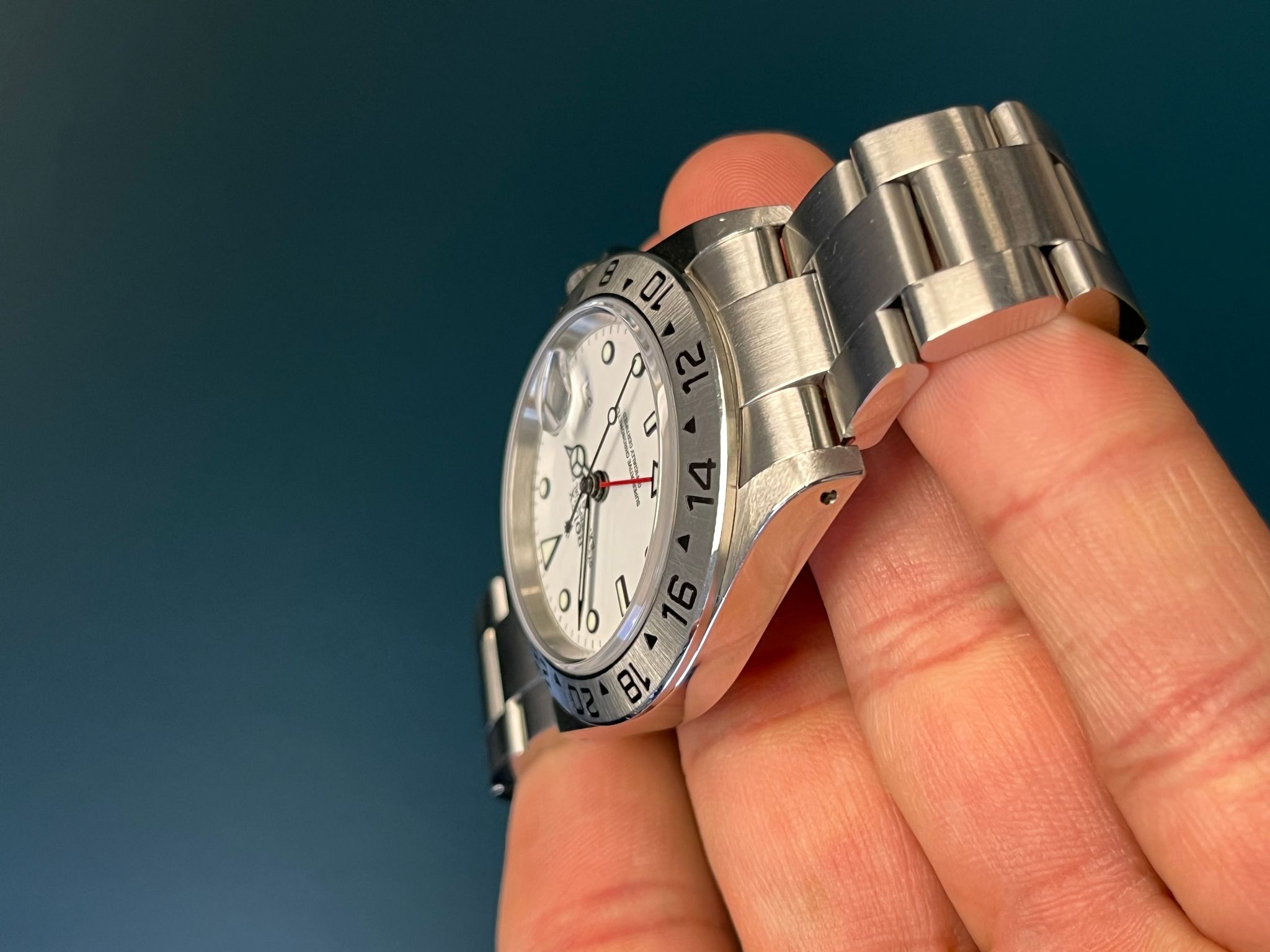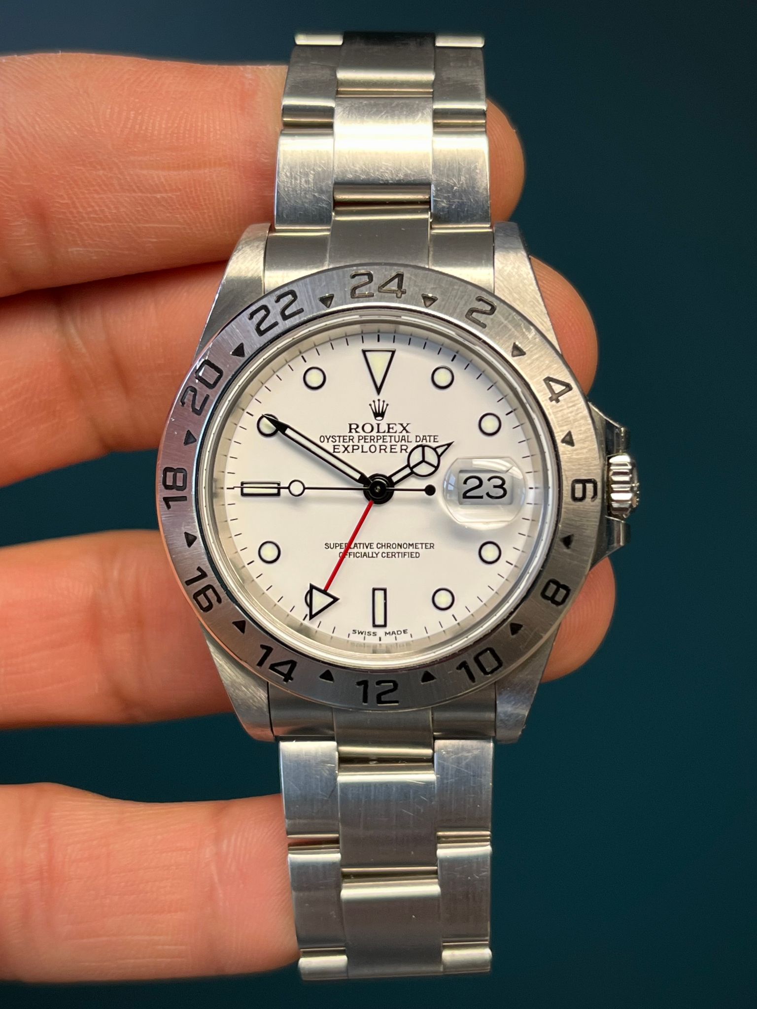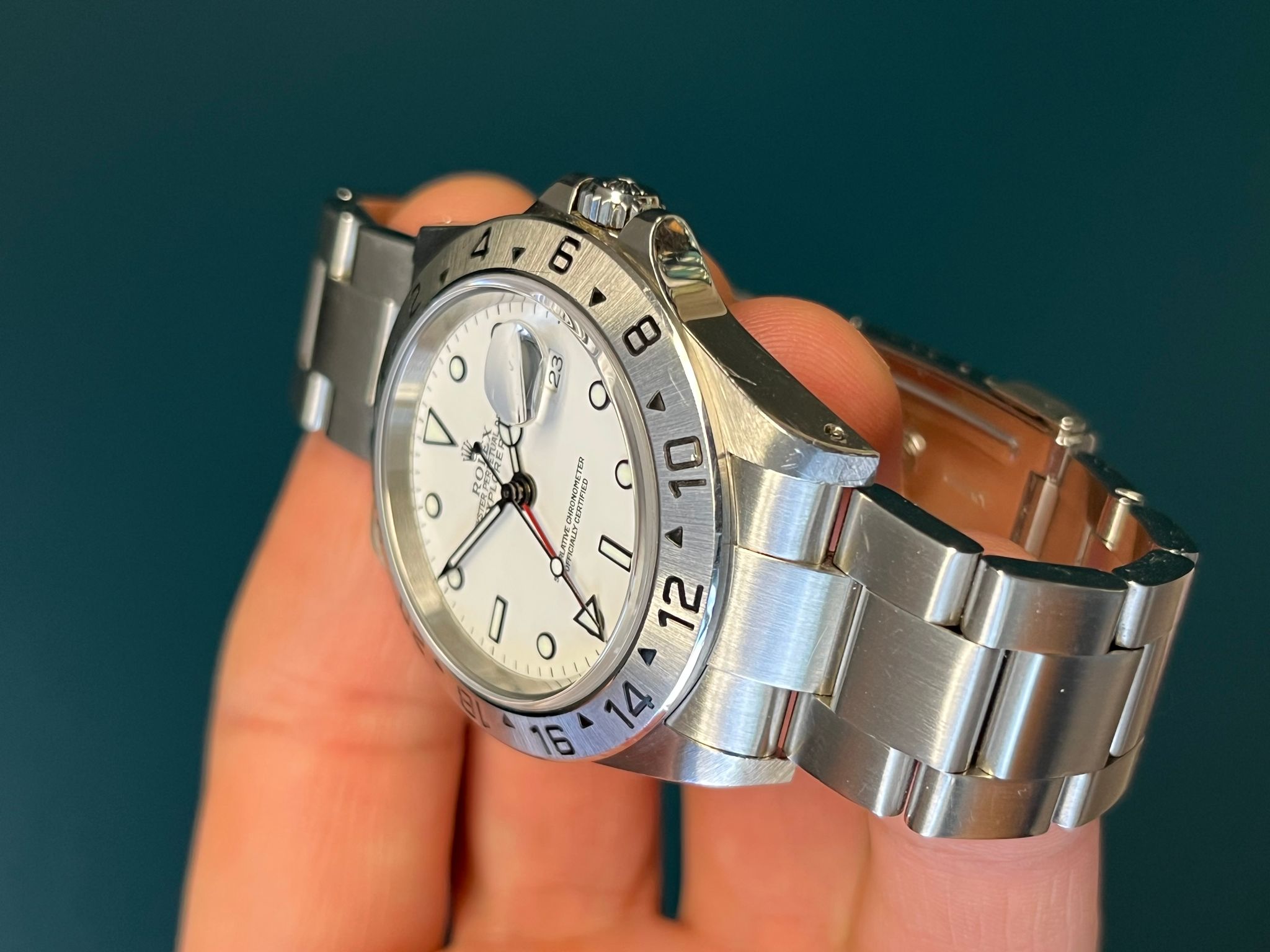 Today we have a lovely unpolished 16570 Polar Explorer II full complete set with papers dated 8/1/03. The unpolished case is sharp showing very prominent chamfers along with a crisp bezel that is thick and rich in its filled enamel. The dial is excellent with no visible wear with matching hands. The Solid End link bracelet has 12 links and shows no stretch. This example is running at COSC Specs. This set comes complete with Box, papers, tags, & booklets.