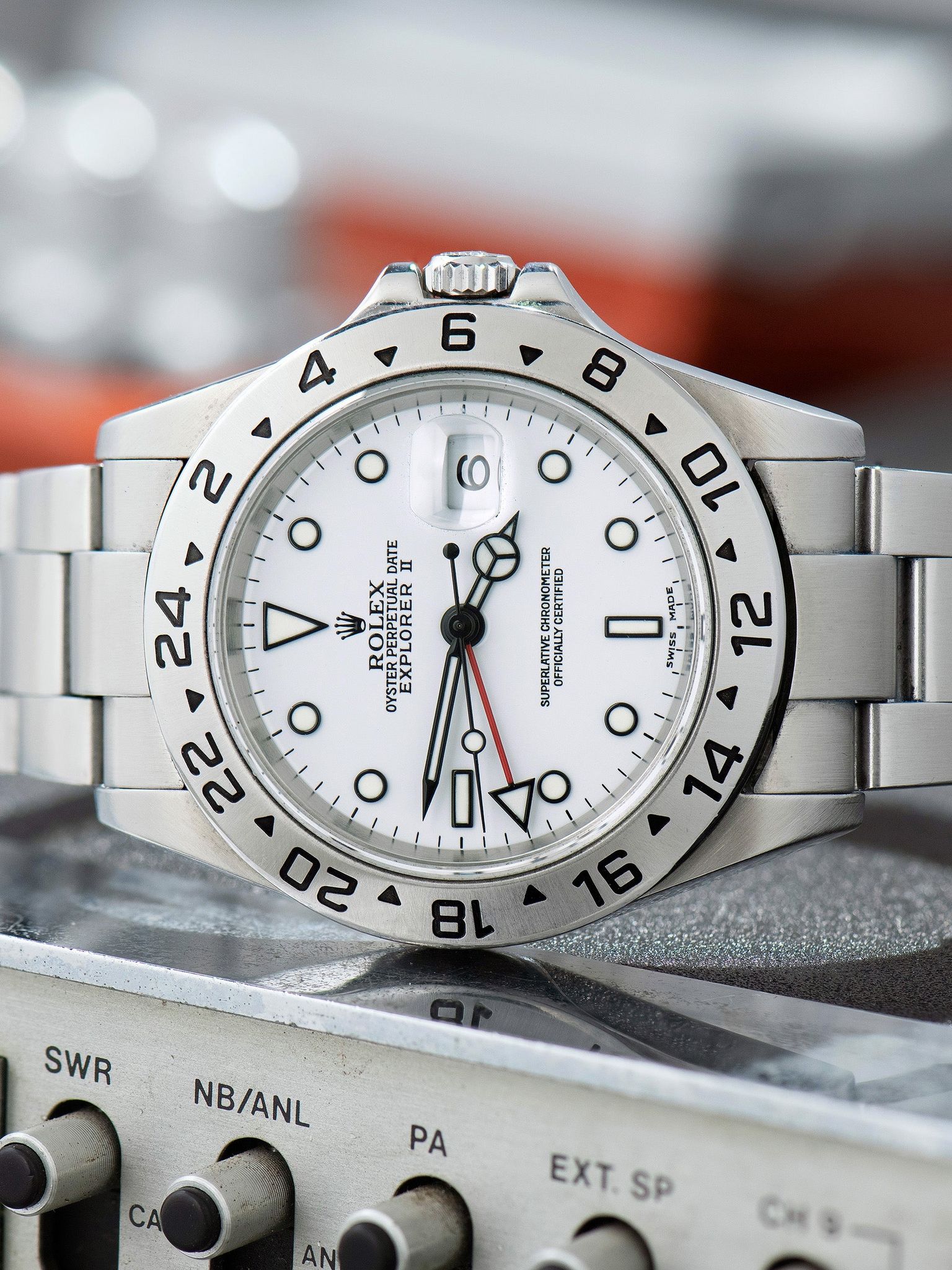 The Rolex Explorer II ref. 16570 was introduced in 1989, directly succeeding the transitional ref. 16550 with some subtle cosmetic and internal upgrades. The Rolex Explorer II ref. 16570 employs the updated and robust cal. 3185 jumping hour movement, the black paint on the hands and marker surrounds is now standard on the white or “polar” dial variants, and the bezel font has been slightly modified from the previous reference.