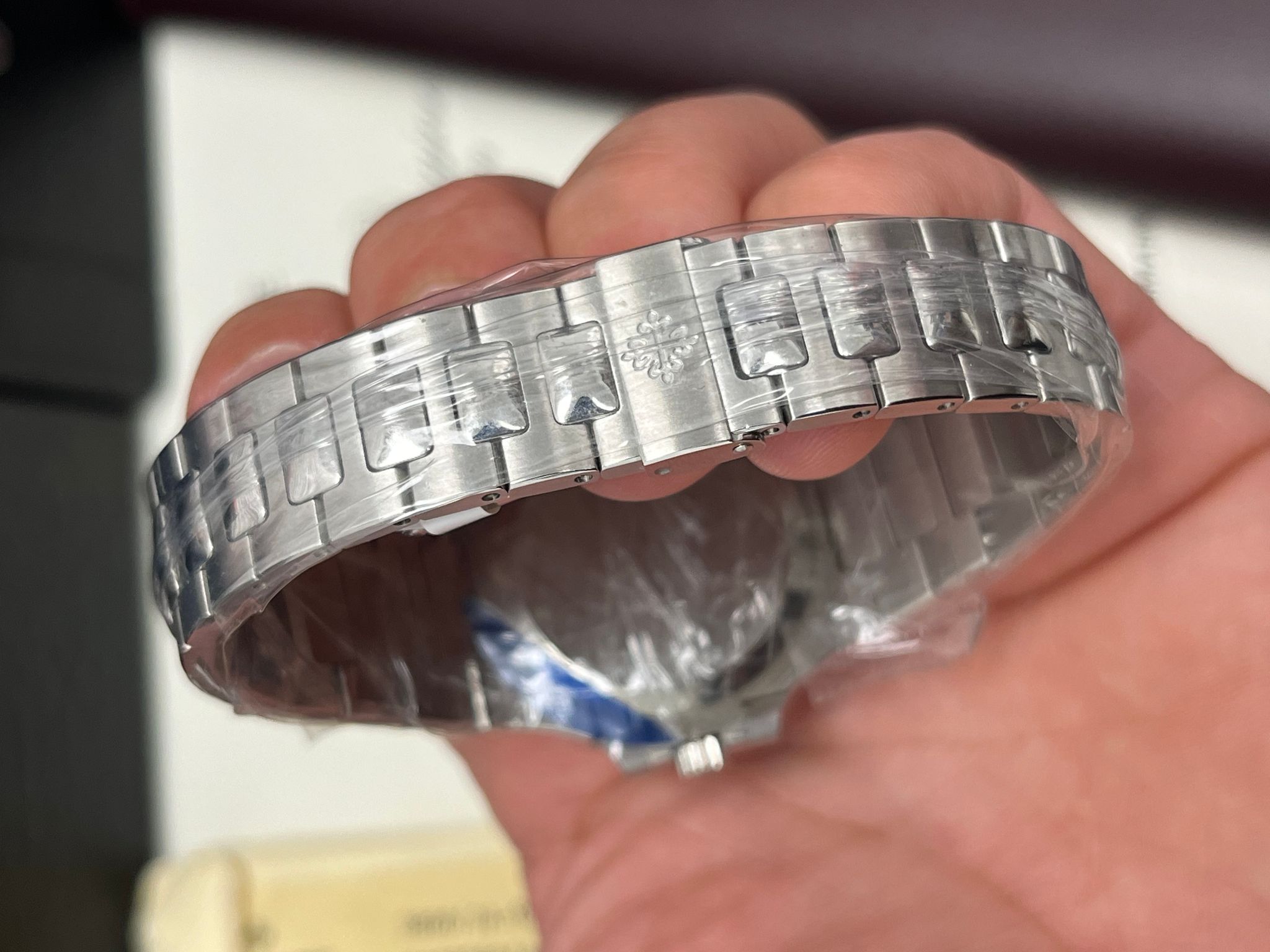 Today's example comes to us as a museum collector grade set, New Old Stock, fully stickered and never worn. In addition to its untouched chastity, this example comes as a full complete collectors set with absolutely everything and the papers are dated 5/04. Nows your chance to own an exemplary piece of Patek history.