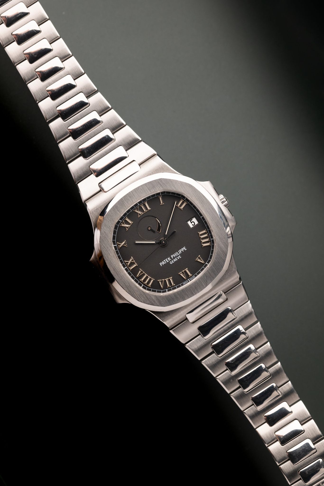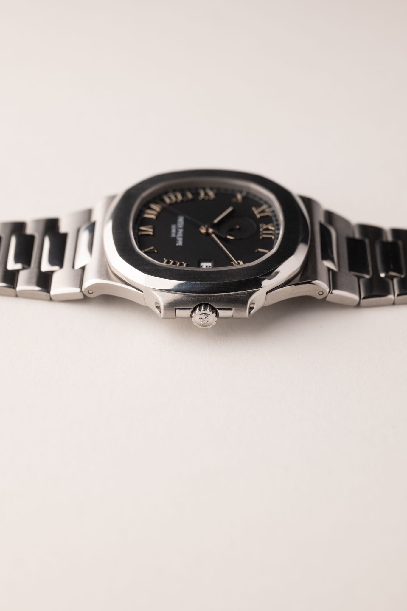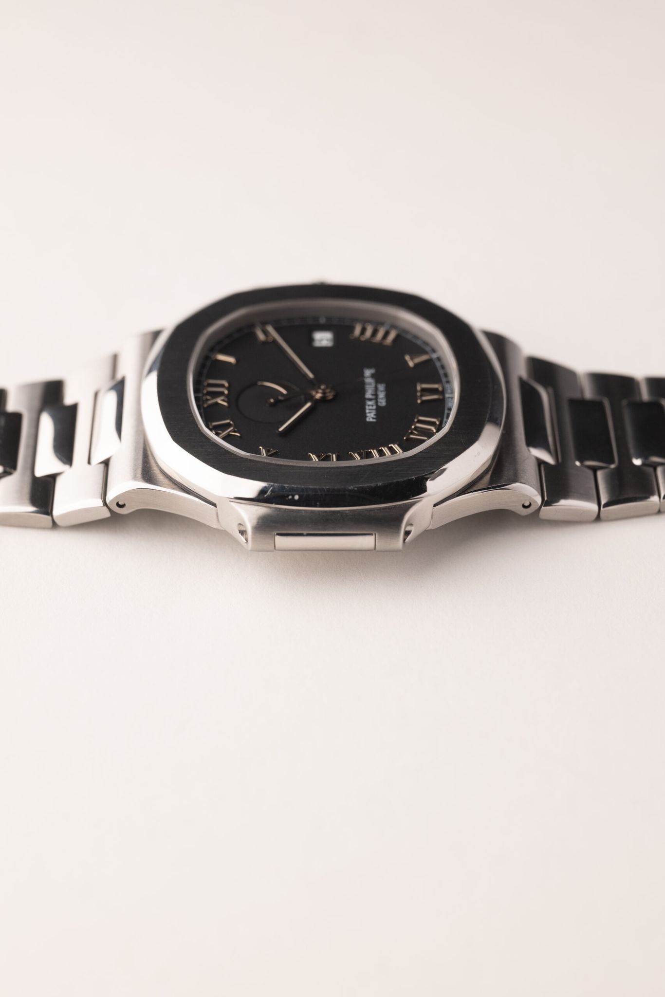 A lesser seen Nautilus, the 3701 has a power reserve that gives its nickname of “Comet.” Short one link from a full bracelet. Comes with papers.