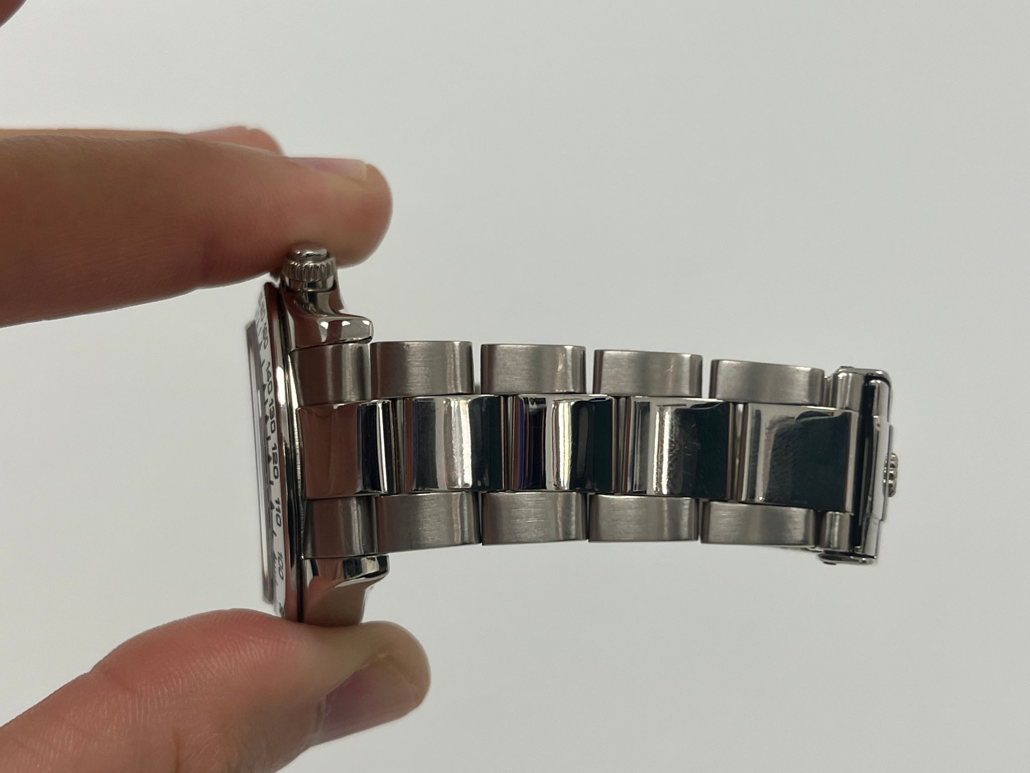 This is a clean example that comes watch only. The bracelet has 11 links total with minimal to no stretch. The chronograph feature runs well resetting as it should and keeping time.