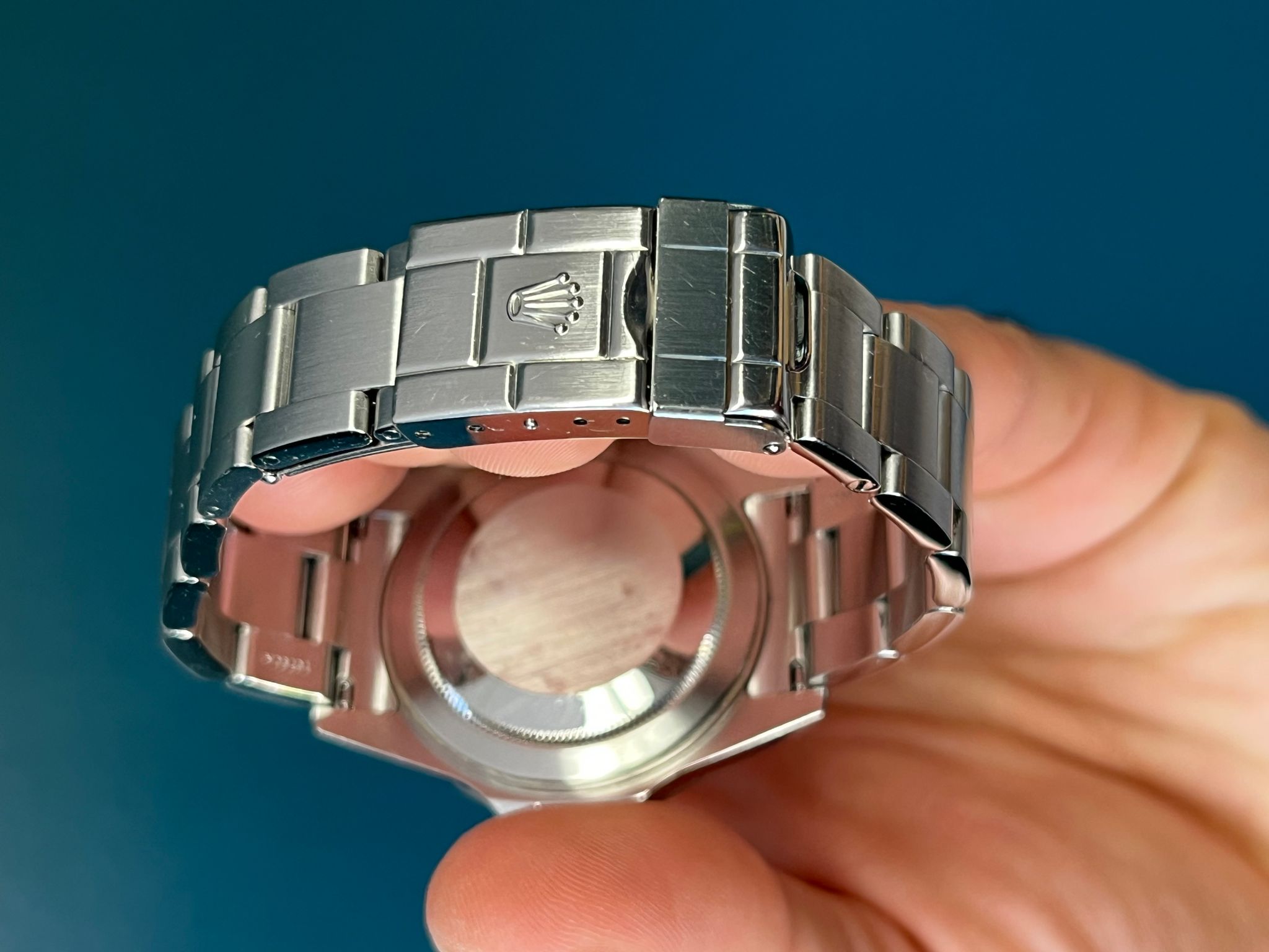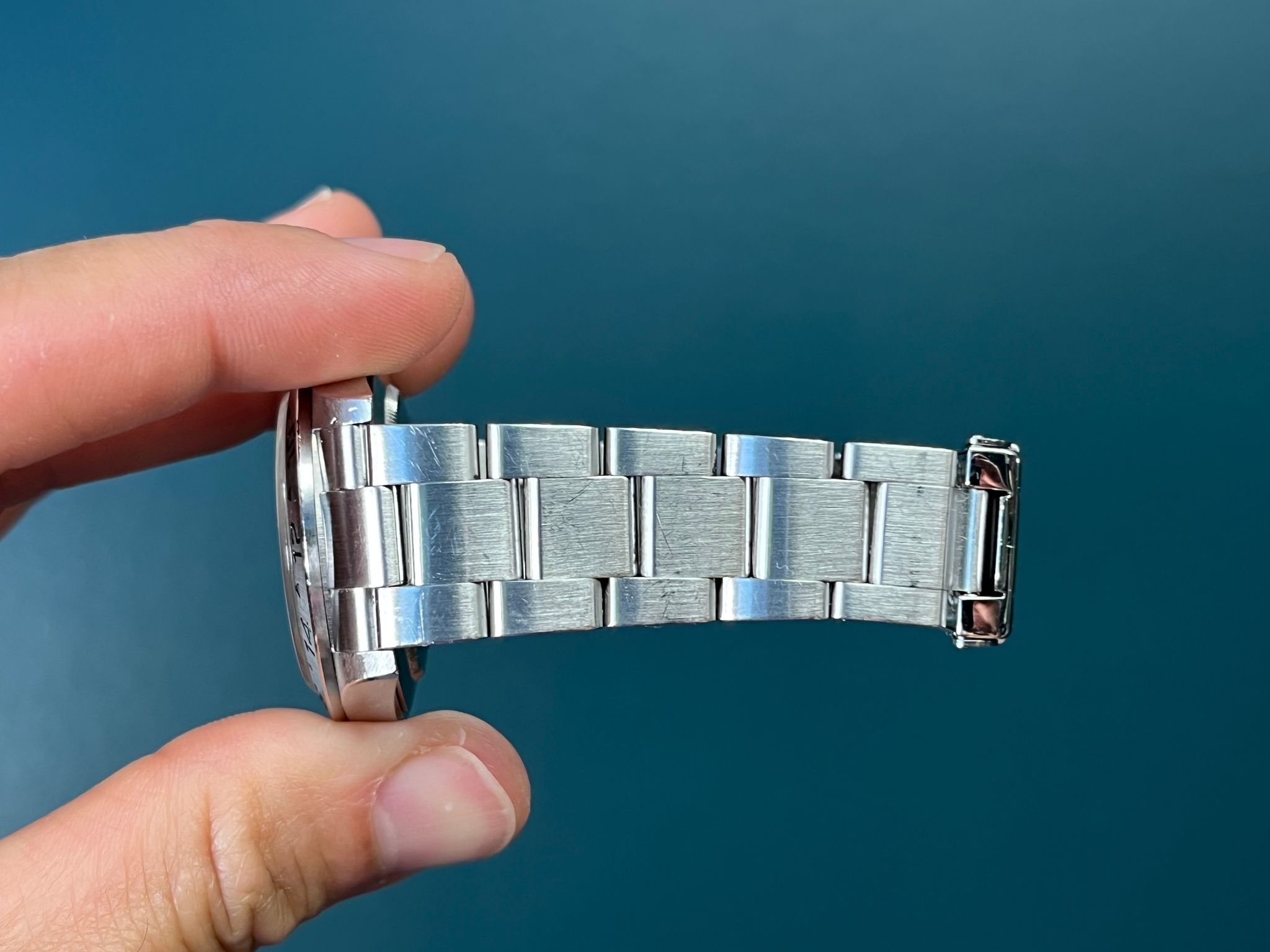 Today's example comes to us accompanied by its Box & Papers dated 2004.This example has an excellent no holes case. The no holes case shows sharp and even lugs. The dial is mint showing no wear and has matching hands. The bezel is also in good condition with all of its enamel present. The SEL bracelet has a total of 12 links with no stretch. An overall nice example for the astute collector.