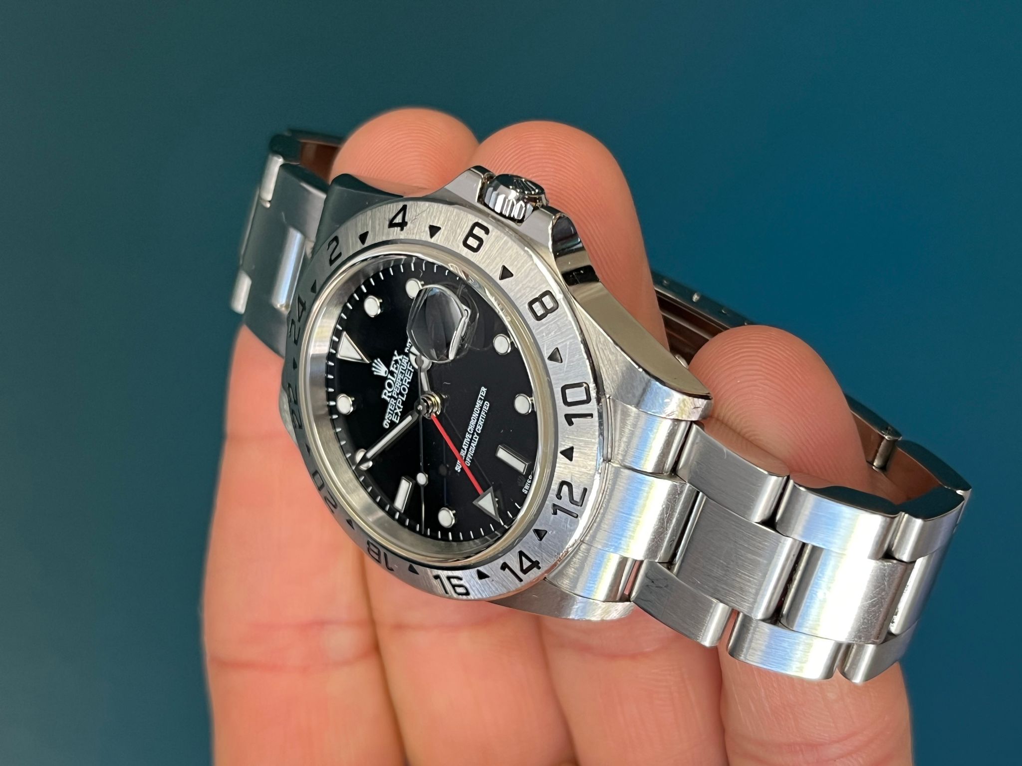 The Rolex 16570 Explorer II is a classic timepiece, featuring a black dial with luminous markers and hands. It stands out for its 24-hour bezel, which allows dual time zone tracking, making it ideal for travelers and adventurers. The watch is powered by the reliable Rolex Caliber 3185 movement and is renowned for its durability and timeless design. It holds a special place in Rolex's history and is a coveted collector's item.