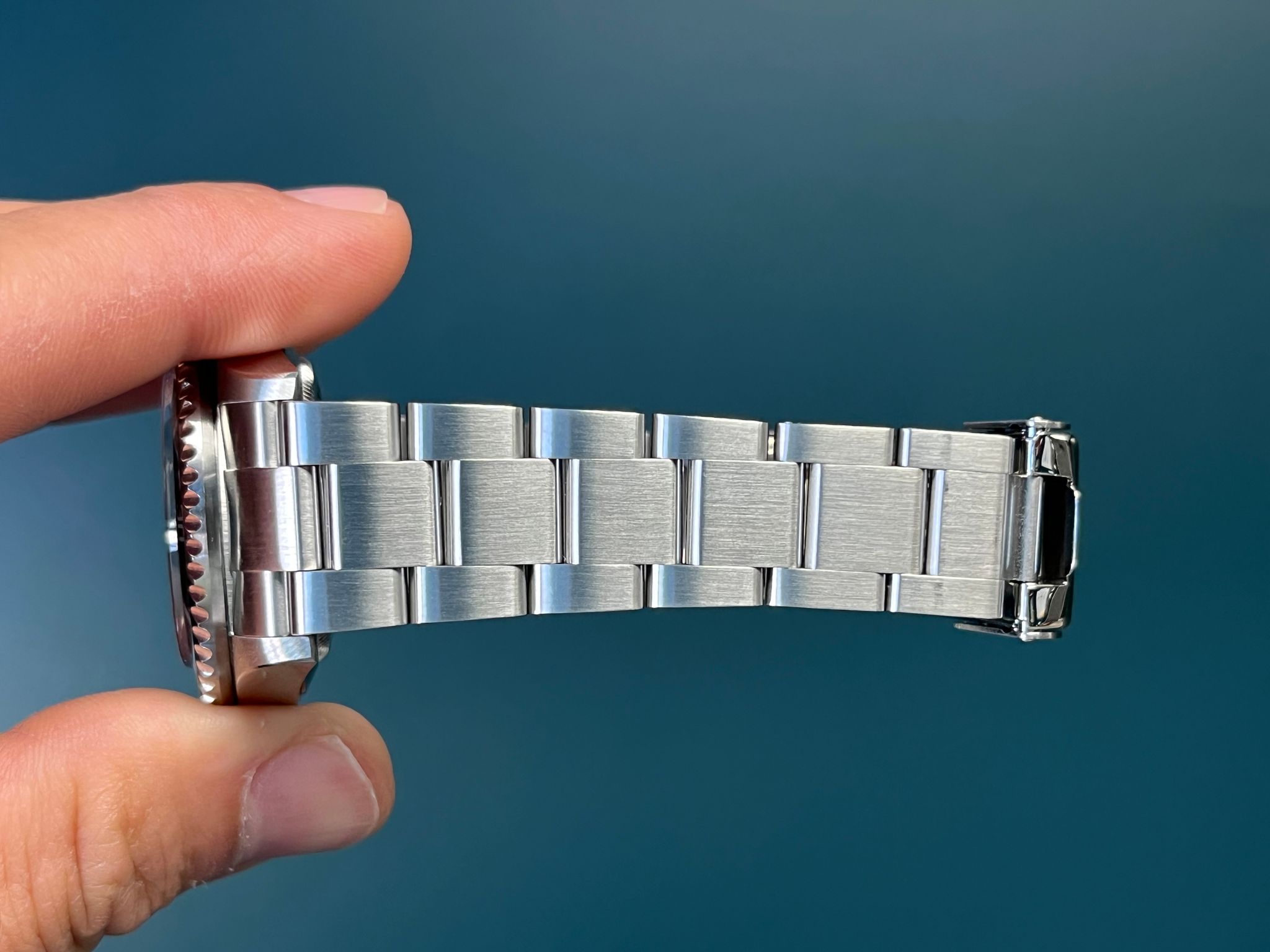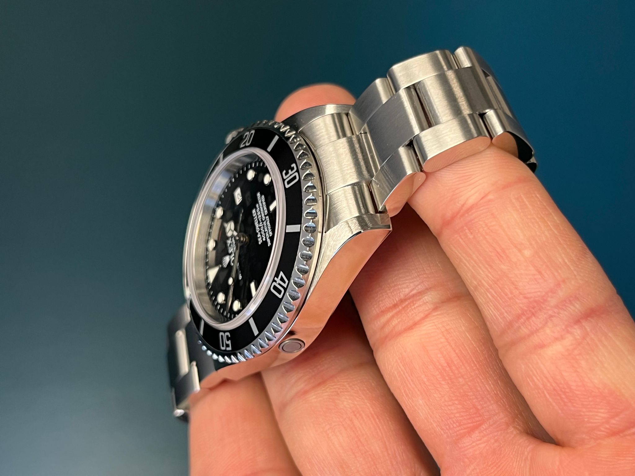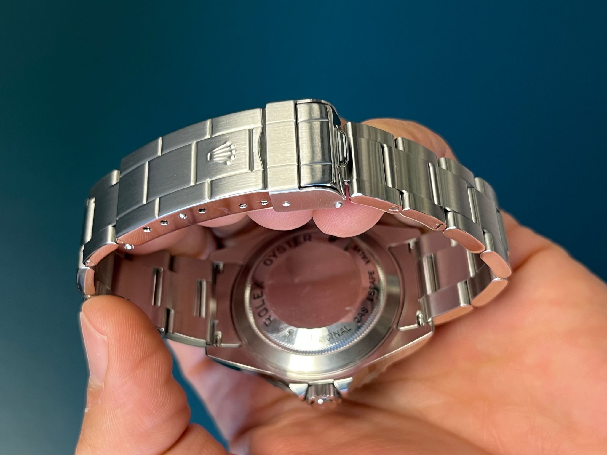 Today's example comes to us in excellent unpolished condition and complete with its original punched papers, tags, boxes, and some booklets and is in excellent mint retail ready condition. The no holes case is unpolished showing sharp chamfers. The dial and insert in excellent. The Solid End Link Bracelet is fully linked and shows no stretch. Here is a top condition example accompanied by all the trinkets and at an affordable price!