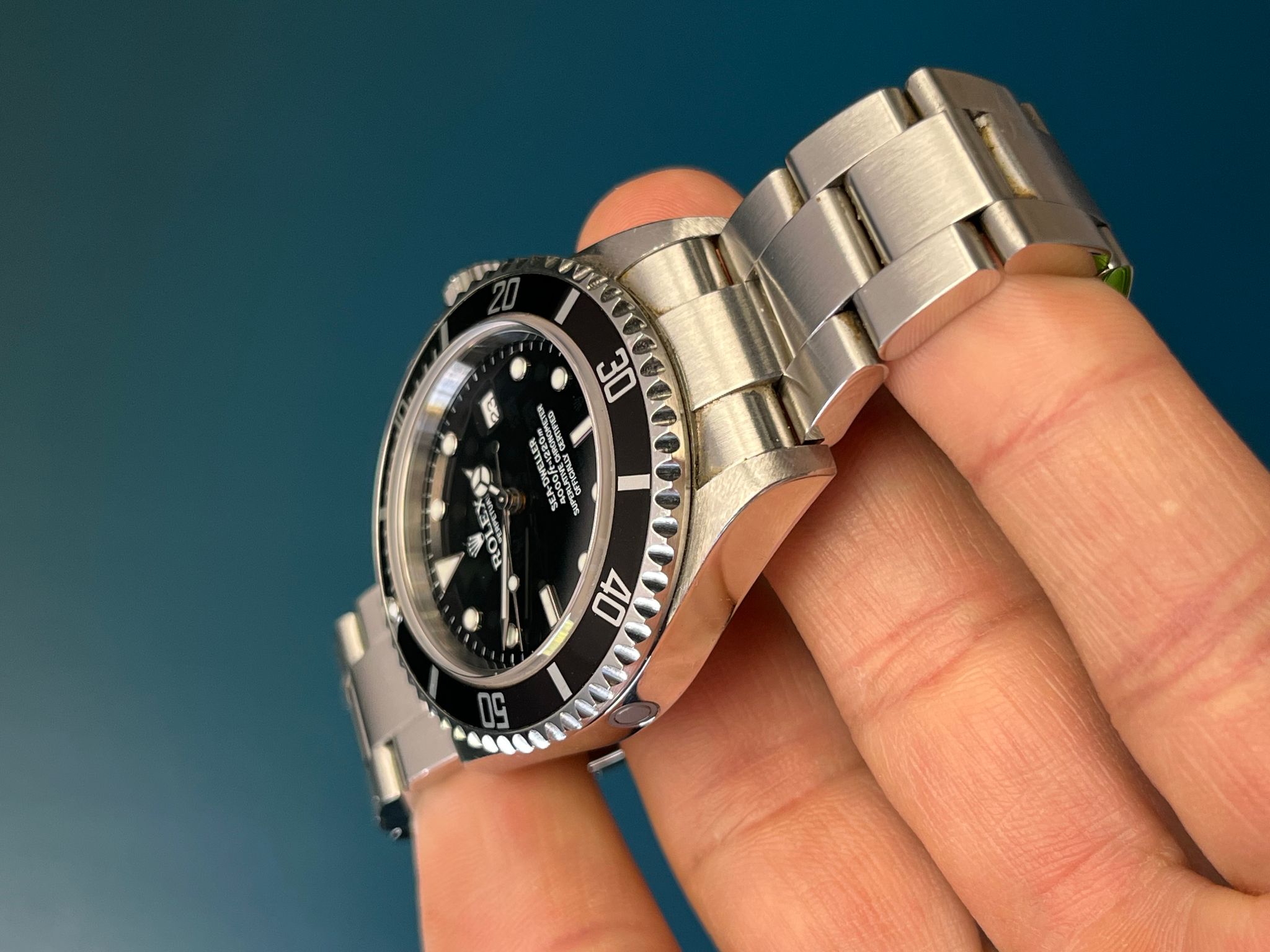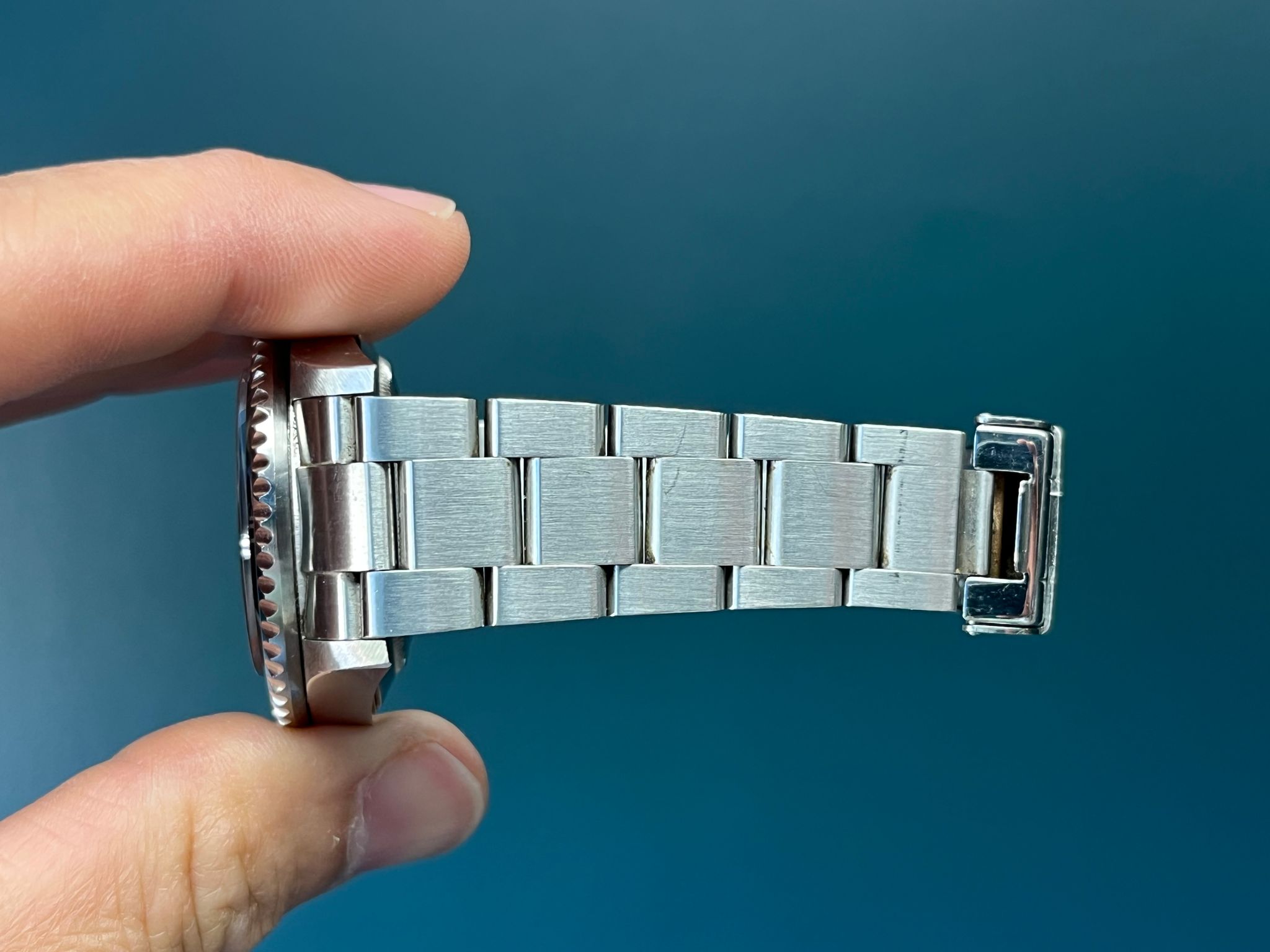 Today's example comes to us in excellent unpolished condition and complete with its original punched papers dated 7/31/04, tags, boxes, and some booklets and is in excellent retail ready condition. The no holes case is unpolished showing sharp chamfers. The dial and insert in excellent. The Solid End Link Bracelet is fully linked and shows no stretch. Here is a top condition example accompanied by all the trinkets and at an affordable price!