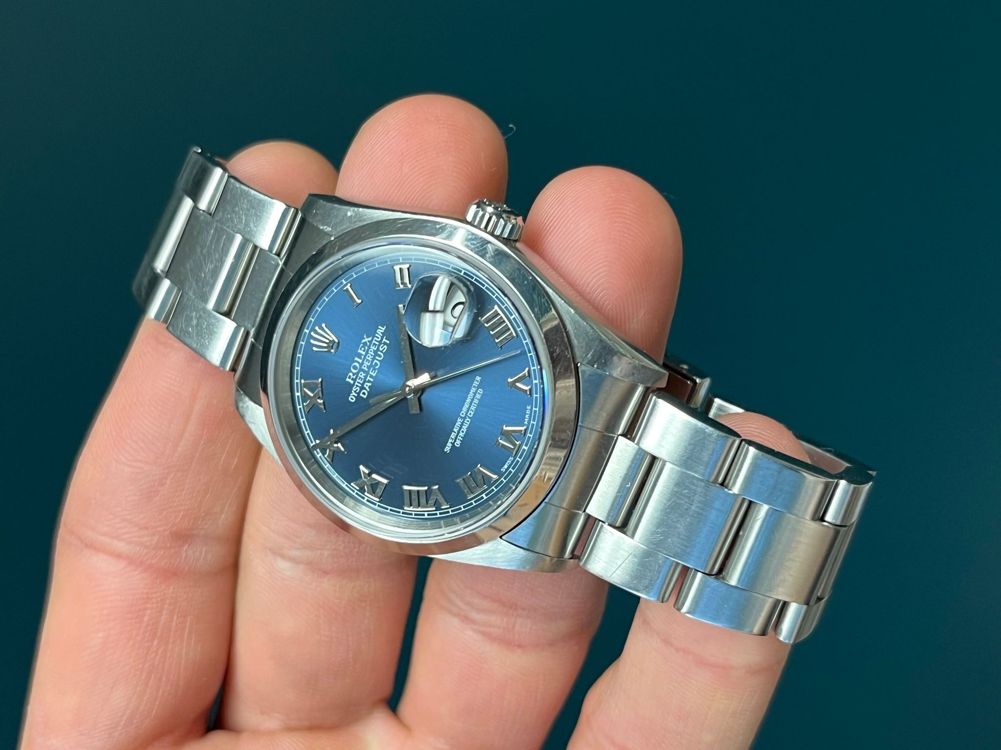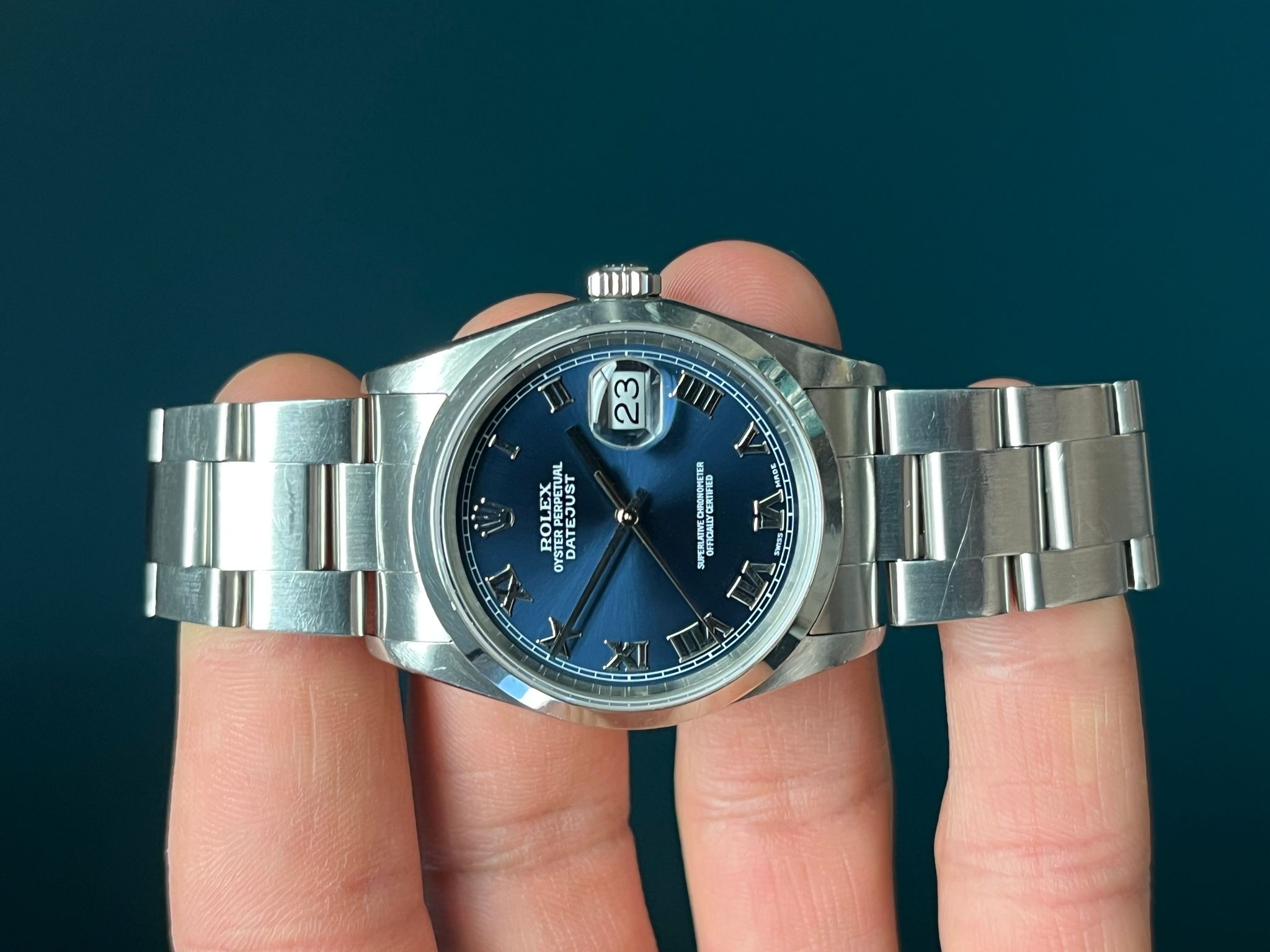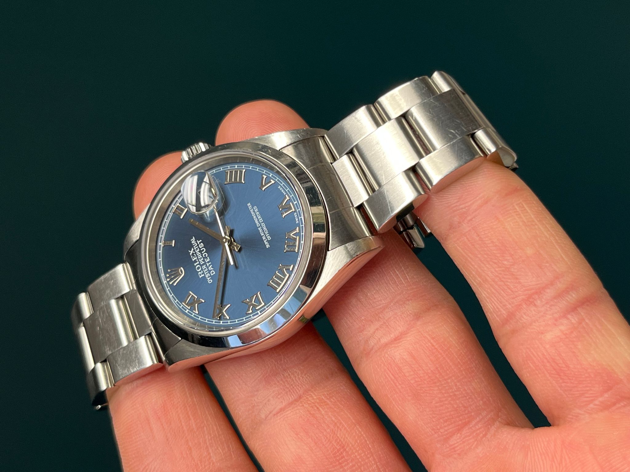 The Rolex Datejust reference 16200 exudes timeless elegance with its 36mm stainless steel case and rare Blue Roman numeral dial, epitomizing classical sophistication. Coming to us as a full complete set, this example features a date complication at 3 o'clock, this watch offers both style and practicality. Its smooth stainless steel bezel adds a touch of luxury, while the reliable automatic movement ensures precision timekeeping. Paired with a comfortable Oyster bracelet and boasting water resistance up to 100 meters, the Datejust 16200 is a versatile timepiece suitable for any occasion, coveted by collectors for its enduring appeal and craftsmanship.