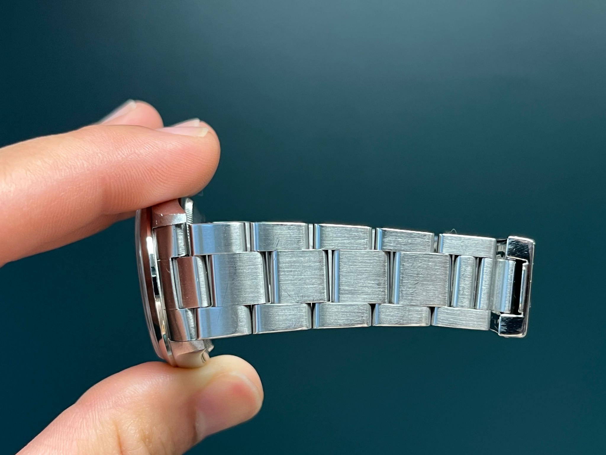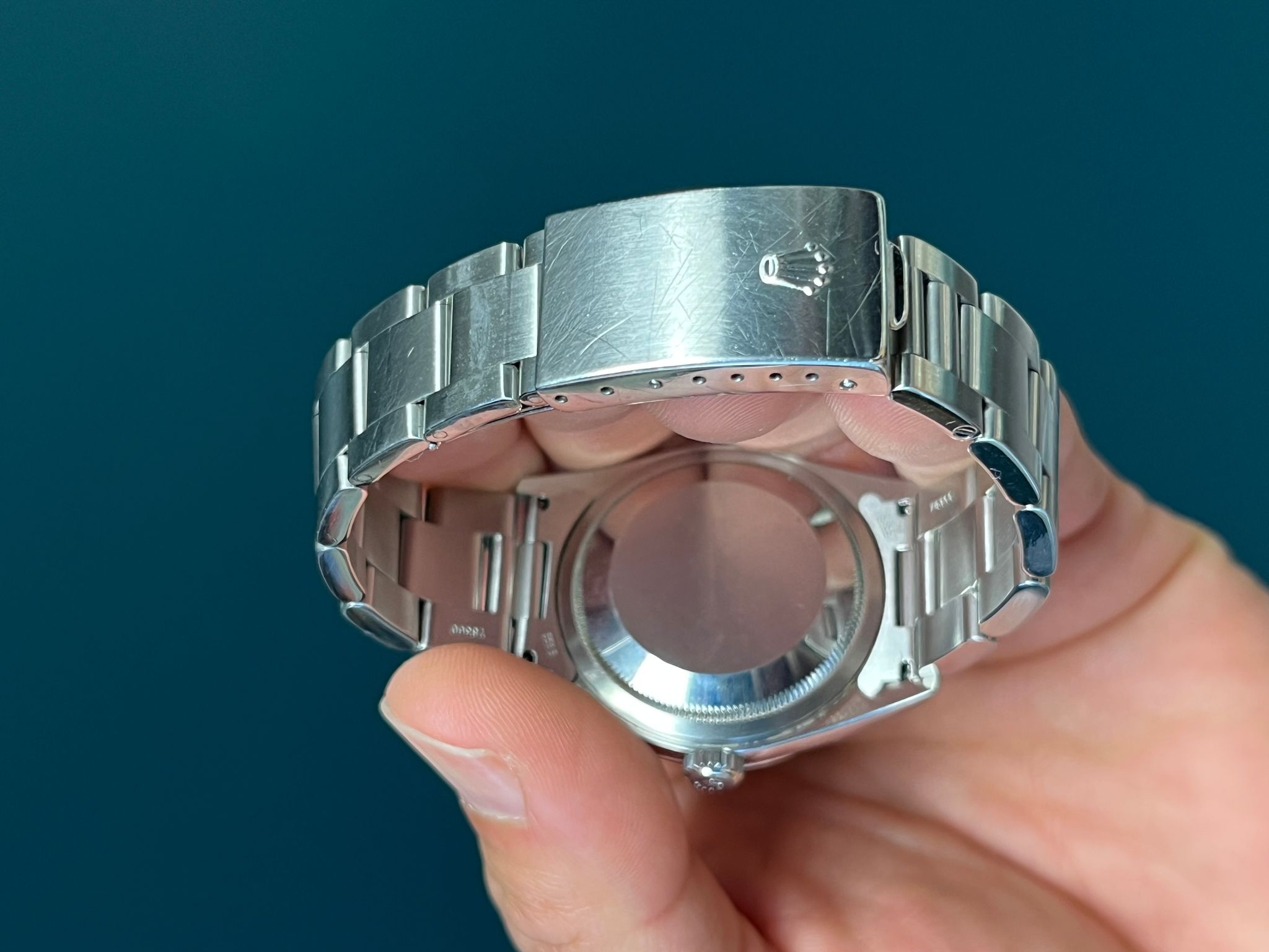 Todays example is in excellent condition. Accompanied by its full complete set with papers dated 12/15/04, the no holes case is nice and crisp. The Blue Roman dial is excellent. The solid link oyster bracelet has 12 total links and shows no stretch. Here is a lovely example with a rare dial variation and a great look! This full set includes its inner and outer box, wallets, punched papers, tags and some booklets and more.