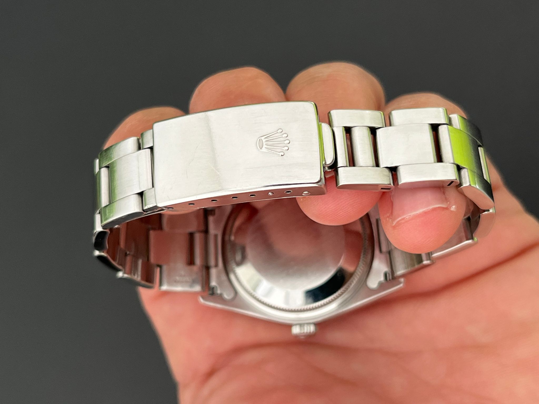 The Rolex Oyster Perpetual Air-King Reference 14000 with a Pink Salmon Dial is a stunning example of Rolex's commitment to timeless elegance and superior craftsmanship. This exquisite timepiece features a 34mm stainless steel case, perfectly balanced for both comfort and style. The unique Salmon-colored dial adds a touch of sophistication, beautifully contrasted by the sleek, minimalist design and luminous hour markers. Powered by the reliable Rolex Caliber 3000 automatic movement, the Air-King 14000 guarantees precise timekeeping and robust performance. The smooth bezel and classic Oyster bracelet enhance its refined aesthetic, making it suitable for any occasion. This particular model, with its rare and captivating salmon dial, stands out as a distinctive and highly sought-after addition to any watch collection, embodying the perfect blend of tradition and modernity.