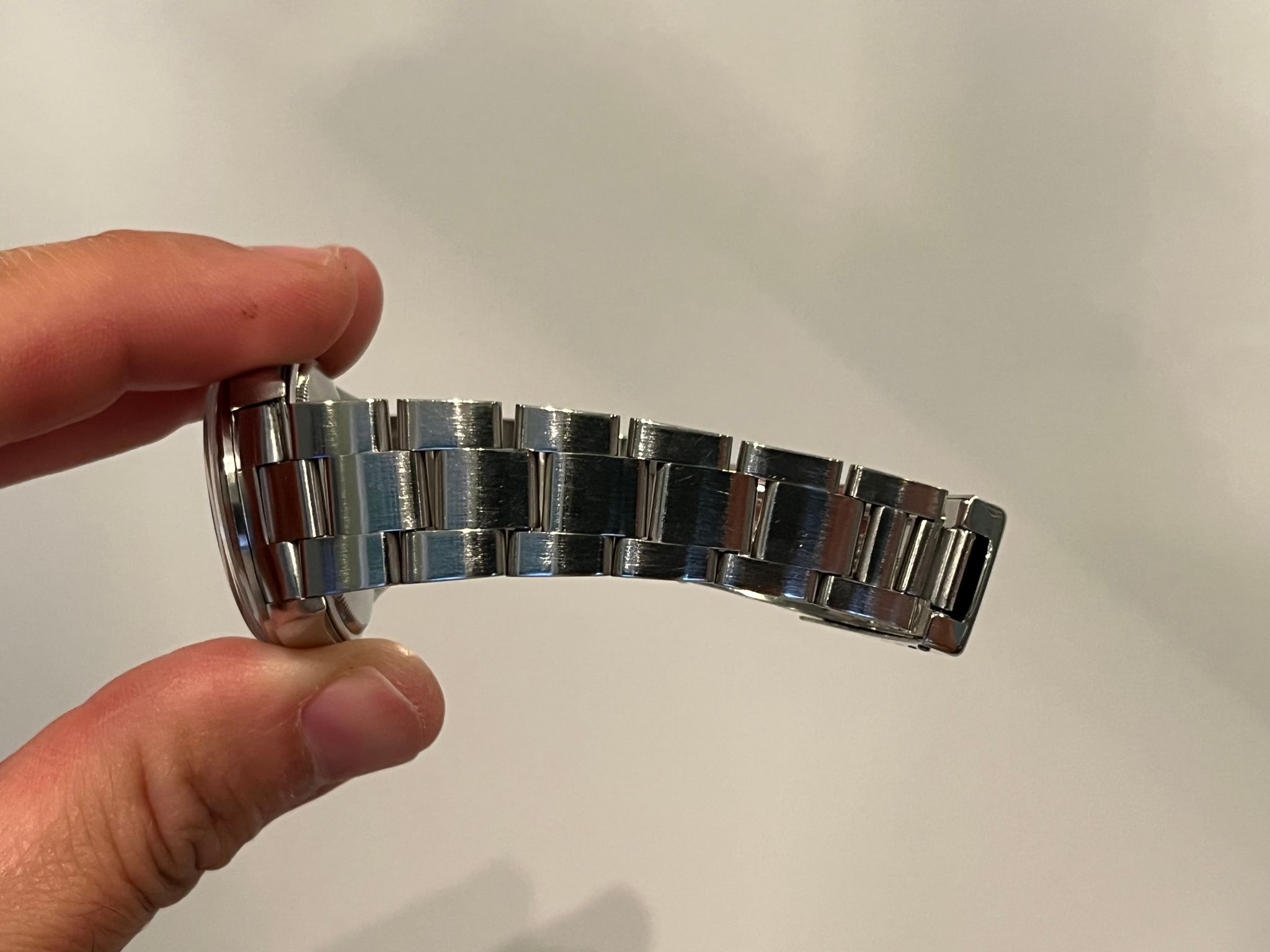 Today's example is in preowned condition. The no holes case is thick and even. The 3-6-9 Pink Salmon dial is excellent. The bracelet has 12 total links and shows light stretch. This example can benefit from a basic refinish.