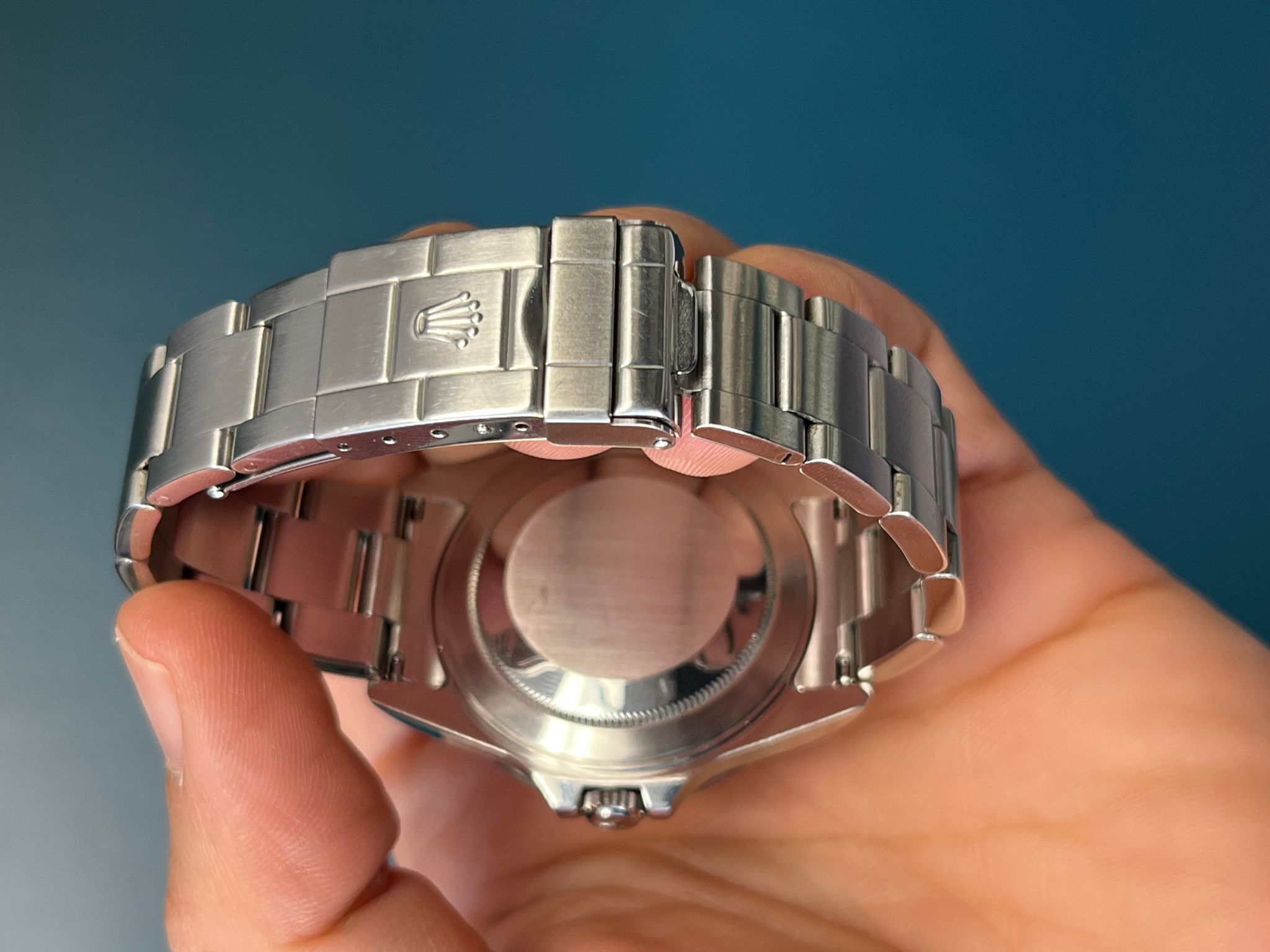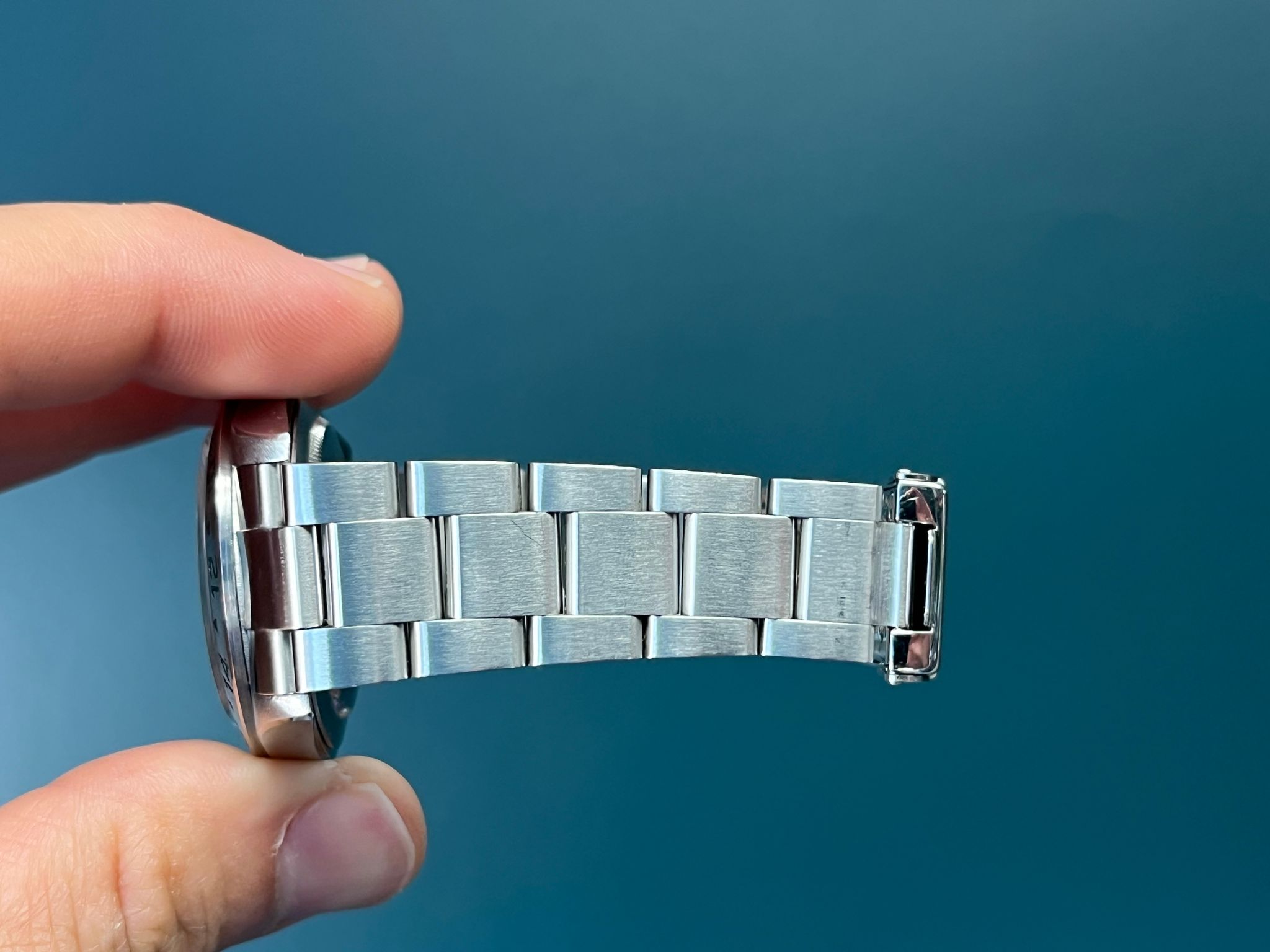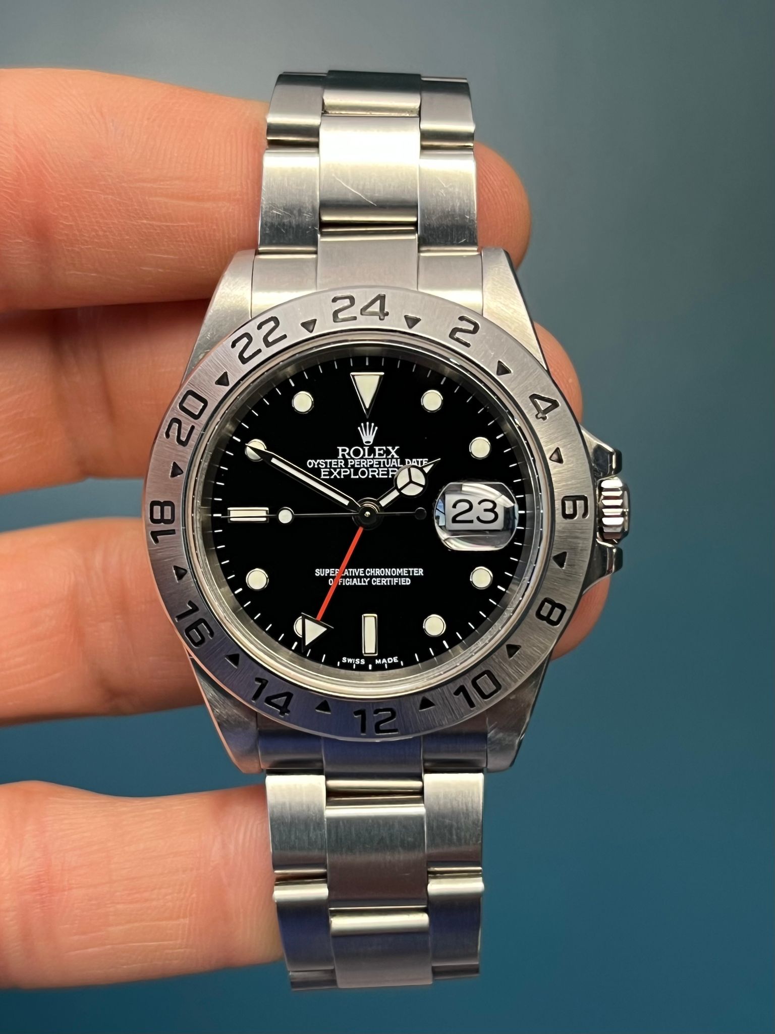 Today's example comes to us as a full complete set dated 7/05. This explorer comes with an excellent no holes case and sharp crisp bezel. The dial is very nice showing no visible wear and has matching hands. The no holes case shows thick and even lugs while the bezel has all of its enamel present. The SEL bracelet has a total of 12 links with no stretch. This example comes with its original box, papers, booklets, tags and more.