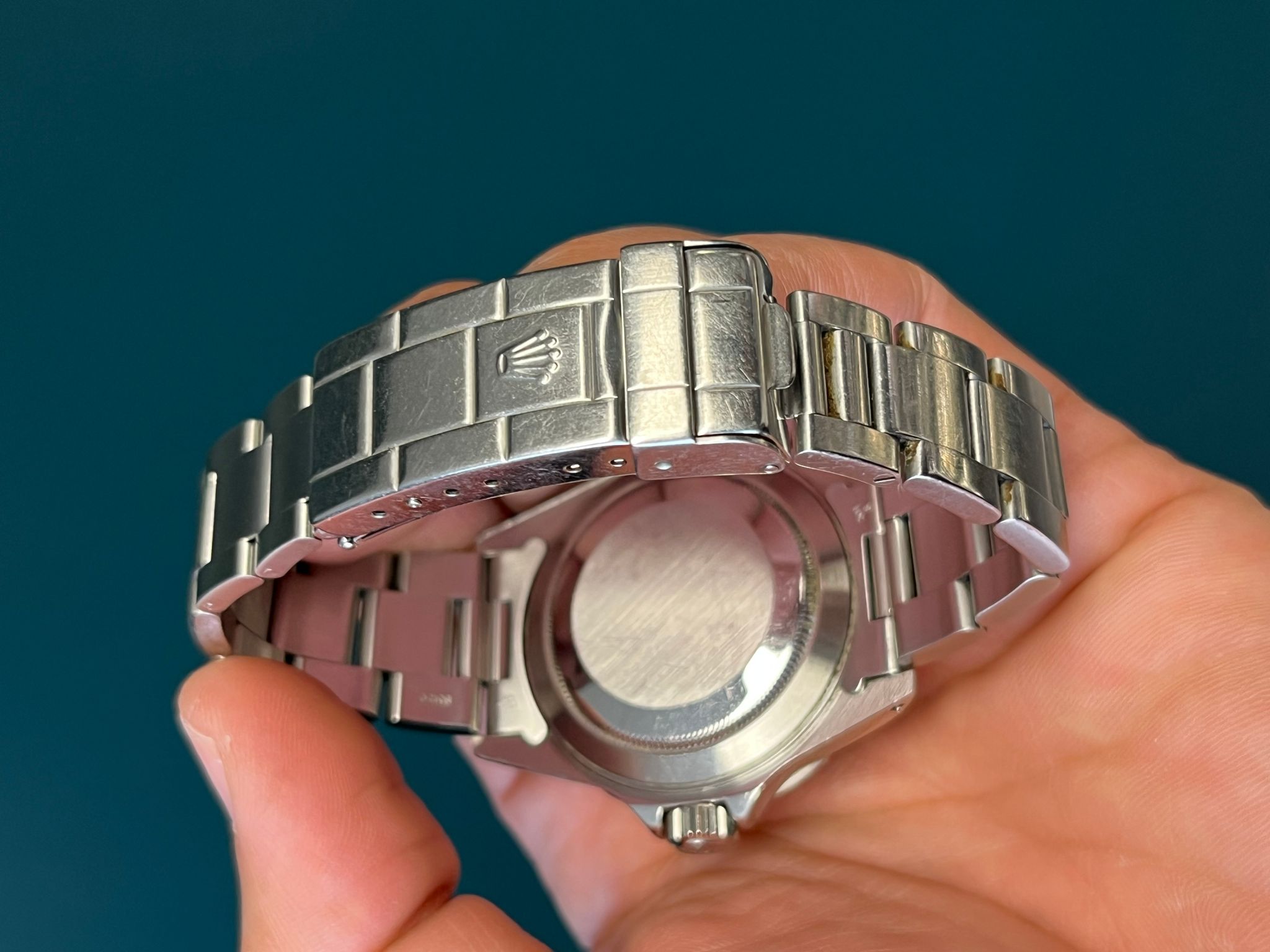 This example comes with its box and punched papers dated 9/14/05. The watch itself is in nice pre-owned condition. The case is excellent with thick sharp lugs. The insert is in nice condition. The dial is excellent with matching patina. The bracelet has 12 links + div ext. and shows no stretch. Here is a great example with box & papers with a great look.