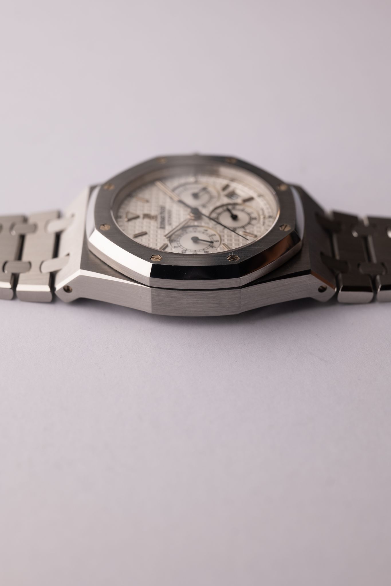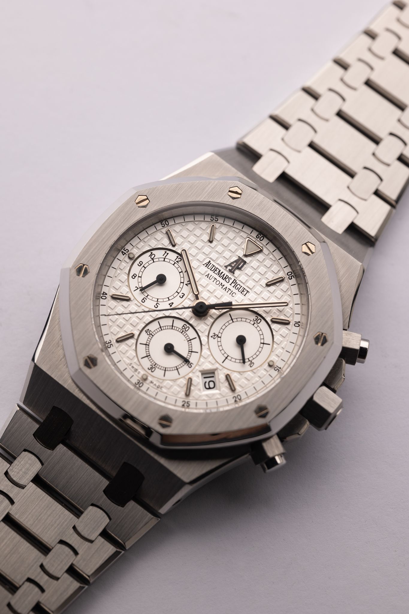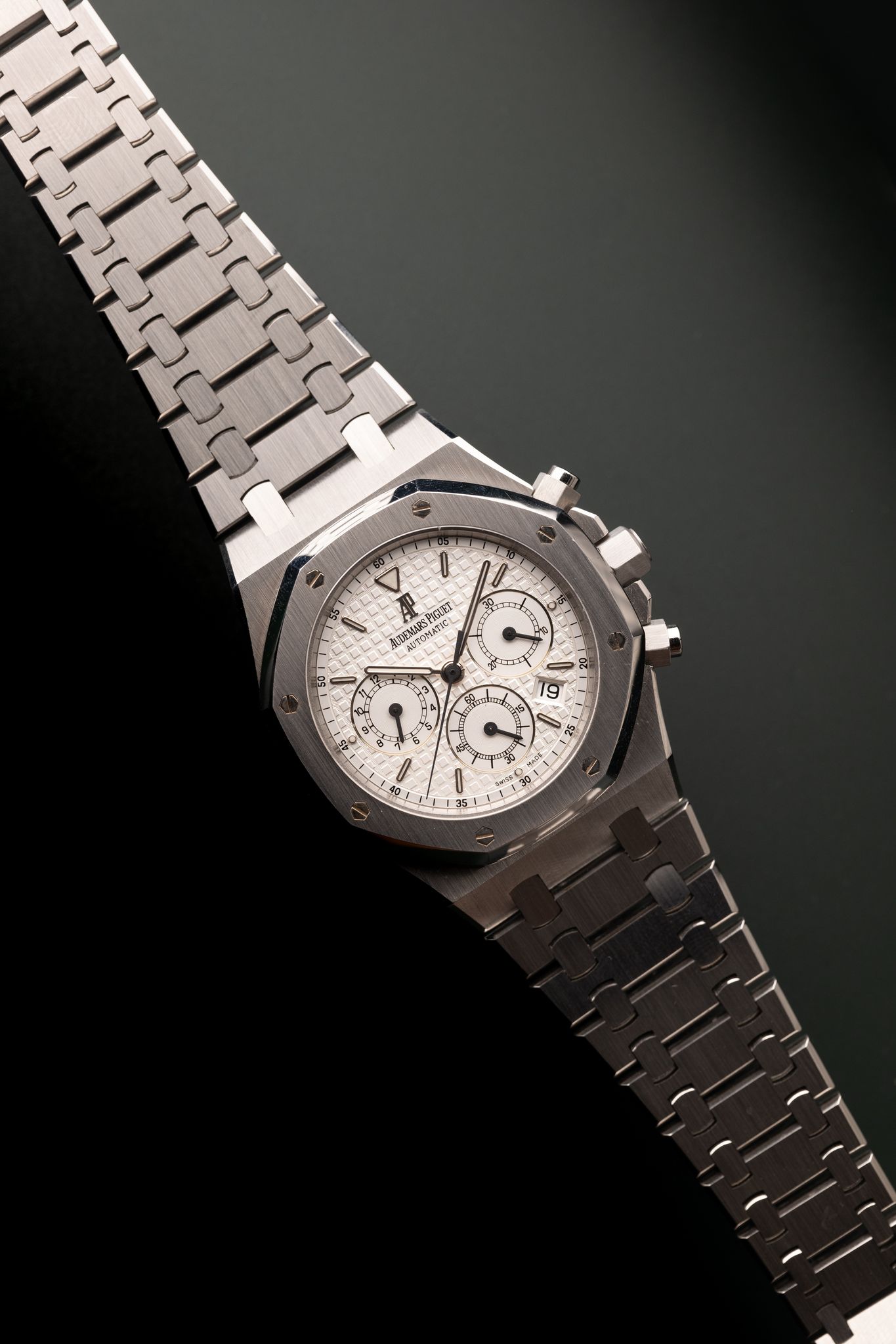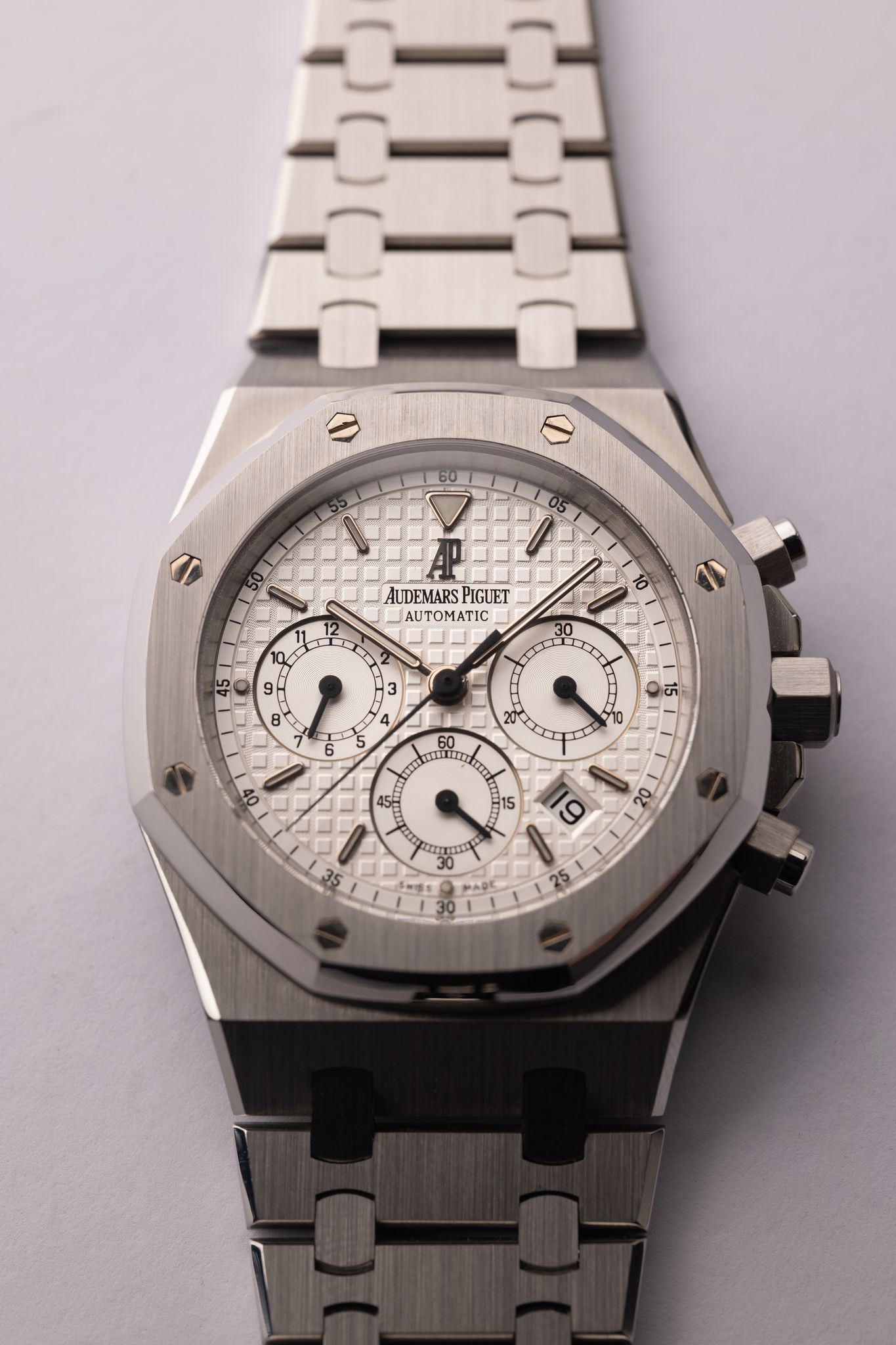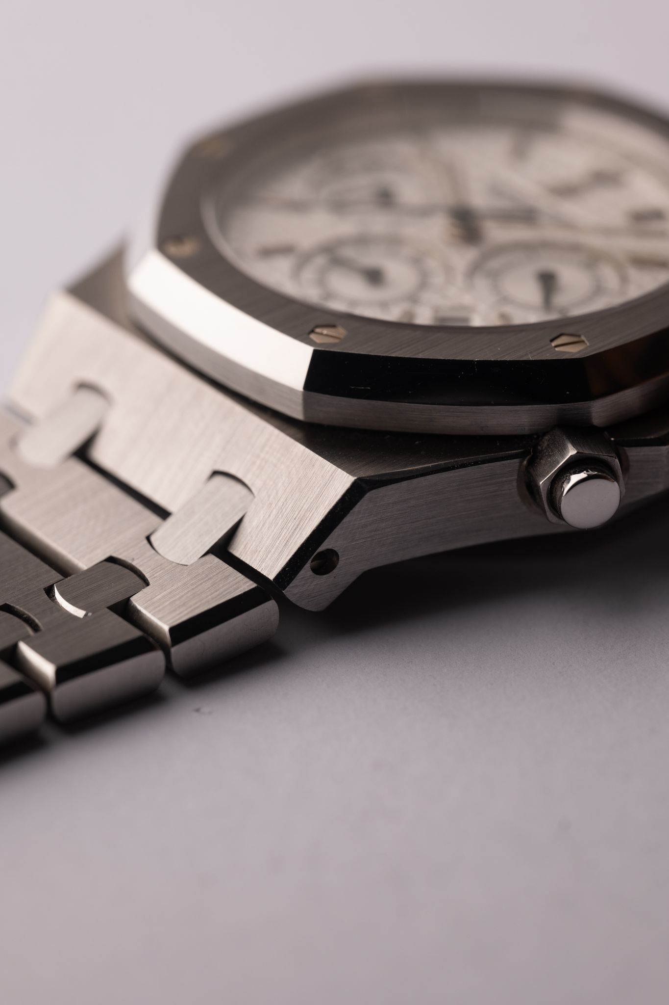 The 25860ST is most famously worn by grand chess master Garry Kasparov who would wear it during his chess matches, however this reference specifically in white also has a special place in Curtis’ heart as it was the first AP reference he purchased for himself. The later chronograph Royal oak always felt too big, in both the dial and the case as the size ballooned to 41mm. The 39mm Chrono wears like a 41mm due to its heft and amount of steel used however the case and dial have excellent proportions and make this the best AP chronograph in our opinion. This watch has previously been polished but remains in excellent condition and comes with an archive extract from AP.