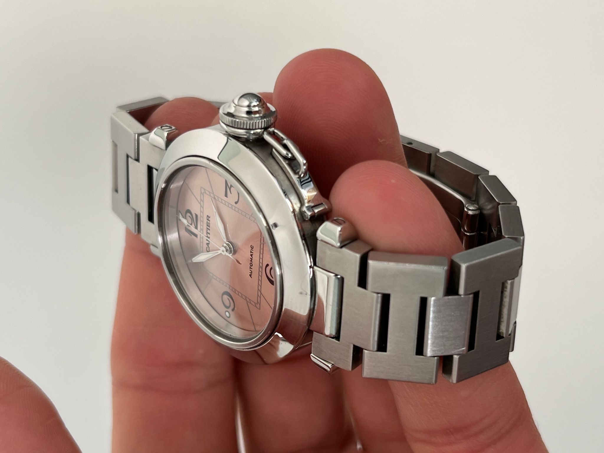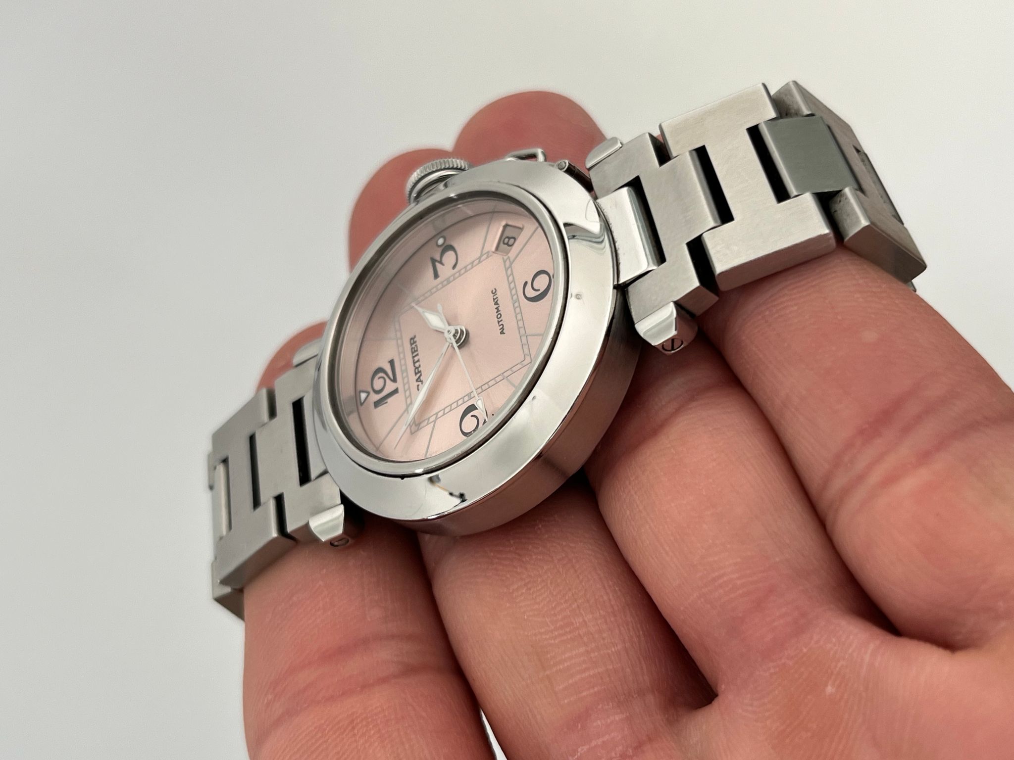 The Cartier Pasha Reference 2324 with a pink salmon dial is an exquisite embodiment of luxury and distinctive design, perfect for those who appreciate fine craftsmanship. Encased in a polished stainless steel case, this timepiece features a captivating pink salmon dial that adds a touch of warmth and elegance. The dial is adorned with bold black Arabic numerals and blued steel hands, ensuring optimal readability and a striking contrast. Powered by a precise automatic movement, the watch offers reliable performance and timeless style. Signature elements like the screw-down crown cap attached by a small chain and the date window at the 4 o'clock position enhance its unique appeal. This exceptional piece comes as a full complete set, including the original box, papers, and accessories, making it a coveted addition for collectors and enthusiasts alike. The Cartier Pasha Reference 2324 with a pink salmon dial is not just a watch—it's a statement of sophistication and enduring elegance.