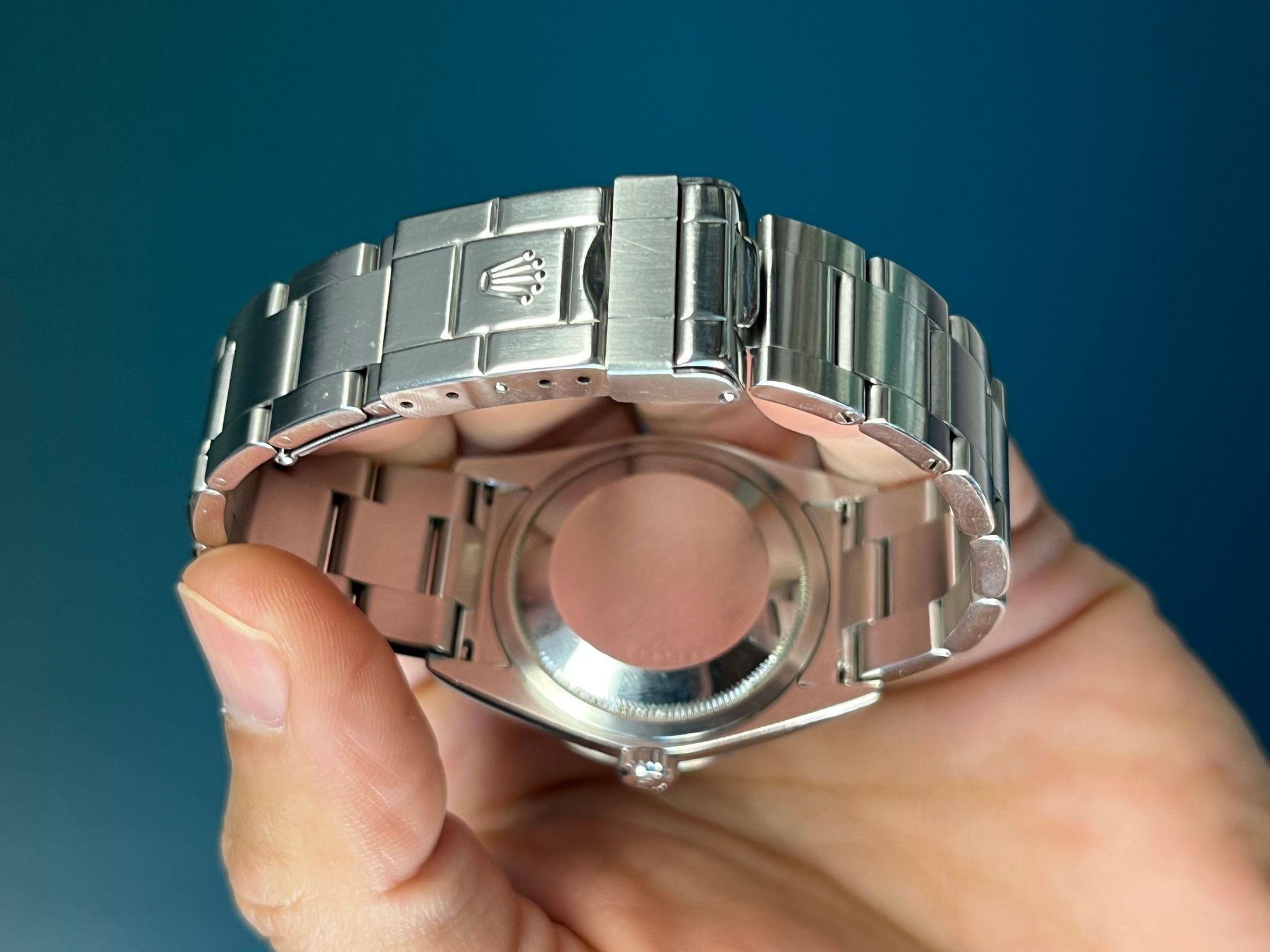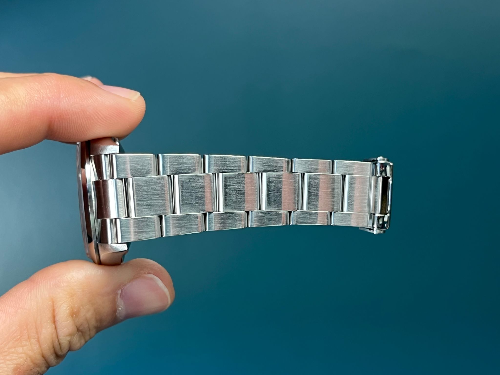 Today's example comes to us as a full set with its original box, papers dated 9/06, tags and some booklets. The no holes case is unpolished with sharp thick lugs. The dial is mint and shows no wear. The solid end link bracelet is fully linked and shows no stretch. This example is in excellent condition!