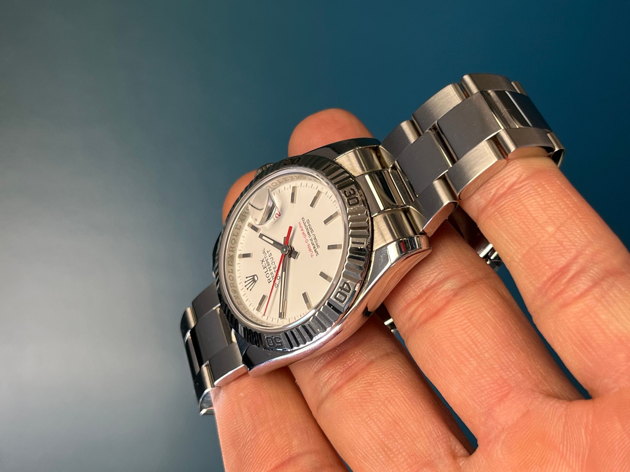 This example features a crisp white dial with bold luminous hour markers, a red seconds hand, and matching red text, adding a touch of vintage flair to its modern design. The rotating bezel functions as a practical timing tool, while the Oyster case and bracelet ensure durability and comfort.