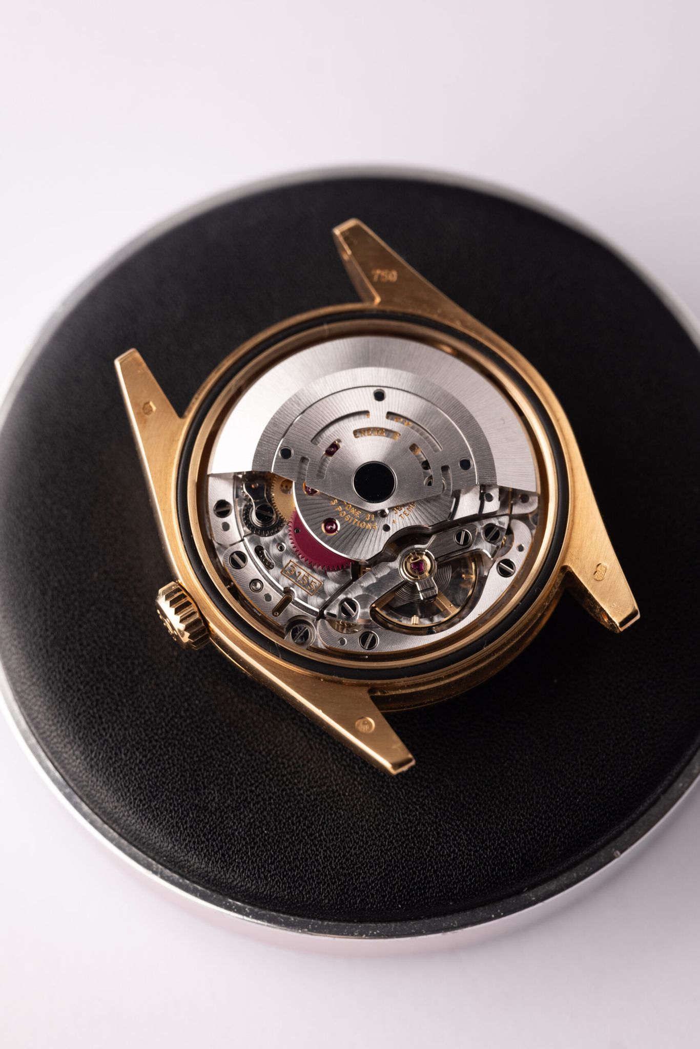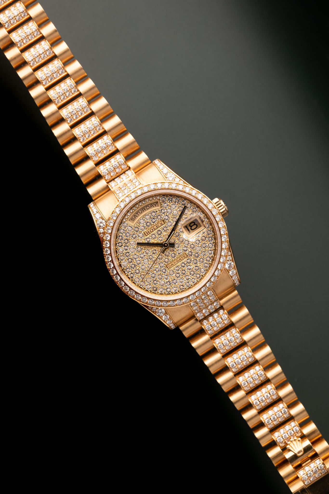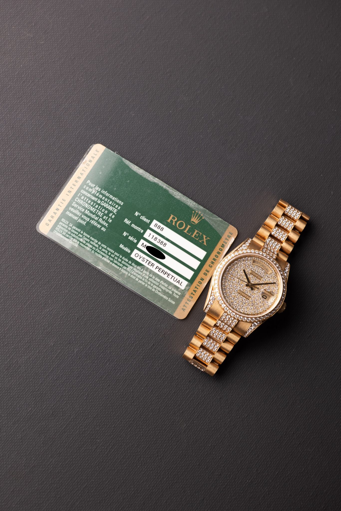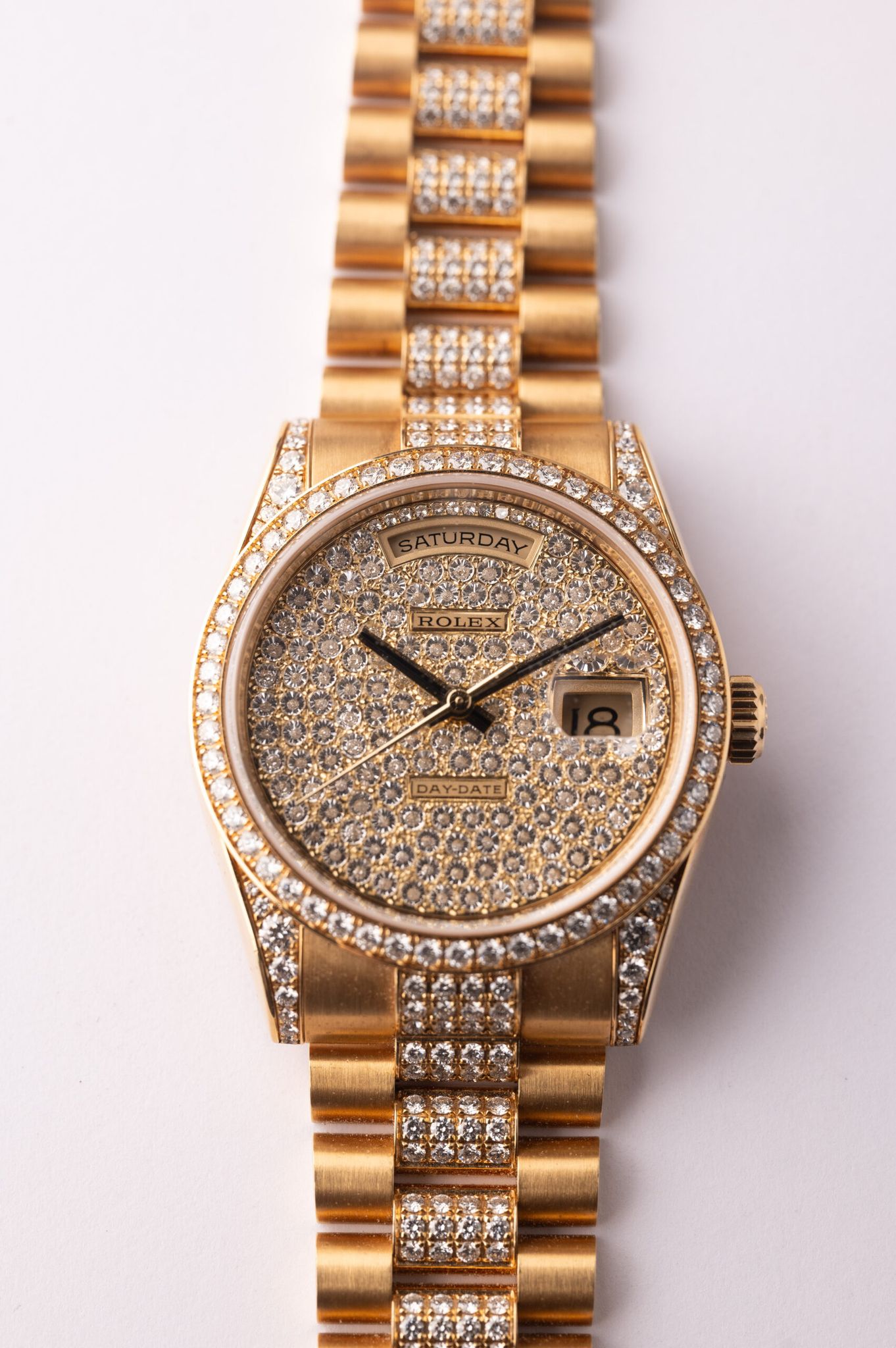 Having been worn by the King of Rock and United States’ President both, the Day-Date, since its 1950’s release, remains one of Rolex’s most popular and prestigious marquees; though made only from precious metal, additional layers of luxury are often granted by gems, exotic stones, and often a combination of both. This modern Day-Date boasts 18k of Yellow Gold and 36mm of Diamonds, a Diamond Pavé dial, Golden Day at Noon, whose bracelet is a Diamond-set president. Diamonds are no stranger to the Day-Date platform however it is usually only on the dial. To find a factory diamond dial + bezel + and bracelet along with the guarantee card is not an easy task and makes this one of the rarest combinations out there.