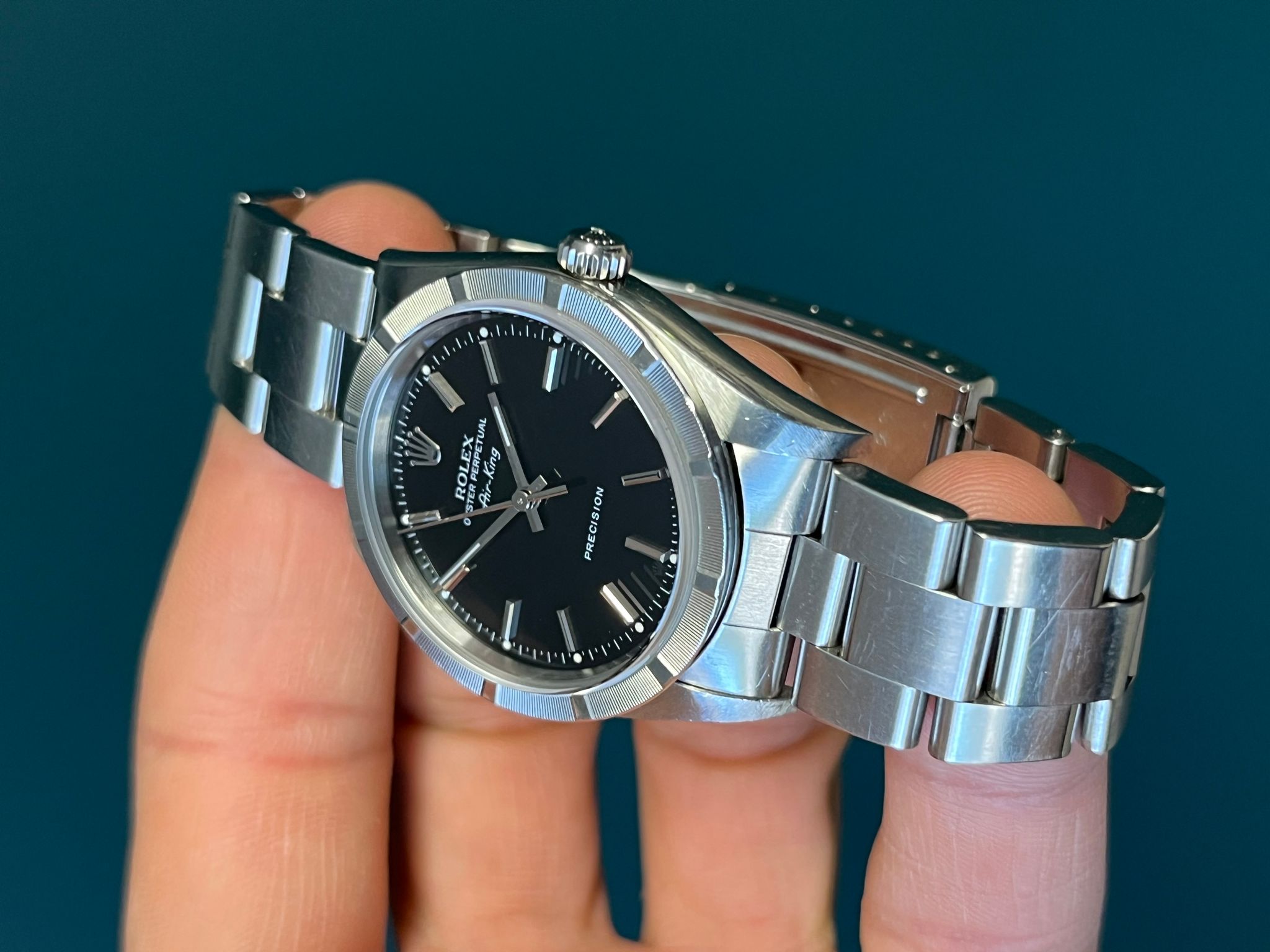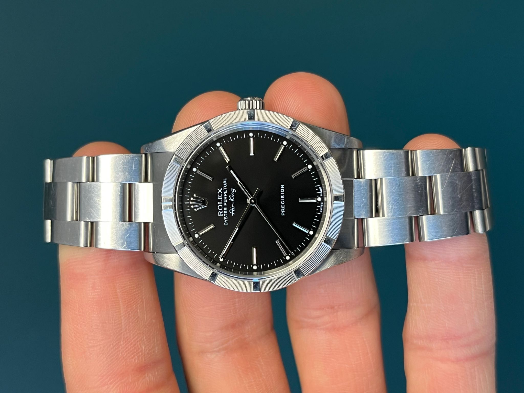 The Rolex Air King Reference 14010 with a black dial is a distinctive and elegant timepiece that seamlessly merges classic design with modern aesthetics. The watch features a stainless steel case with a diameter of 34mm, showcasing Rolex's commitment to precision craftsmanship and enduring style. The standout element is its black colored dial, a unique and eye-catching choice that adds a touch of warmth and sophistication. The dial is adorned with luminous hour markers and hands, ensuring excellent legibility in any lighting condition. Powered by the reliable Rolex Caliber 3130 movement, the Air King 14010 promises accurate timekeeping and durability. With its balanced blend of vintage charm and contemporary flair, this Rolex timepiece stands as a testament to the brand's timeless appeal and unwavering commitment to quality.