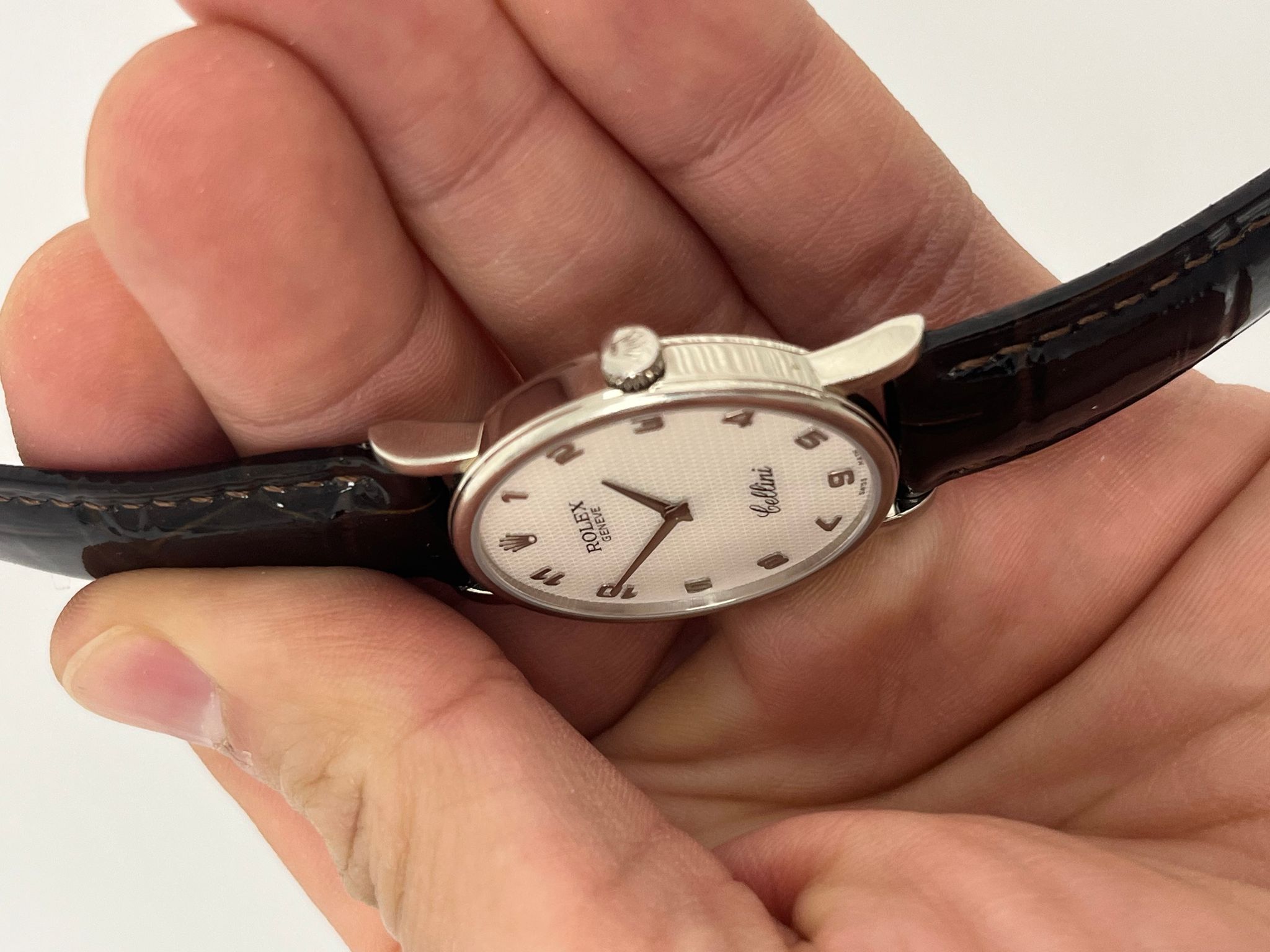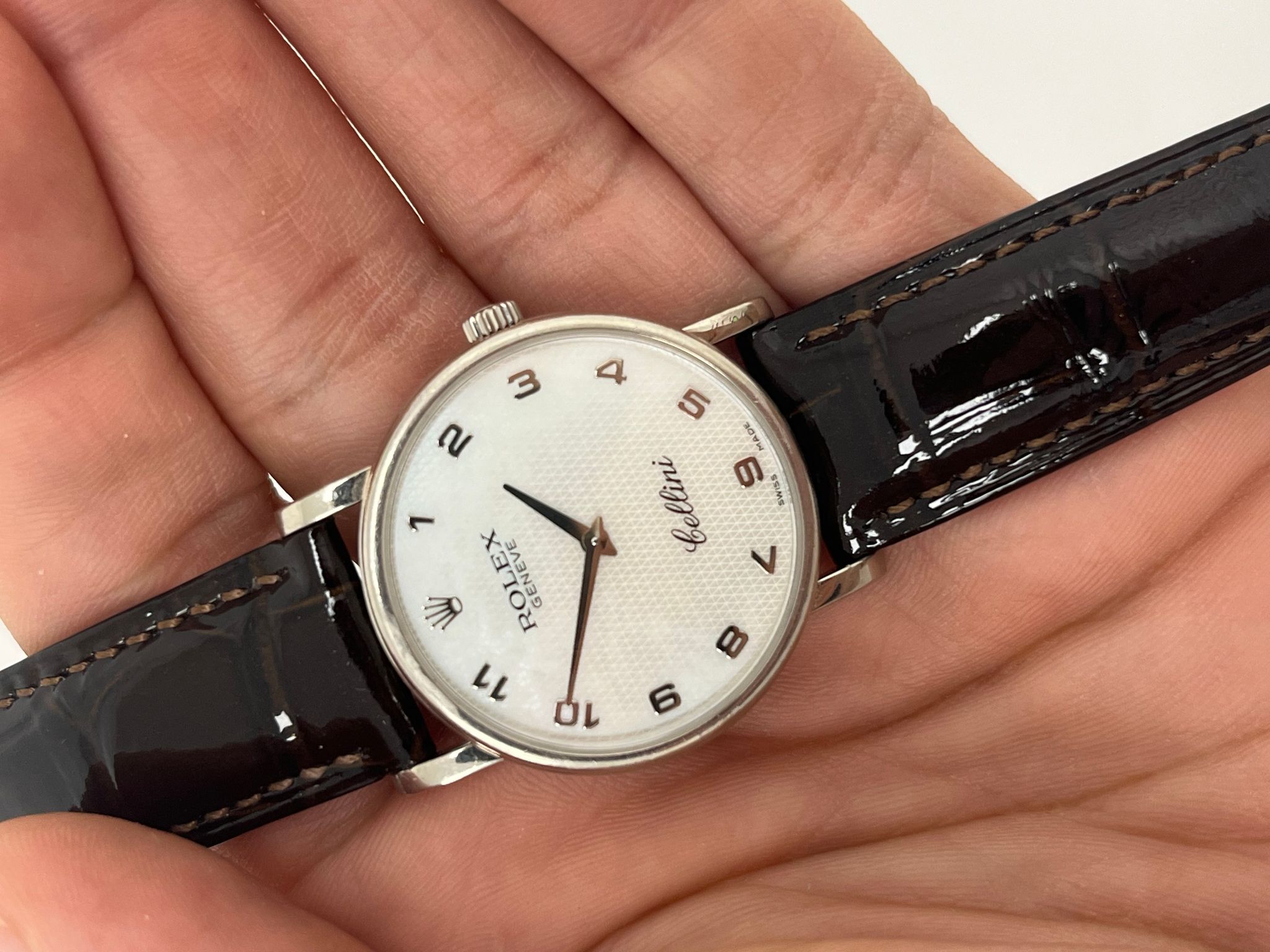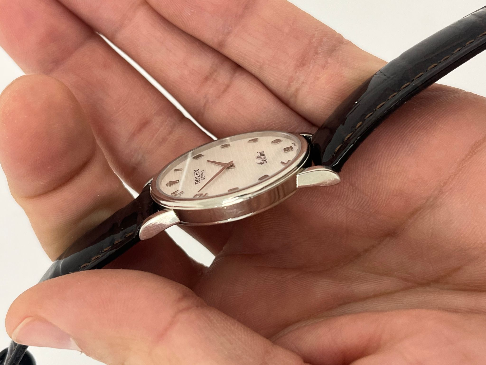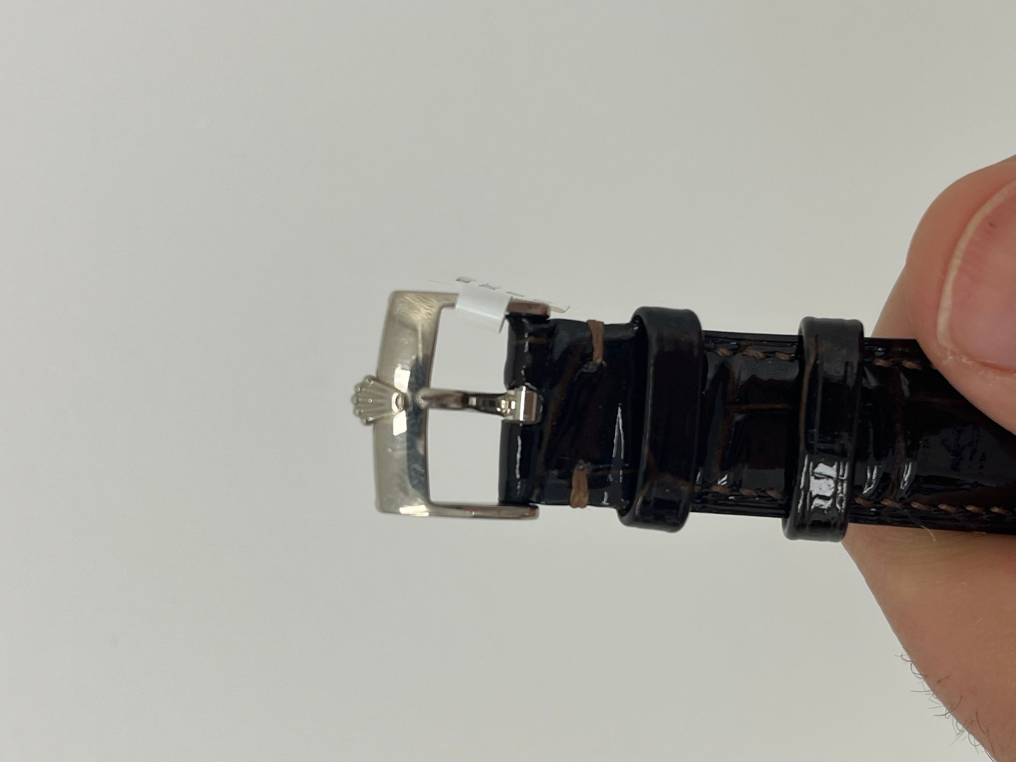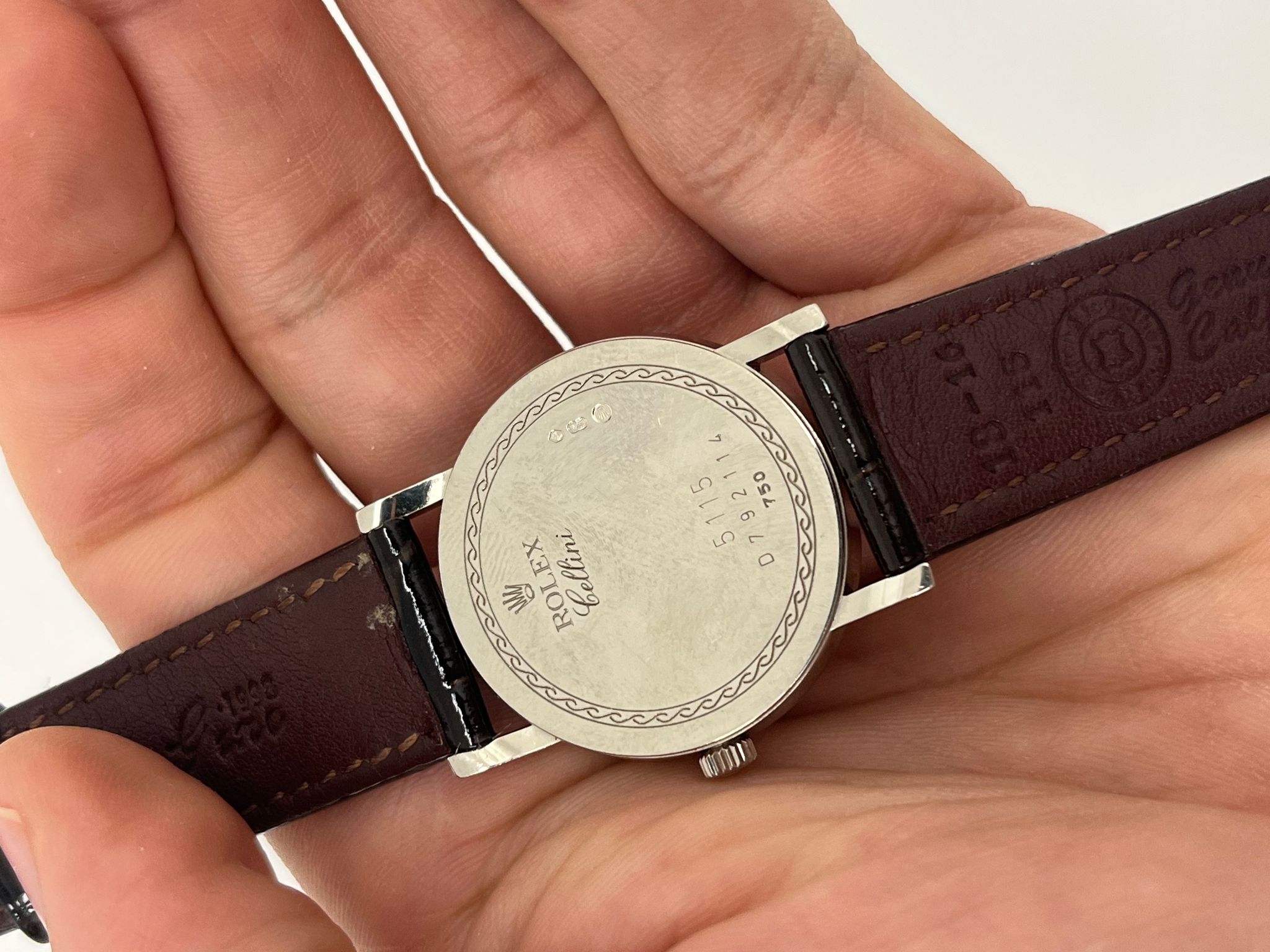 The Rolex Cellini Reference 5115/9 is a distinguished and elegant timepiece that epitomizes timeless sophistication. Encased in lustrous 18ct white gold, its classic round shape exudes refinement, while the minimalist white dial features sleek white gold hour markers and hands, creating a harmonious and legible display. The manual-winding movement within ensures precision and reliability, attesting to Rolex's commitment to horological excellence. The watch is adorned with a black leather strap, adding a touch of understated luxury to the overall design. Watch comes with its original card dated December 2007. With its understated yet luxurious aesthetic, the Rolex Cellini Reference 5115/9 is a testament to the brand's tradition of crafting exquisite timepieces for those who appreciate the finer things in life.