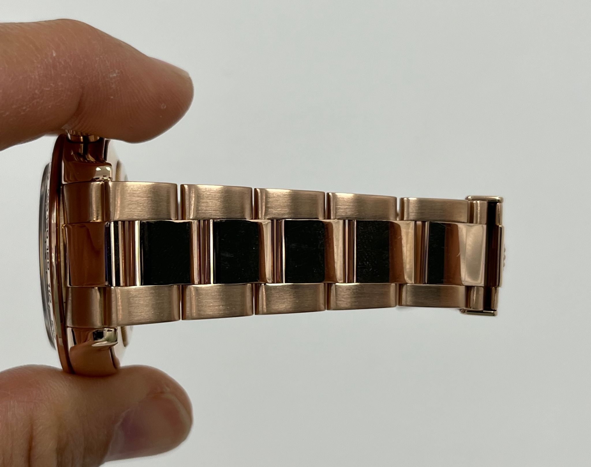 The Rolex Daytona Reference 116505 in 18k Everose gold with a striking chocolate dial is a masterpiece of luxury and performance. This iconic chronograph, designed for precision and elegance, features a rich chocolate brown dial with contrasting black subdials, luminous hour markers, and the signature red "Daytona" text above the 6 o’clock counter. The 40mm Everose gold case exudes warmth and sophistication, complemented by a matching Oyster bracelet for a seamless and refined aesthetic. Powered by the in-house Caliber 4130, this self-winding movement ensures exceptional accuracy and reliability with a robust 72-hour power reserve. Complete with its original papers, this Daytona 116505 is a symbol of exclusivity and prestige, perfect for collectors and enthusiasts seeking a timeless blend of sportiness and elegance.