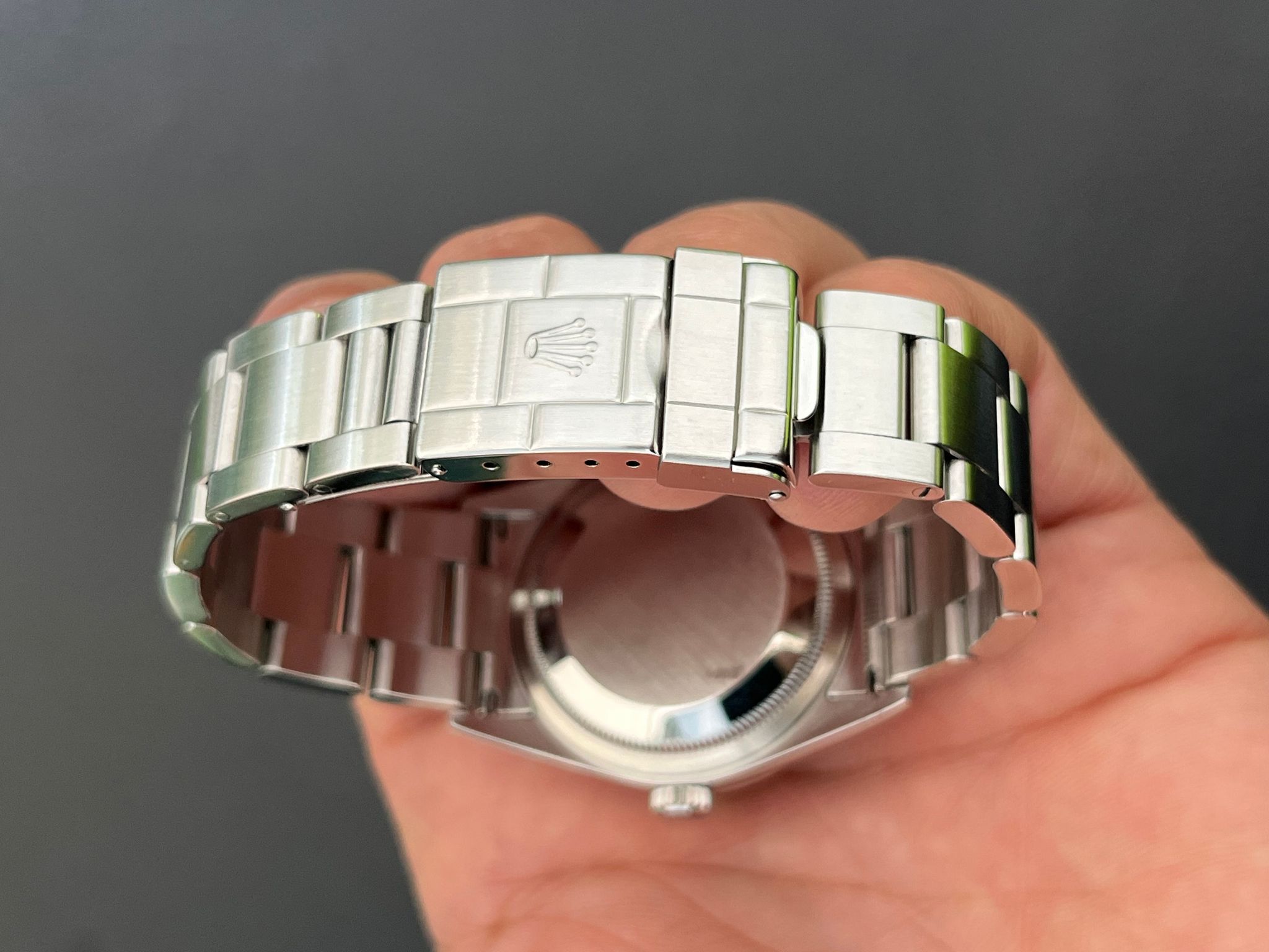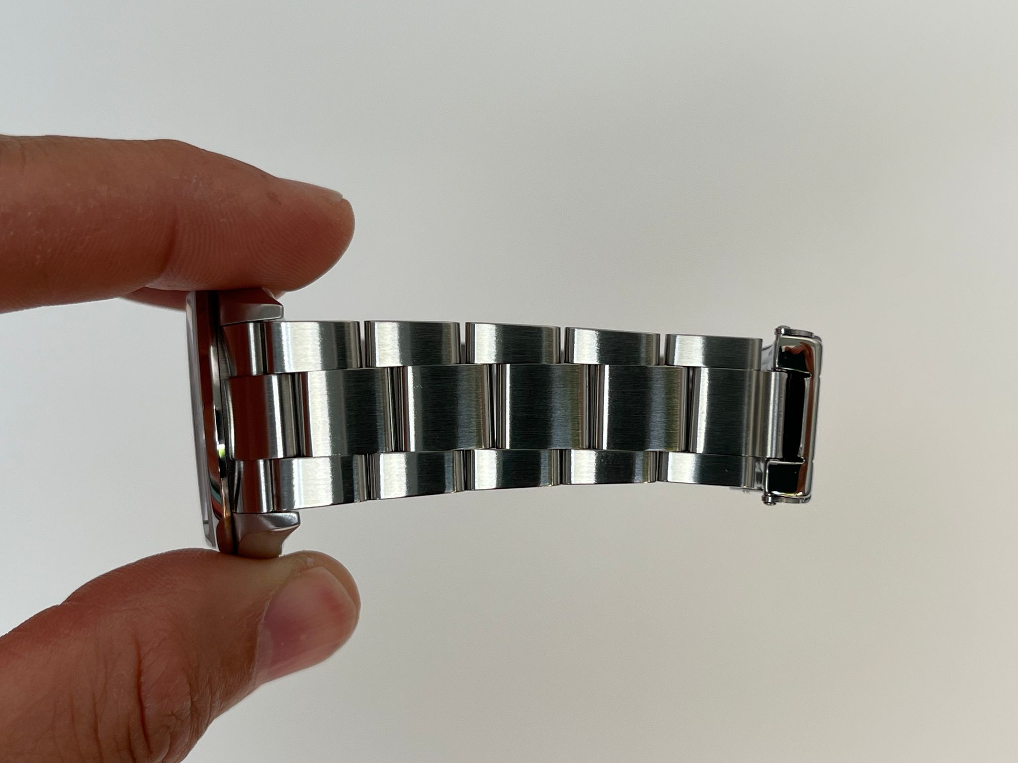 Today's example comes to us watch only and in excellent pre-owned condition. The no holes case is thick and even. The dial is mint and shows no wear. The solid end link bracelet has 12 total links and shows no stretch. This example is in retail ready condition!
