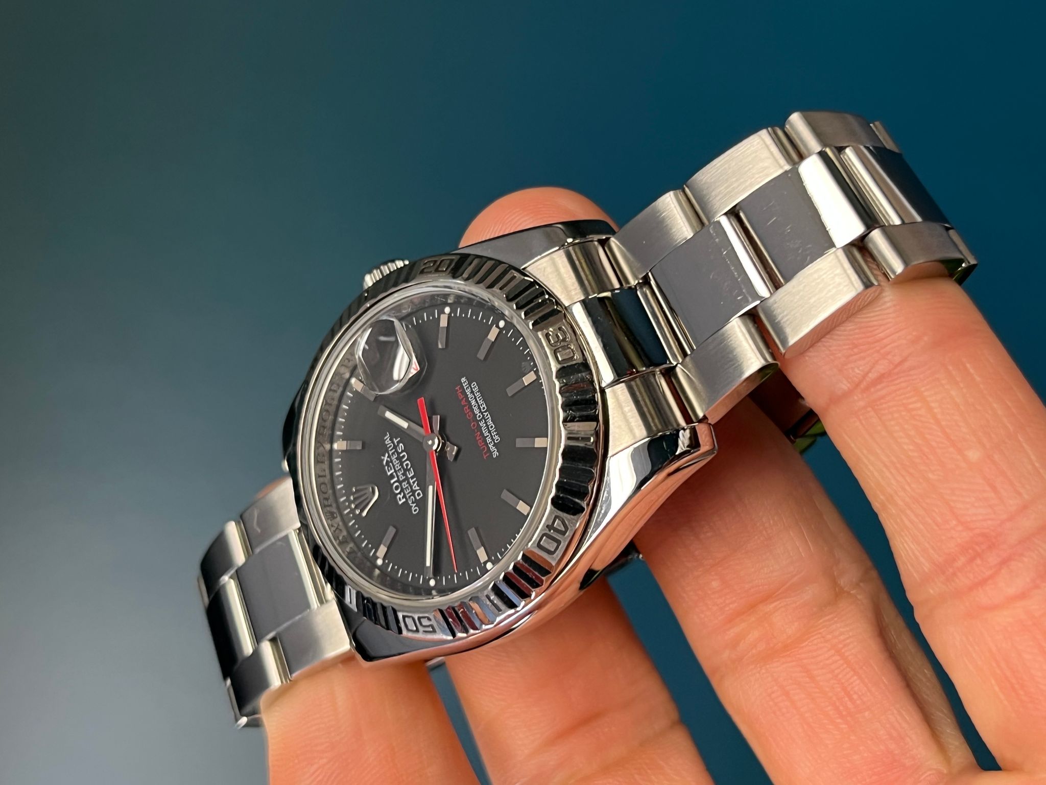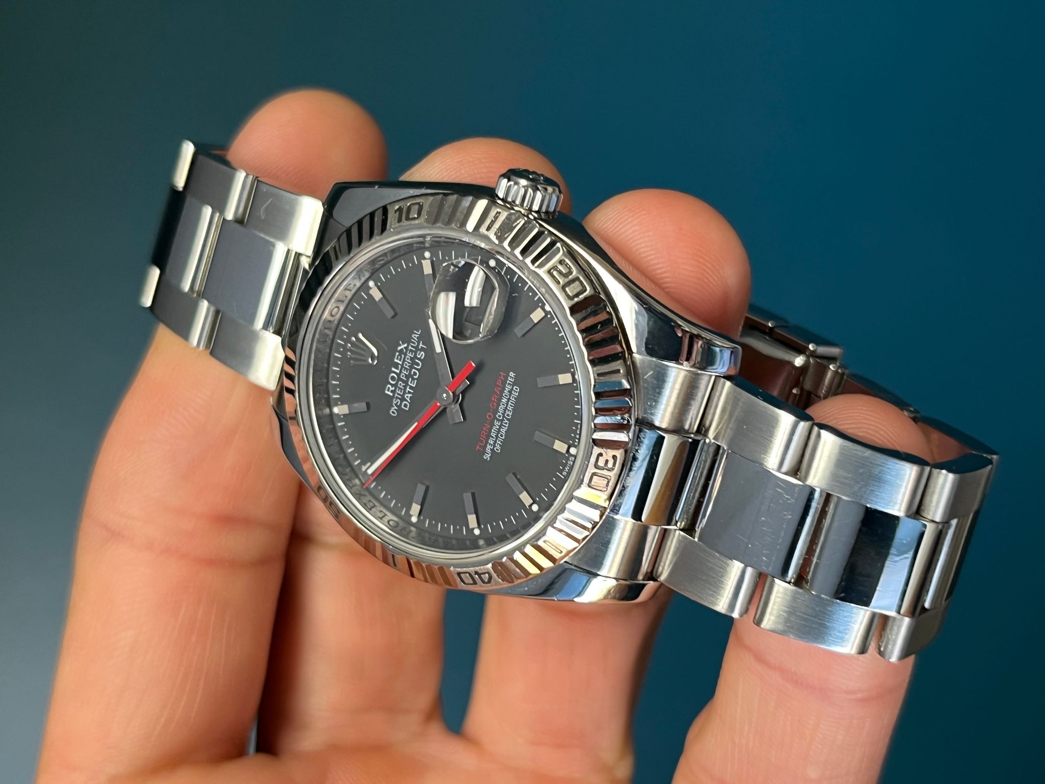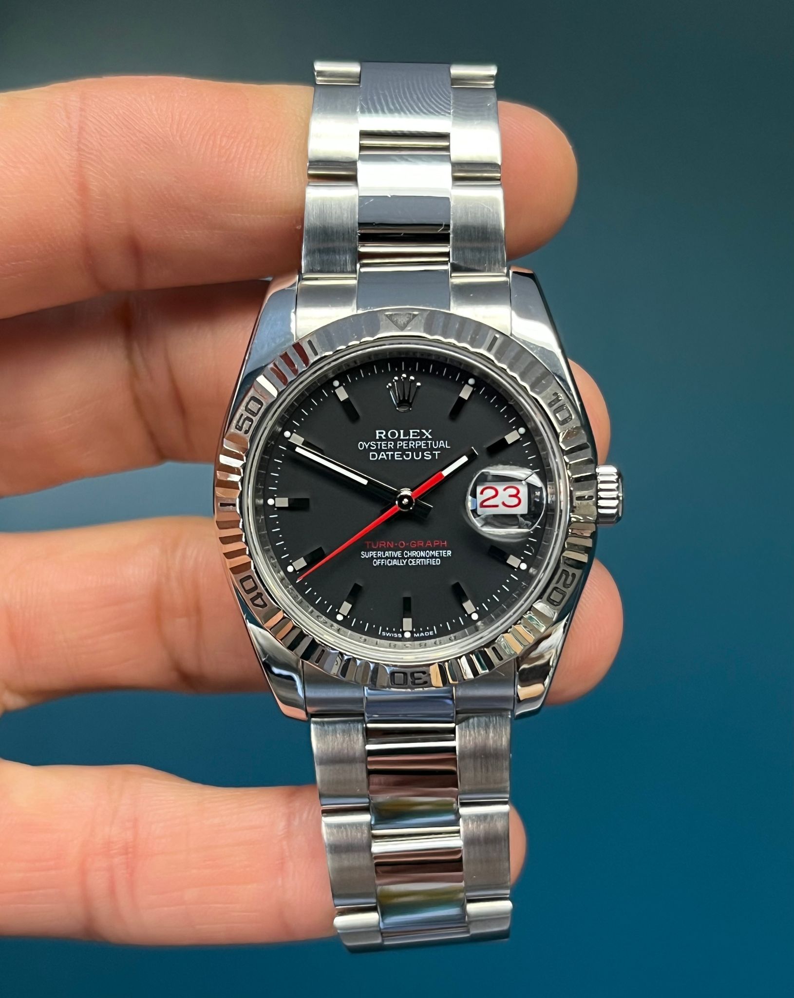 The Rolex Datejust Turn-O-Graph Reference 116264 is a distinctive and historically significant timepiece that bridges the gap between sport and sophistication. Crafted in stainless steel with an 18K white gold fluted rotating bezel, this model revives one of Rolex’s earliest tool watches—the original Turn-O-Graph, first introduced in the 1950s as a precursor to the Submariner and GMT-Master.