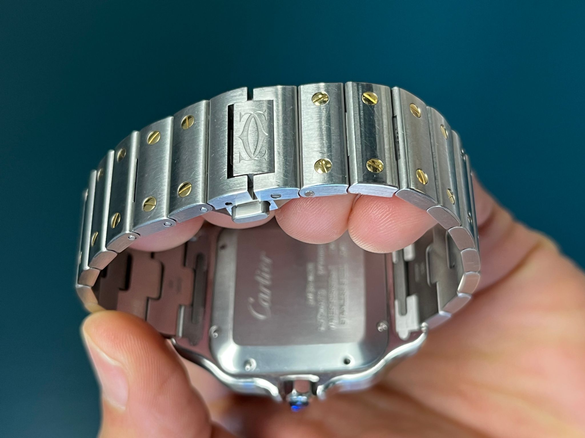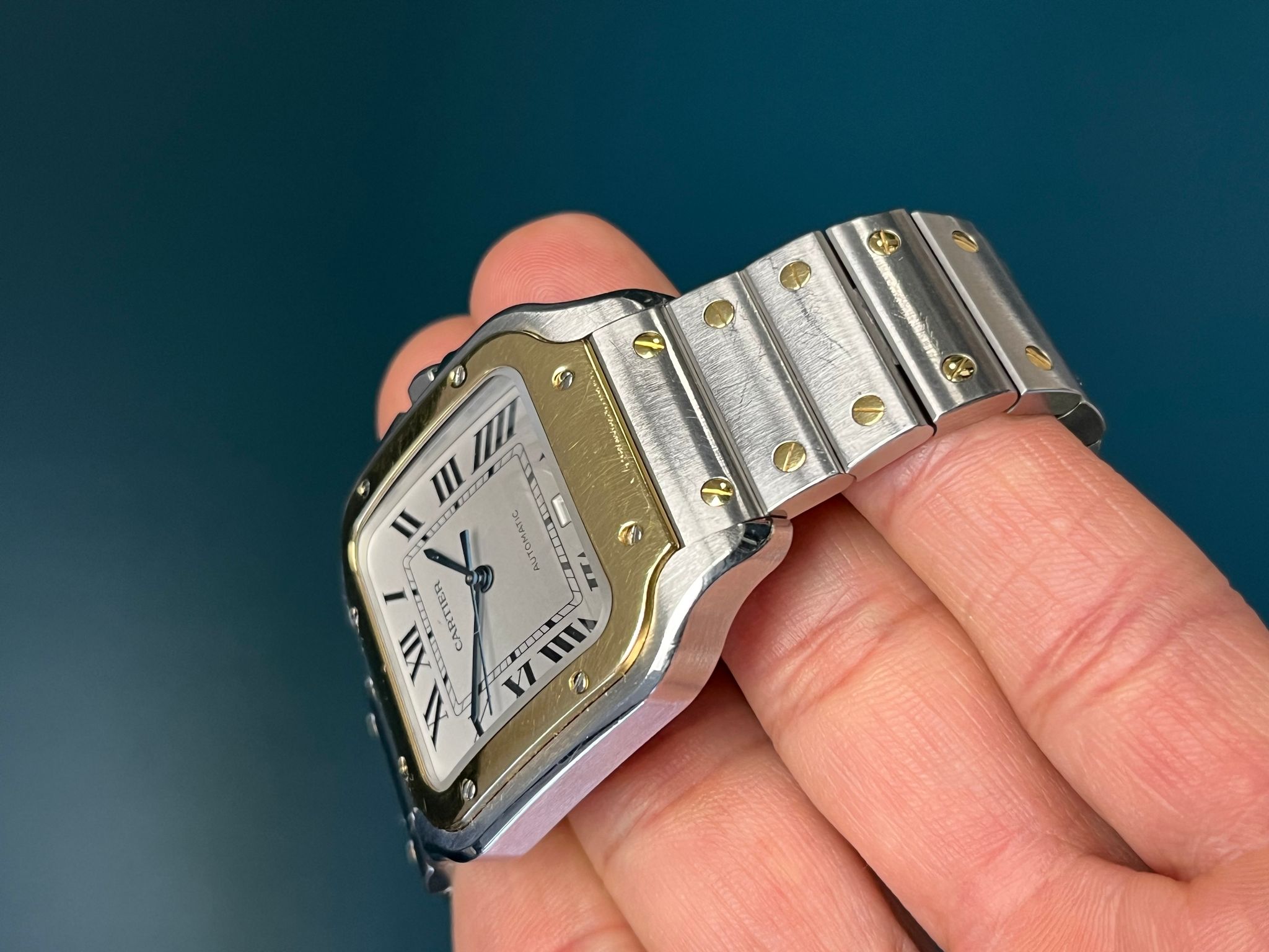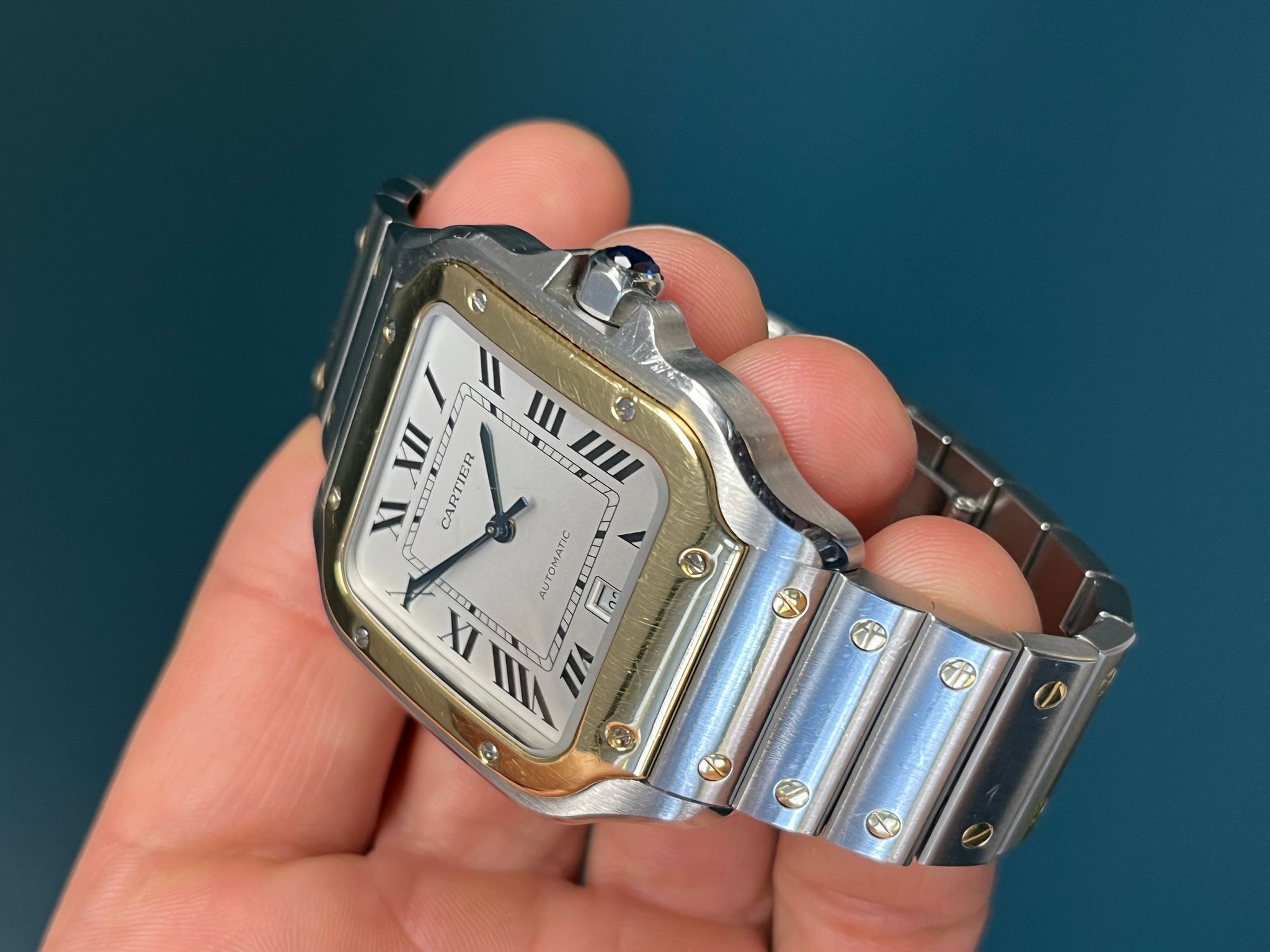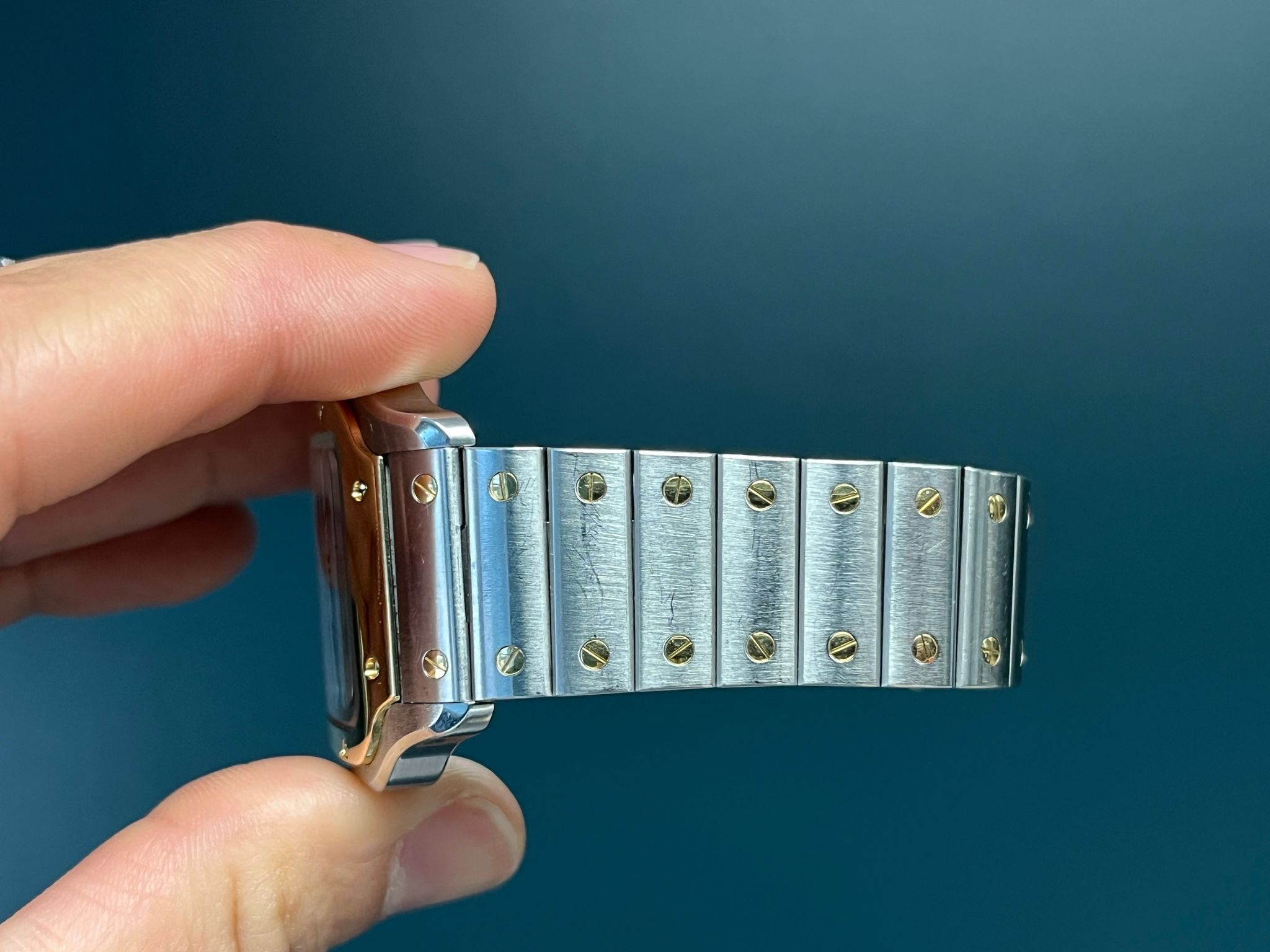 The Cartier Santos de Cartier Two-Tone Reference 4072 (W2SA0009) embodies the perfect balance of timeless design and modern refinement. Crafted in stainless steel and 18k yellow gold, this elegant interpretation of the legendary Santos showcases Cartier’s mastery in blending sportiness with sophistication. The Large-sized square case, featuring the signature exposed screws and polished bezel, pays homage to the original 1904 design created for aviator Alberto Santos-Dumont.